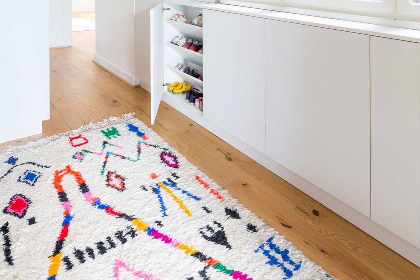 Für stark frequentierte Bereiche empfiehlt sich robustes Material wie Wolle. Farblich sollte der Teppich entweder einen Kontrast setzen oder harmonisch in das Raumkonzept eingebunden sein.