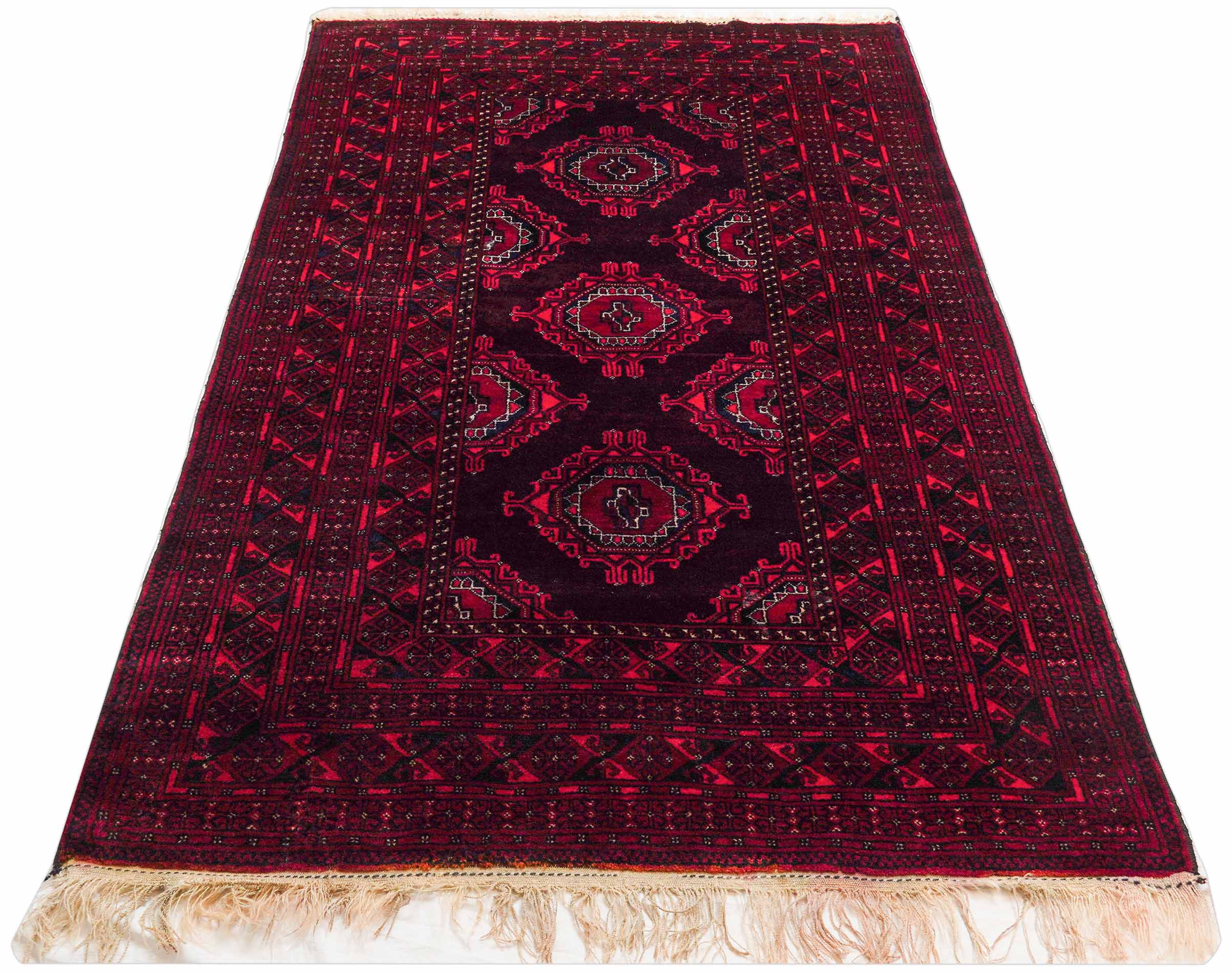 Stammesweber verwendeten natürliche Farbstoffe, um eine enorme Vielfalt an Rottönen zu erzeugen, die von tiefem Auberginenbraun bis zu warmem verbranntem Orange reichen. Diese leuchtenden Farben werden traditionell mit klaren Blau- und Elfenbeinakzenten kombiniert. Während die Stämme Afghanistans häufig Guls und gezackte Sterne verwenden, sind die dekorativen Bordüren und Endstücke die Bereiche, in denen Weber traditionell ein wenig von sich selbst und ihrer Kultur in das Design einfließen lassen. Dies gilt auch für die dekorativen Teppiche aus Buchara, bei denen durchgemusterte Gul-Motive weit verbreitet sind.