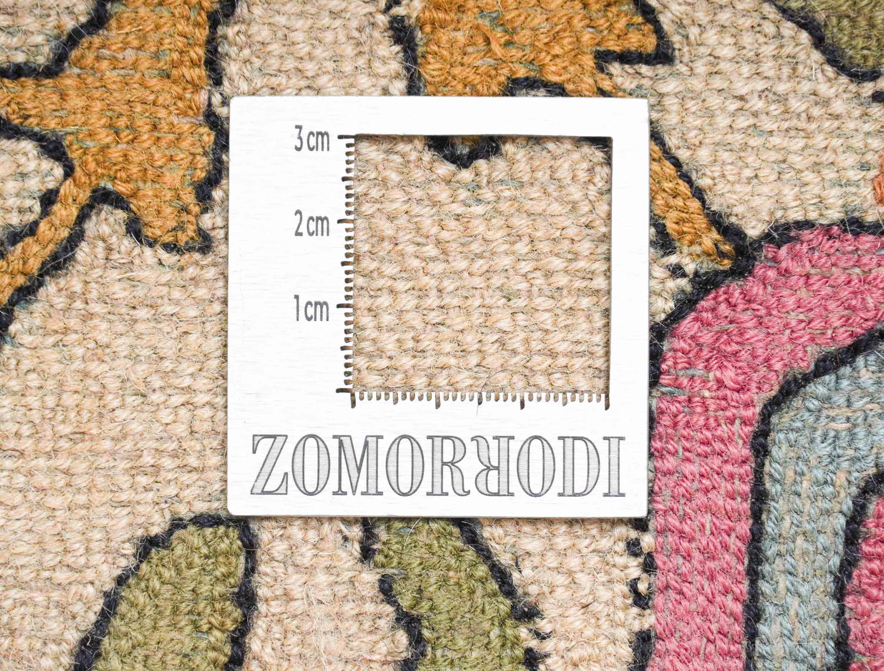 Der Hintergrund dieses Tetex Teppichs ist Beige. Im Gesamteindruck leuchtet der Teppich in bunten Farben. Der Rand ist in den Farben Dunkelblau, Olivgrün und bunten Farben gestaltet.