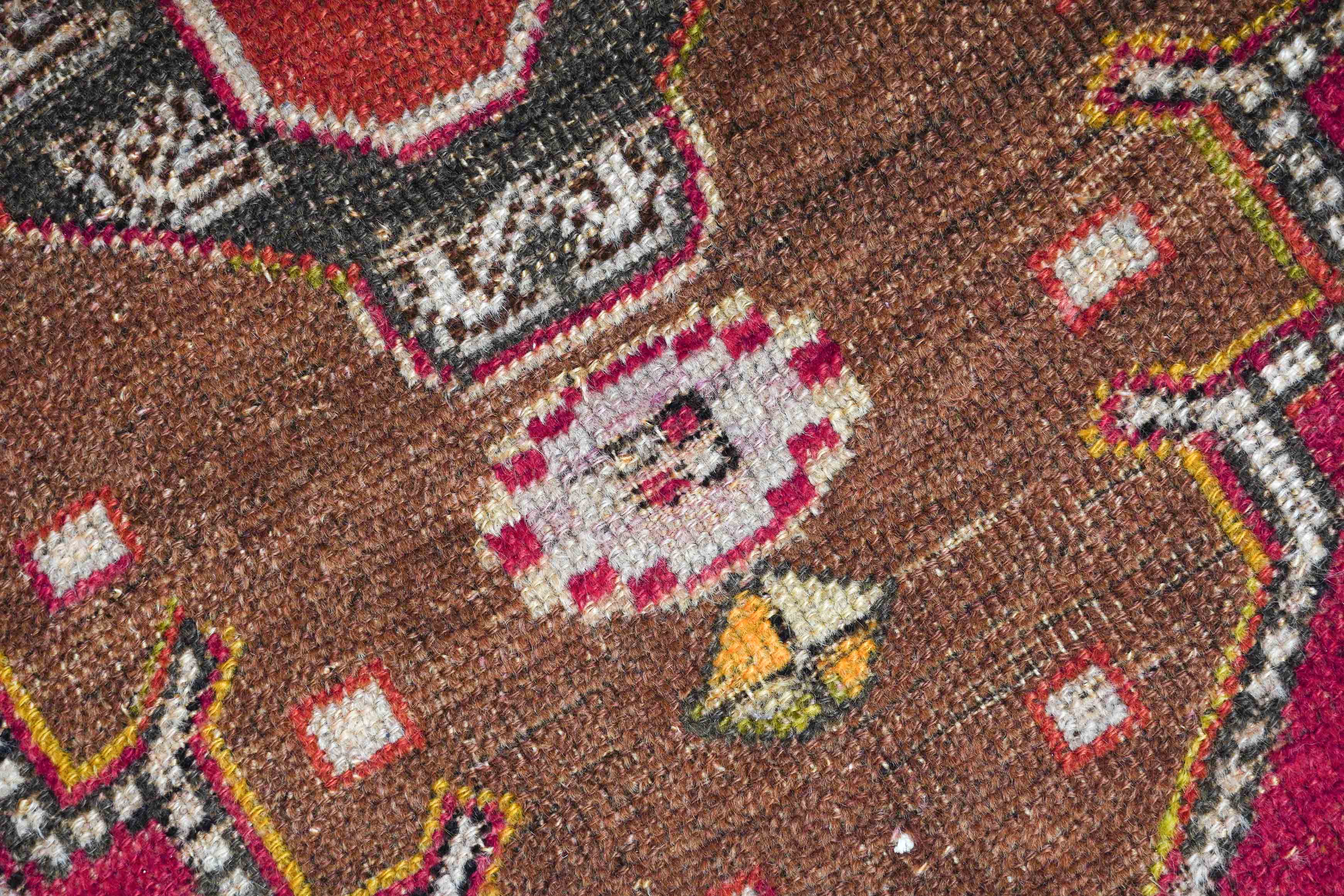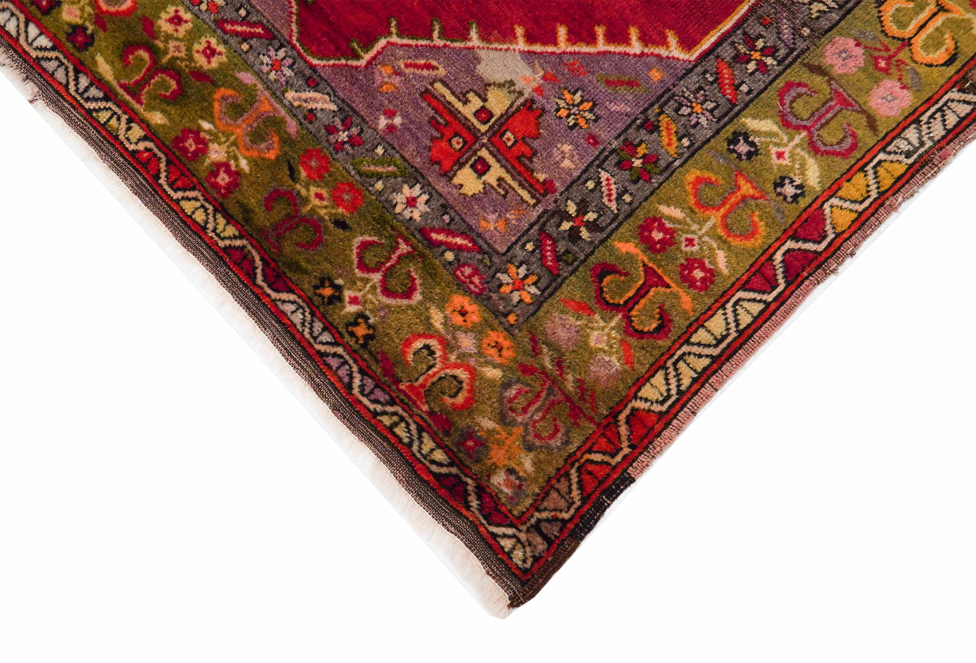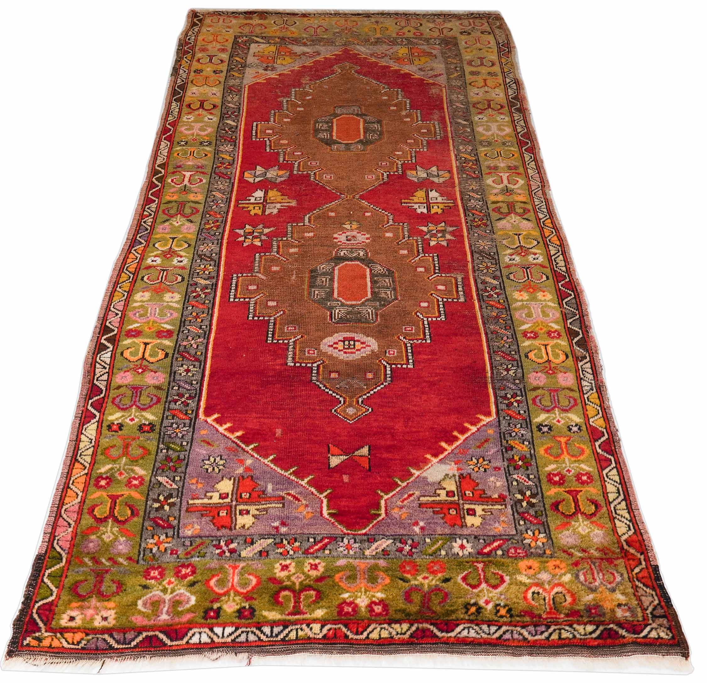 Der Hintergrund dieses Türkischer Orientteppichs ist Hellrot. Der Rand ist in den Farben Olivgrün, Hellgrau und bunten Farben gestaltet.