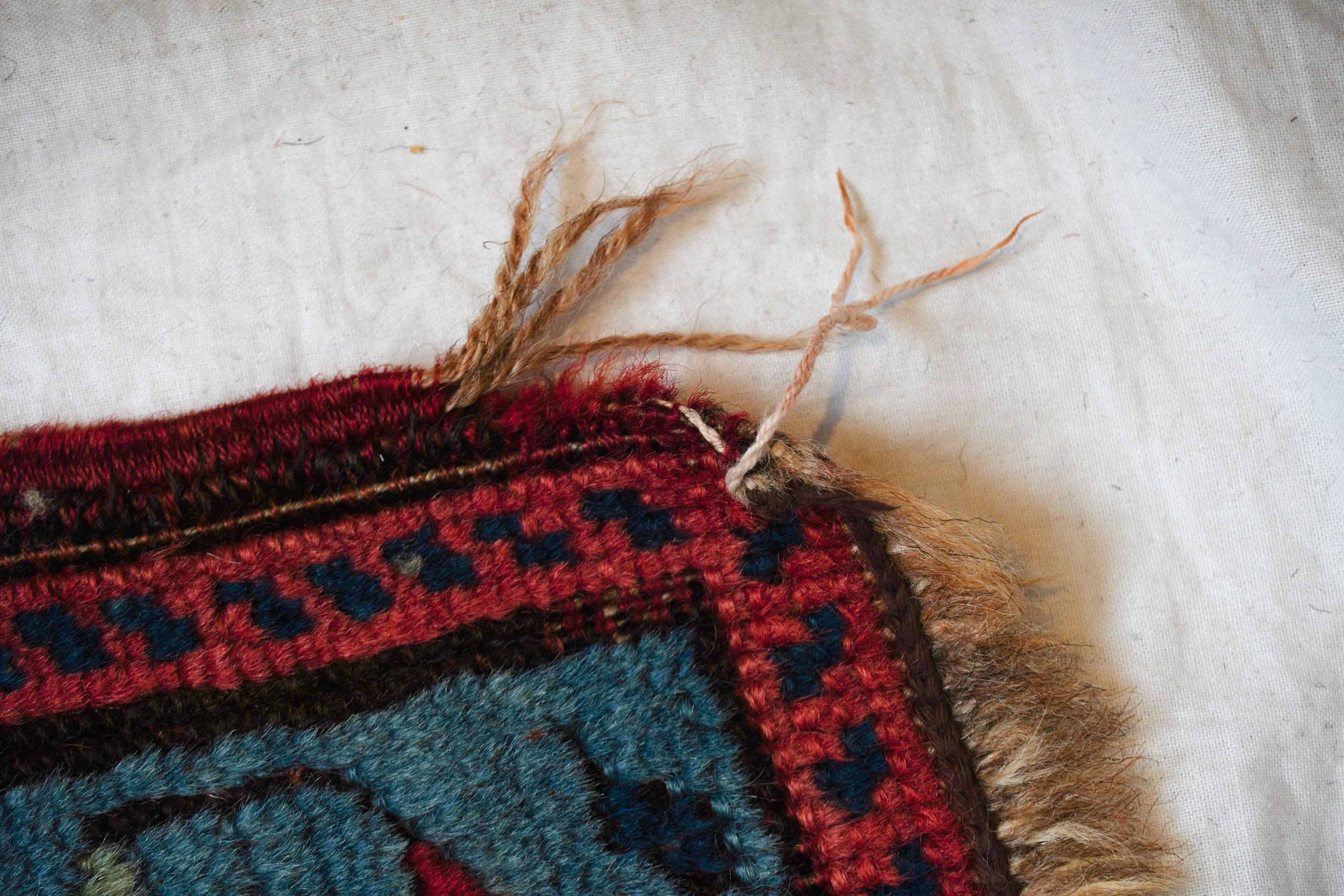 Dieser Gharabagh hat eine Geschichte. Die Kanten sind teilweise defekt. Der Flor ist stellenweise abgetreten. Er wurde ca. 1895 handgeknüpft. Wir haben ihn gründlich gereinigt und liebevoll restauriert. Er ist daher – trotz seines Alters – in einem sehr guten Zustand.