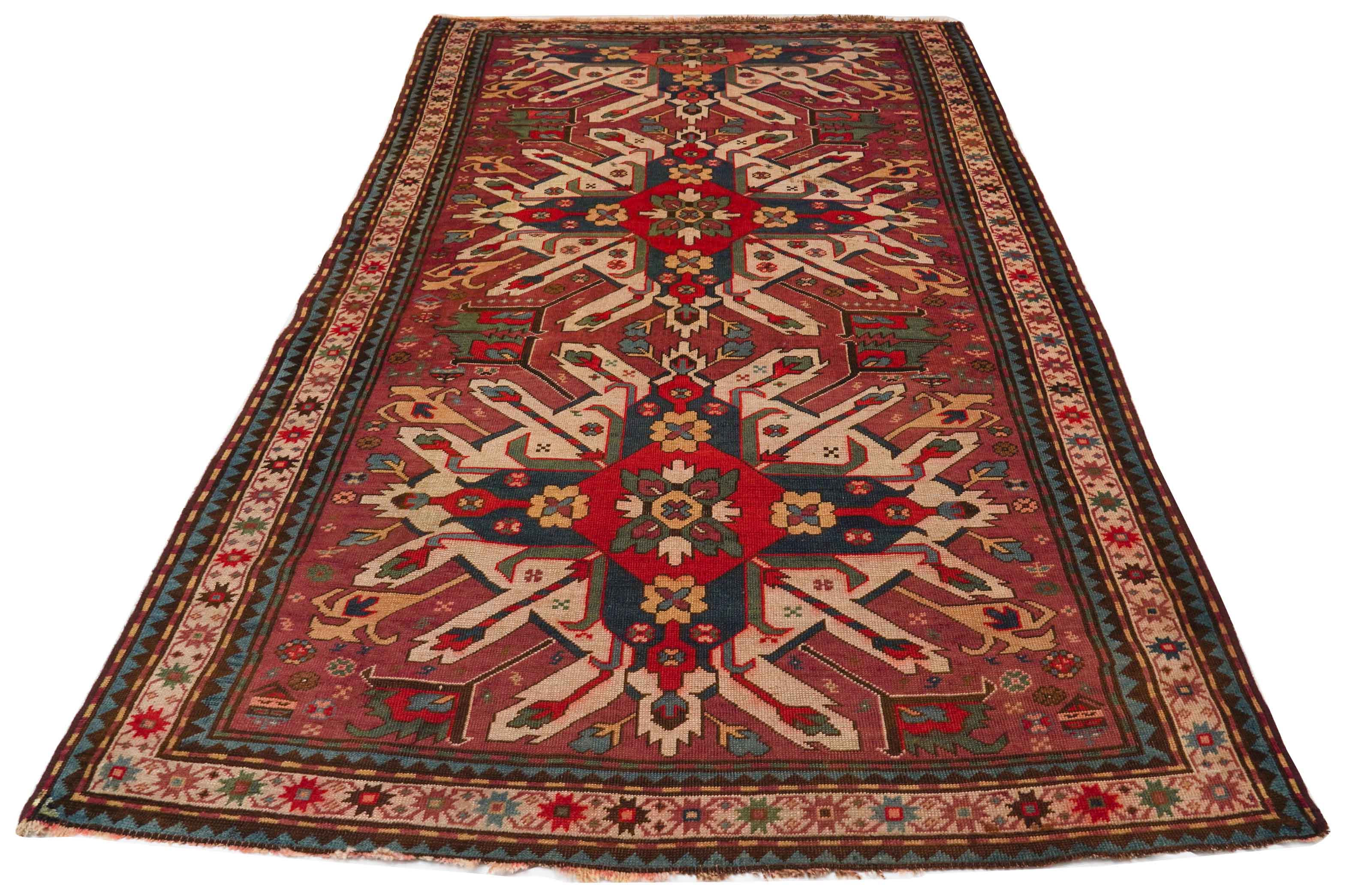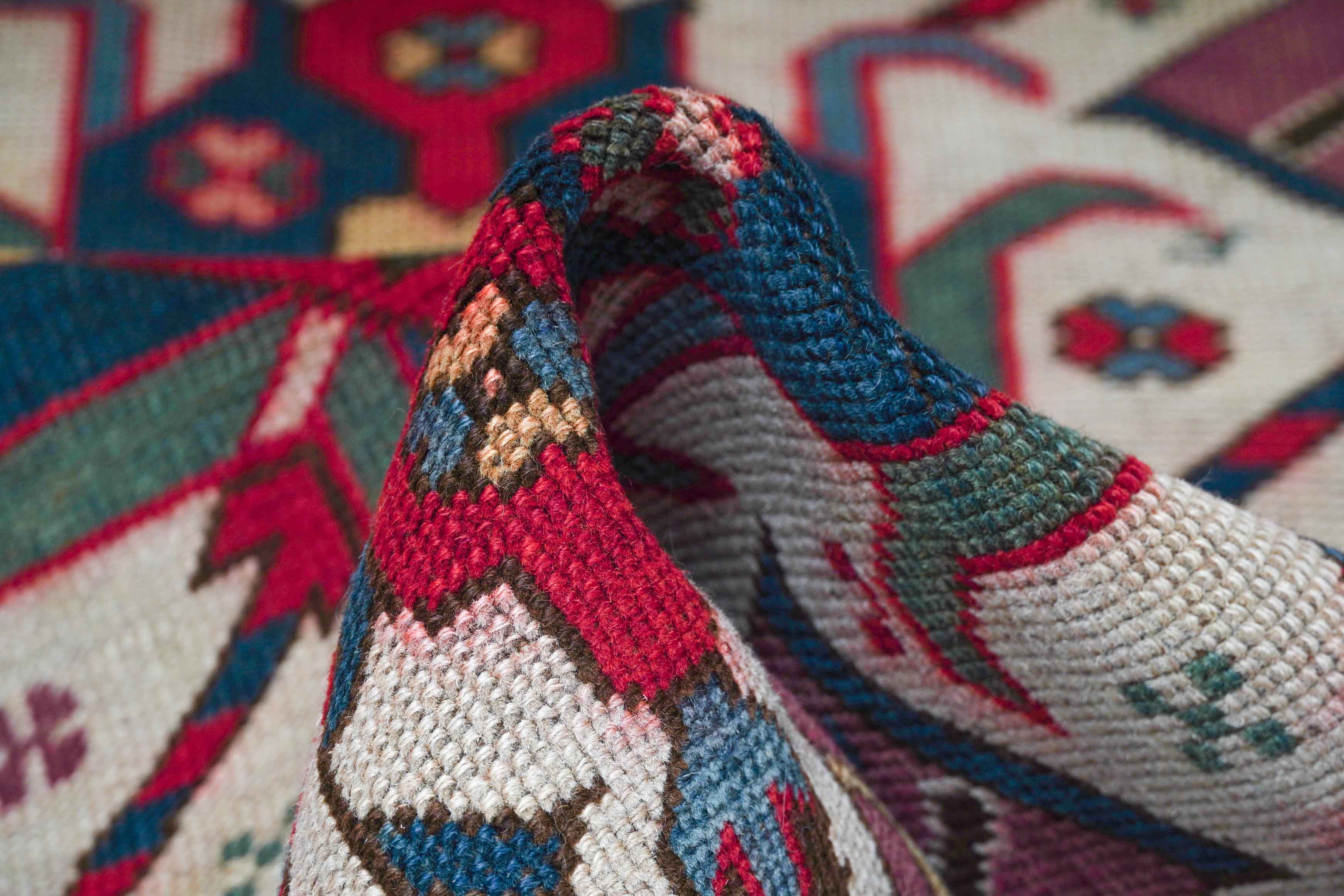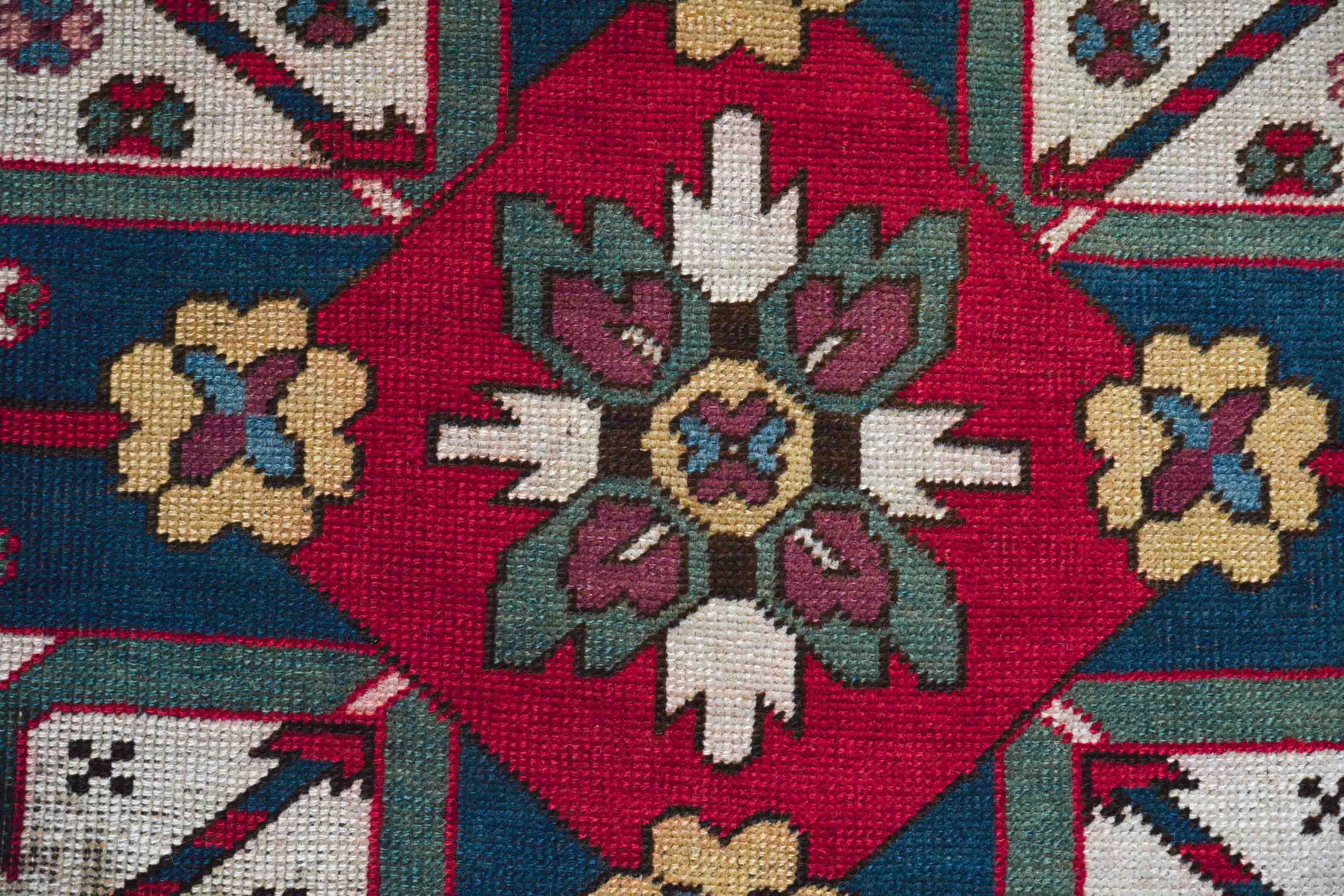 Die Kazak (auch Kasak) Teppiche gehören zur Gruppe der kaukasischen Teppiche. Im Kaukasus werden seit Ende des 18. Jahrhunderts Teppiche hergestellt. Charakteristisch sind die abstrakten geometrischen Stammes-Muster in Primärfarben. Typischerweise werden die geometrischen und seltener auch floralen Motive in kontrastreichen, intensiven Farben dargestellt. Im 19. Jahrhundert wurde ein beträchtlicher Teil der überwiegend in Dörfern produzierten Teppiche unter russischer Kontrolle in den Westen exportiert. Dieser antike Kazak ist ein Sammlerstück. Er ist rund 100 Jahre alt und schon deswegen ein wirklich besonderes Stück. Antike Teppiche, wie dieser Kazak, erfreuen sich nach wie vor großer Beliebtheit und werden zu Höchstpreisen von renommierten Auktionshäusern versteigert.