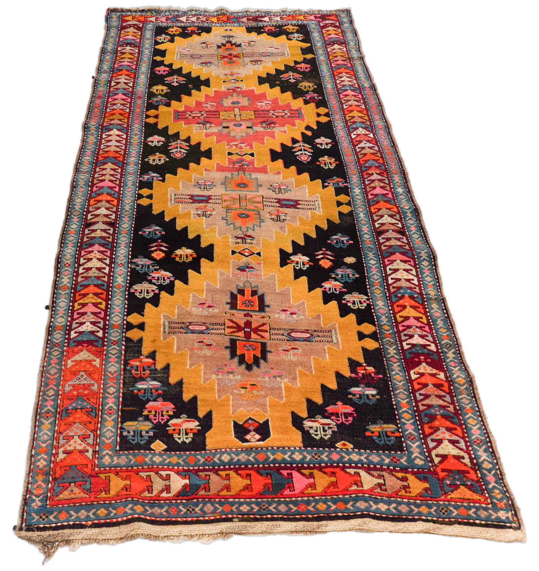 Melierter antiker Meschkin Läufer, gelb mit Bordüre und Rauten