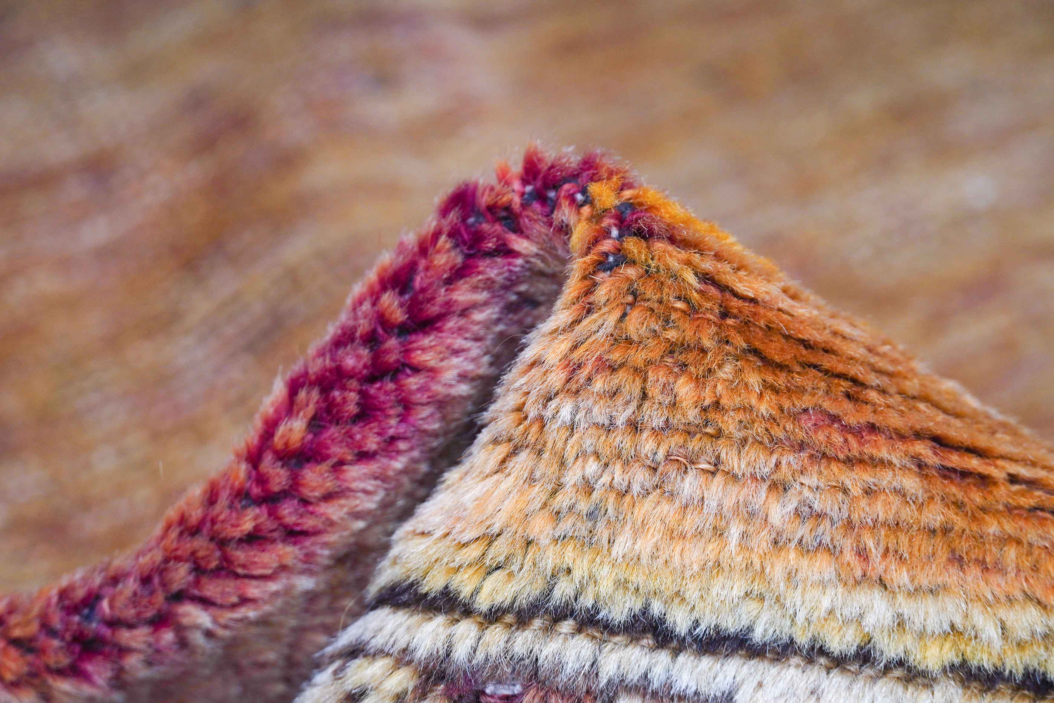 Die Oberfläche dieses Türkischer Orientteppichs wirkt meliert. Die Farbtonänderungen und Hell-Dunkel-Schattierungen des Florgarns lassen die Farben schimmern und machen den Teppich unempfindlich gegenüber Verschmutzungen. Der Teppich wirkt wegen diesen sogenannten Farbsprünge Abrasch lebendiger. Die Melierung entsteht, weil die Wolle dieses Türkischer Orientteppich handgesponnenen wurde. Beim Einfärben werden die natürlichen Farbstoffe unterschiedlich aufgenommen.