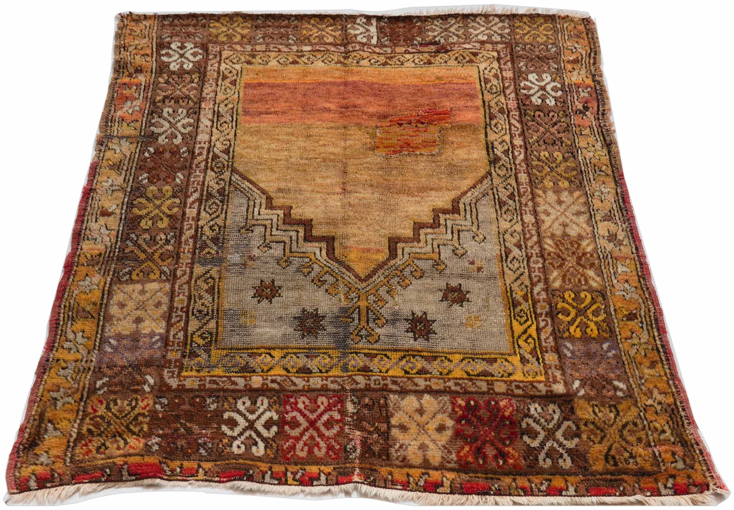 Diesen Türkischer Orientteppich ziert das sogenannte Mehrab oder Mihrab Motiv. Mehrab bezeichnet die islamische Gebetsnische in Moscheen, die die Gebetsrichtung qibla also die Richtung Mekkas anzeigt. Traditionell werden Teppiche mit dem Mehrab Motiv von Muslimen zum Beten verwendet und sind daher besonders kostbar.