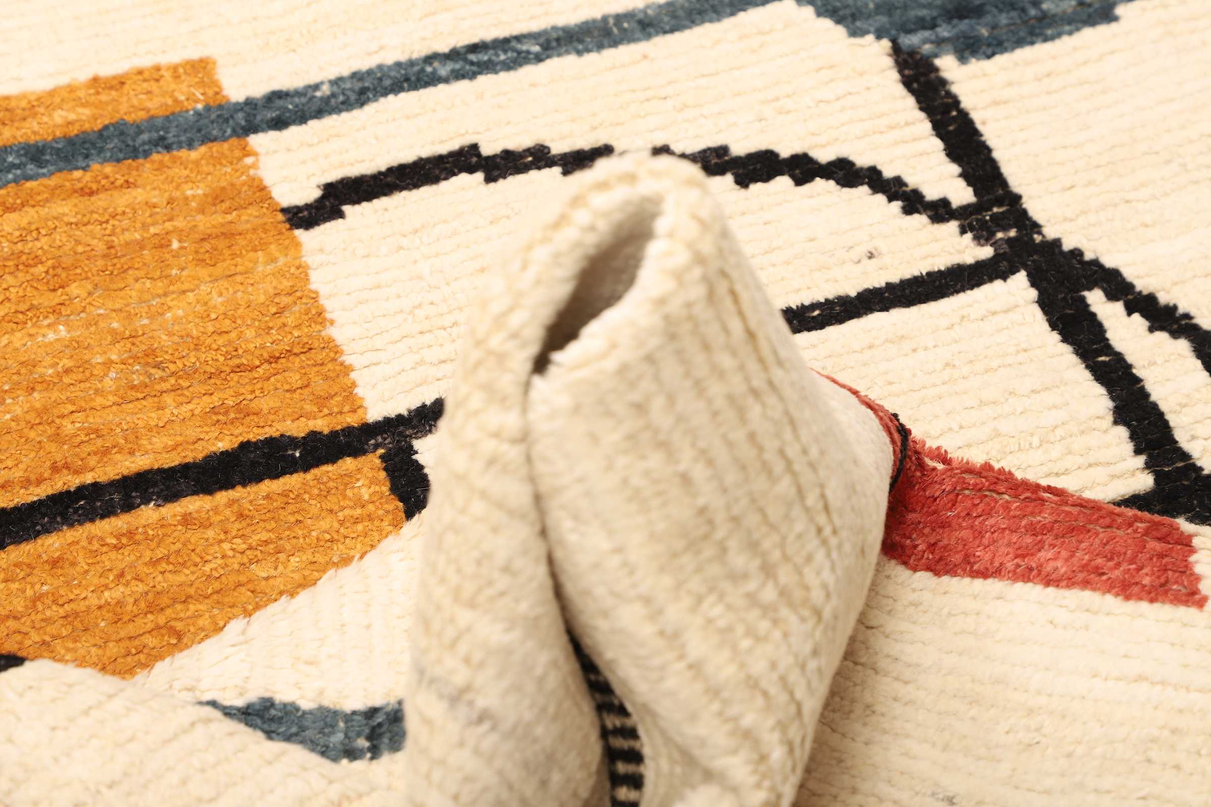 Dieser handgeknüpfte Berber Teppich hat einen dichten, relativ hohen Flor. Das macht ihn sehr gemütlich und strapazierfähig. Traditionell wurden Berber Teppiche – ebenso wie die Lori oder Gabbeh Teppiche – zum Schlafen benutzt. Sie laden zum sitzen und herumfläzen im Wohnzimmer ein, sind aber auch hervorragend für Durchgangsbereiche und im Essbereich geeignet. Die Kett- und Schussgarne dieses Berber Teppichs besteht aus Baumwolle, der Flor besteht die mit Naturfarben gefärbt und handgesponnen wird. Die handgesponnene Wolle verleiht den Loris ihre weiche Oberfläche. Die Schuss- und Kettfäden dieses Beni Berbers bestehen aus Baumwolle. Das vielseitige Material ist reißfest und dehnbar und daher besonders geeignet für ein strapazierfähiges Untergewebe.