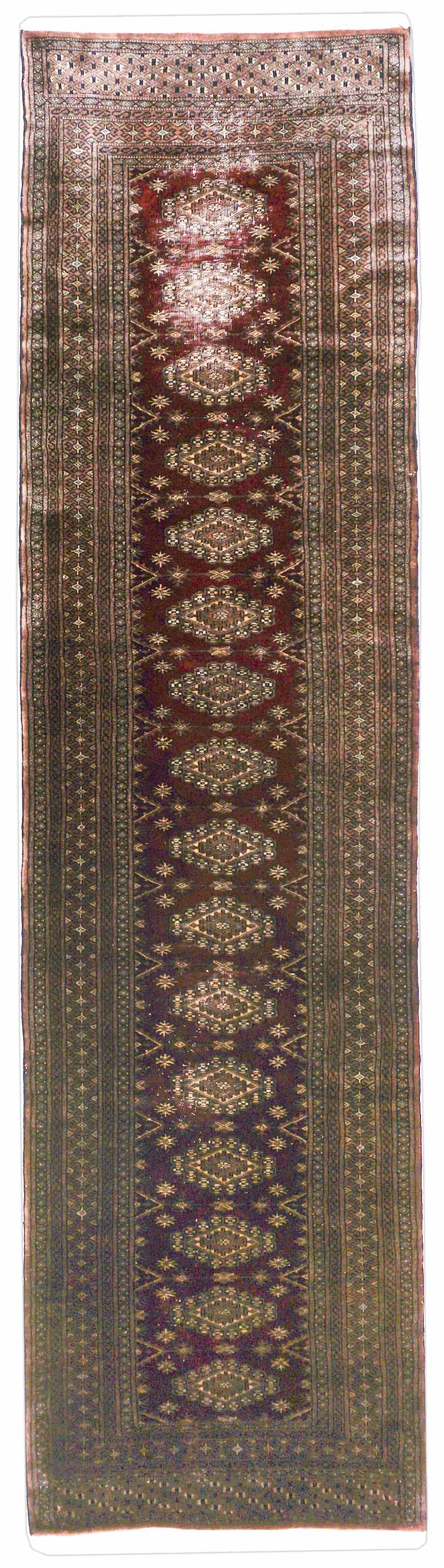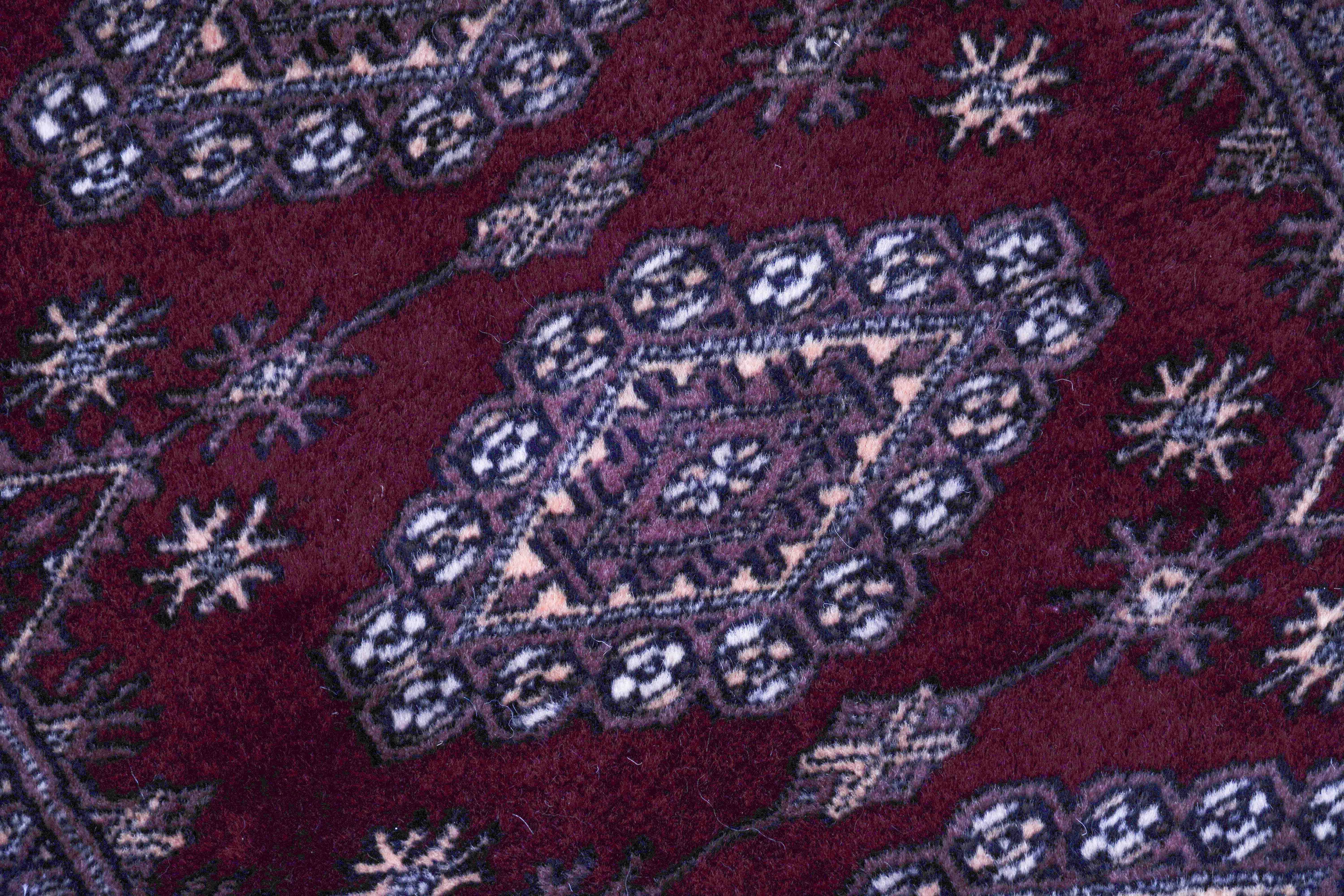 Weil Buchara Teppiche zu den feinsten und beliebtesten zentralasiatischen Teppichen gehören, haben ihre Muster auch die Knüpfer in Pakistan inspiriert. So kommt es, dass dieser Teppich mit dem typischen, usbekischen Buchara Muster in Pakistan geknüpft wurde.