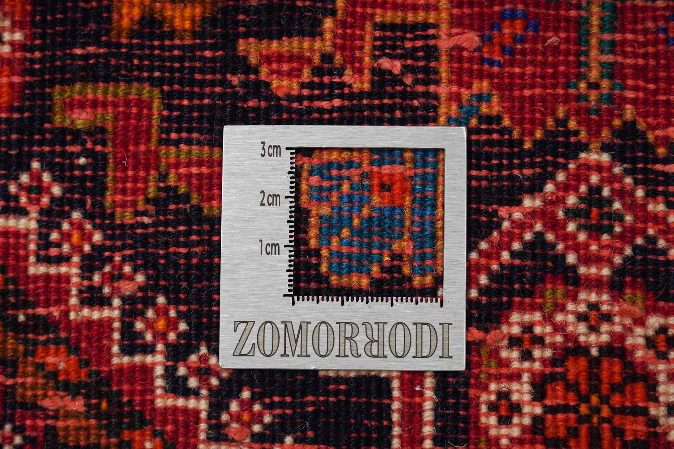 Der Hintergrund dieses Ghashghais ist Dunkelrot. Der Rand ist in den Farben Dunkelblau und Dunkelrot gestaltet. Im Zentrum sind die Farben Dunkelblau und Dunkelrot kombiniert.
