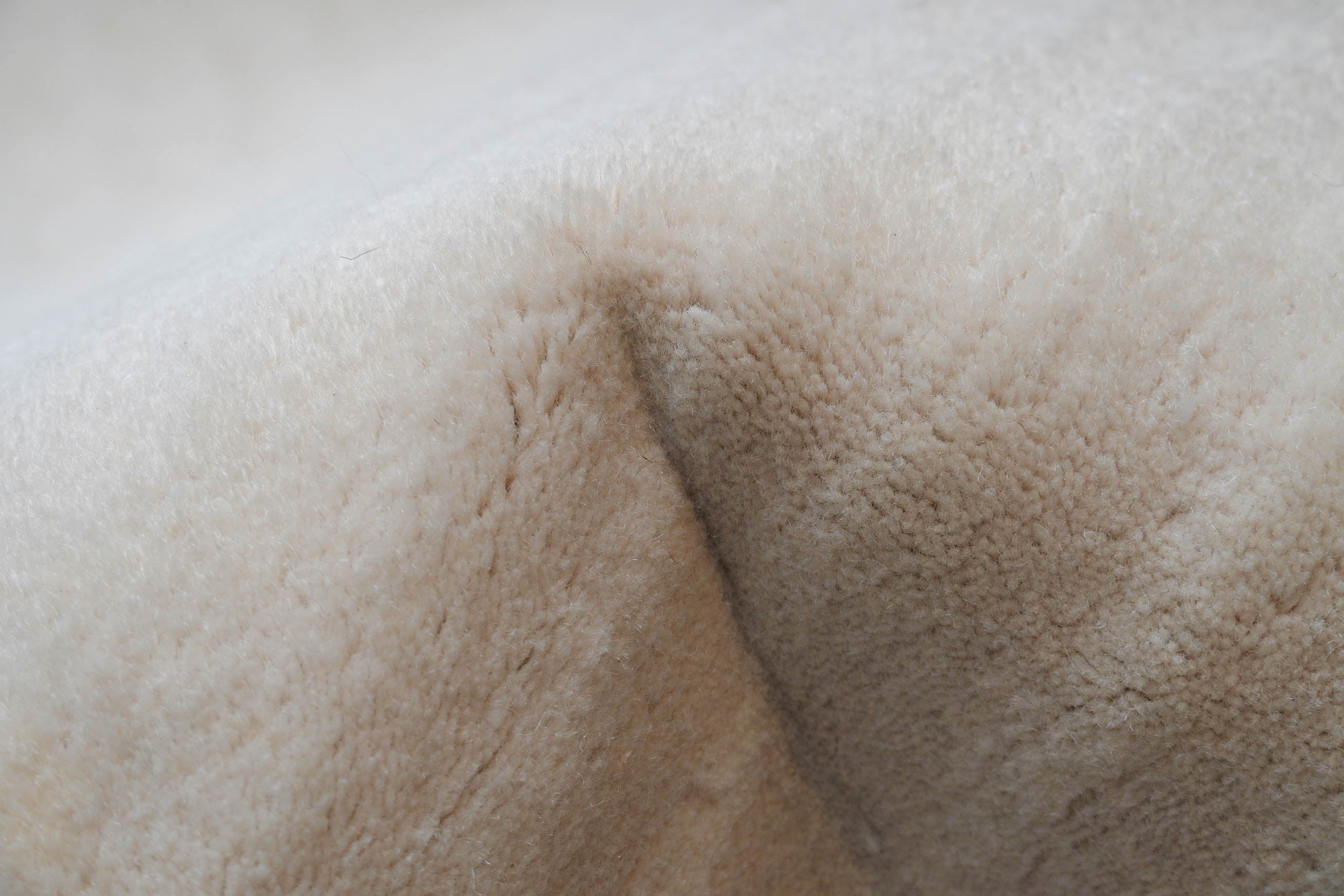 Der Flor ist einfarbig in Beige gehalten. Die schlichte Gestaltung ist zurückhaltend, kann aber auch einen tollen gestalterischen Akzent setzen. Das monochrome Erscheinungsbild dieses Teppichs fügt sich hervorragend in jedes Umfeld ein.