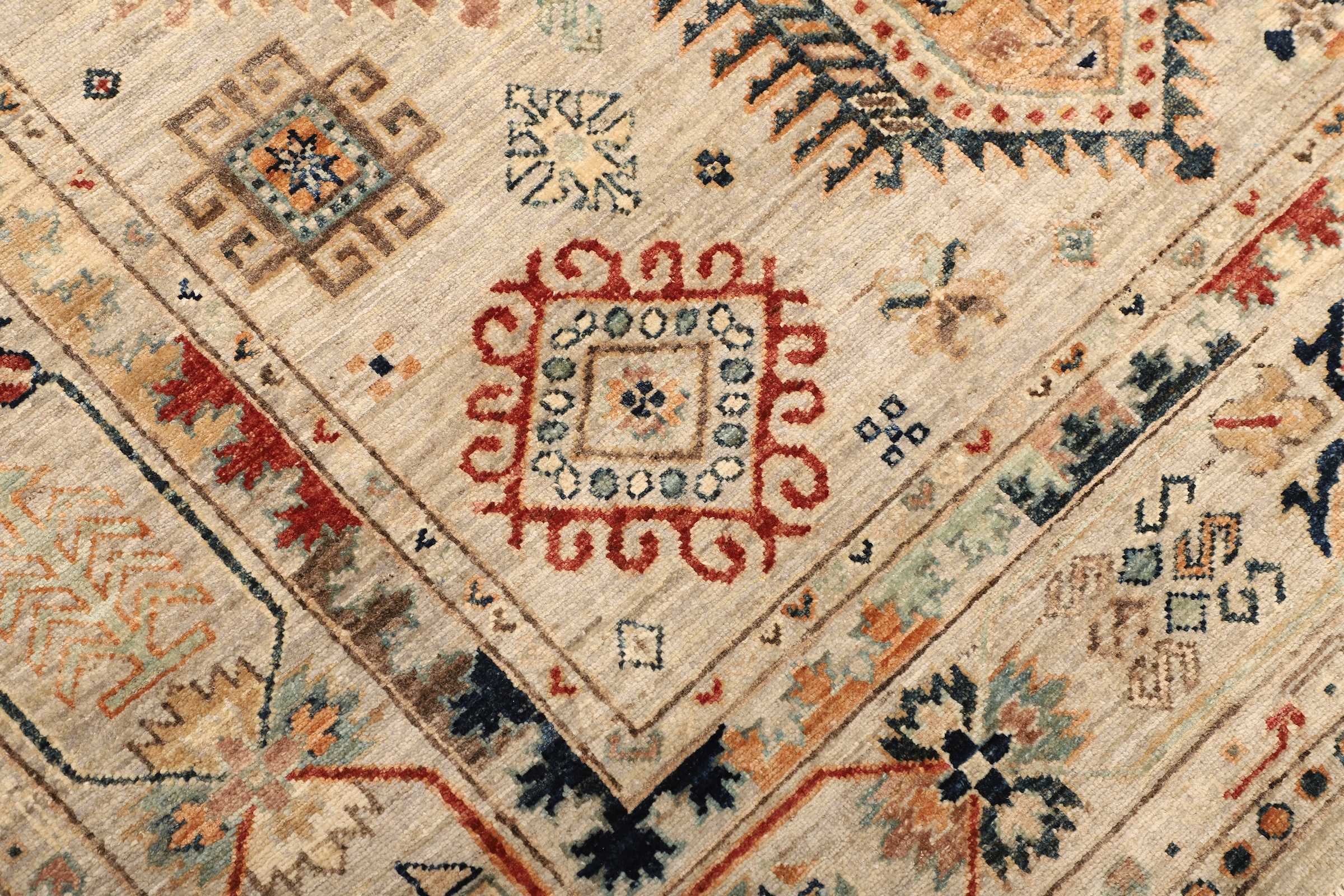 Dieser Kazak Teppich wurde nach einem traditionellen Verfahren aus handgesponnener Wolle und Naturfarben in Pakistan handgeknüpft.
