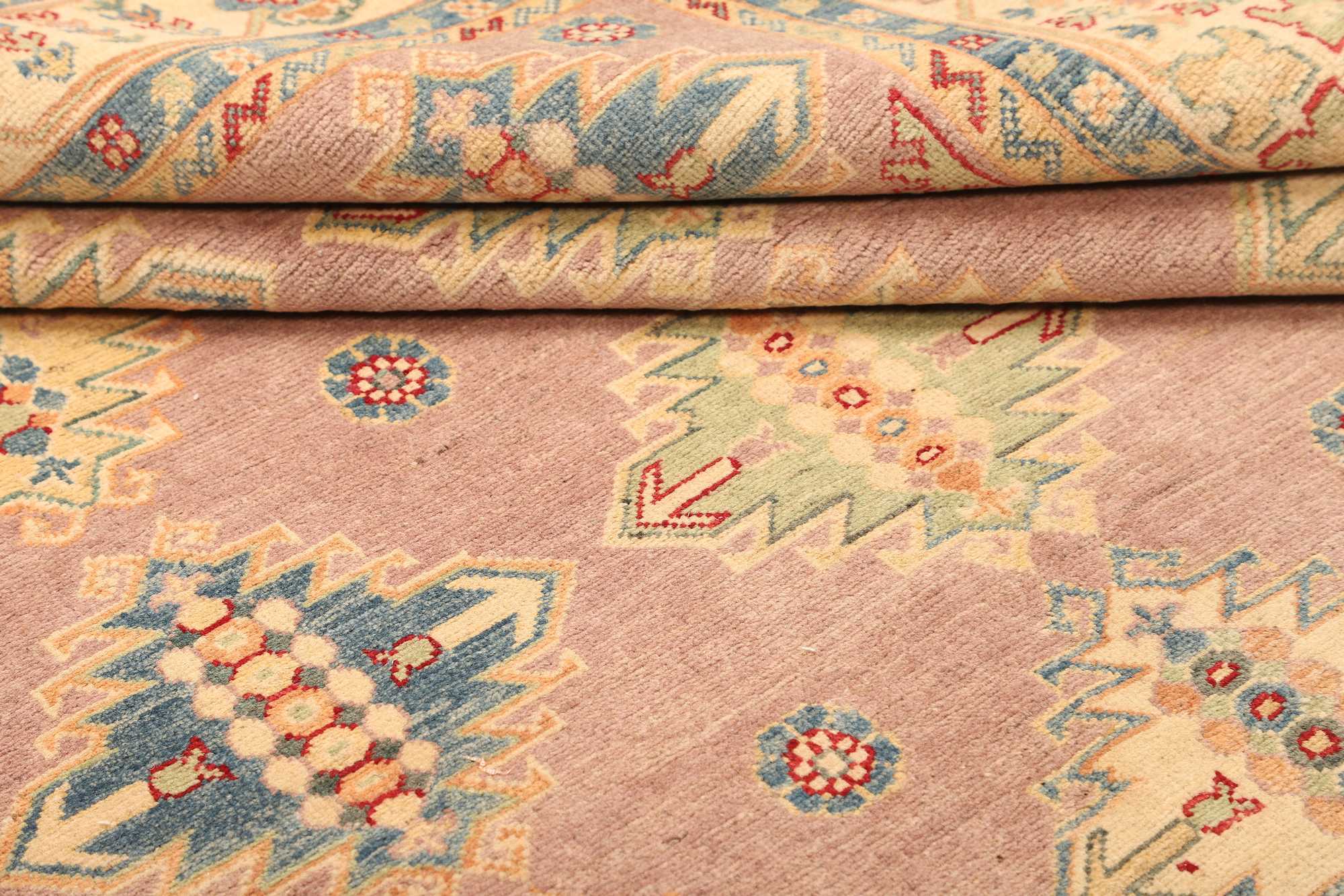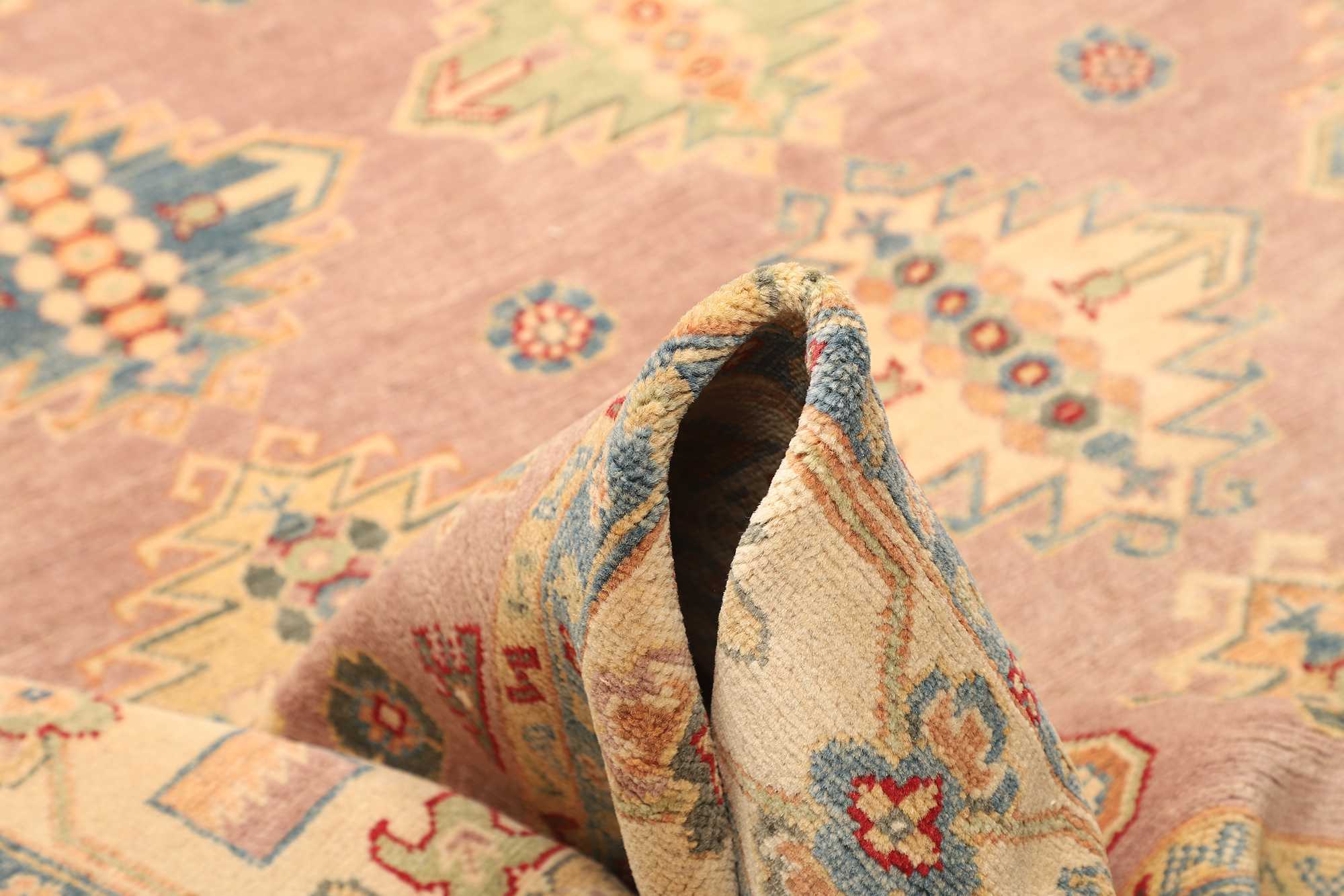 Der Flor dieses Kazaks wurde aus hochwertiger Schurwolle handgeknüpft. Schurwolle wird durch das schonende Scheren von Schafen gewonnen. Schurwolle ist ein nachwachsender, natürlicher Rohstoff mit einer Reihe beeindruckender Eigenschaften: Durch den natürlichen Fettgehalt der Wolle stößt die Oberfläche Wassertropfen ab und ist so auf natürliche Weise gegen Schmutz imprägniert. Wolle bietet außerdem eine hervorragende Wärmeisolation, wirkt regulierend auf das Wohnklima und dämpft den Schall.