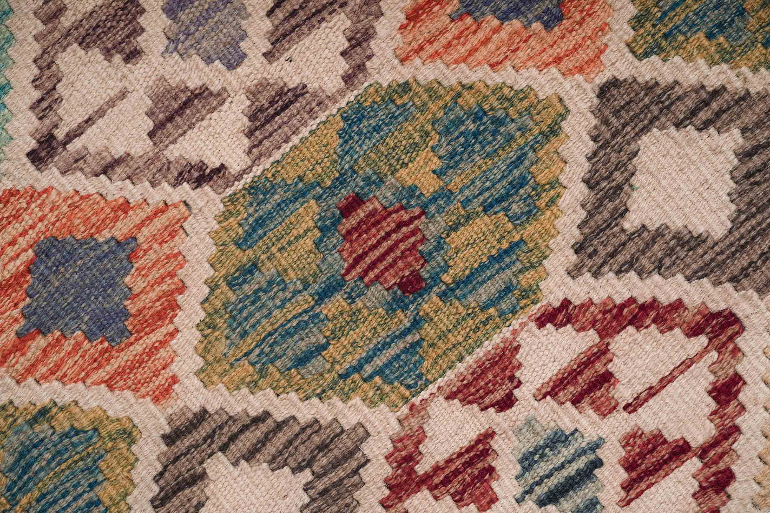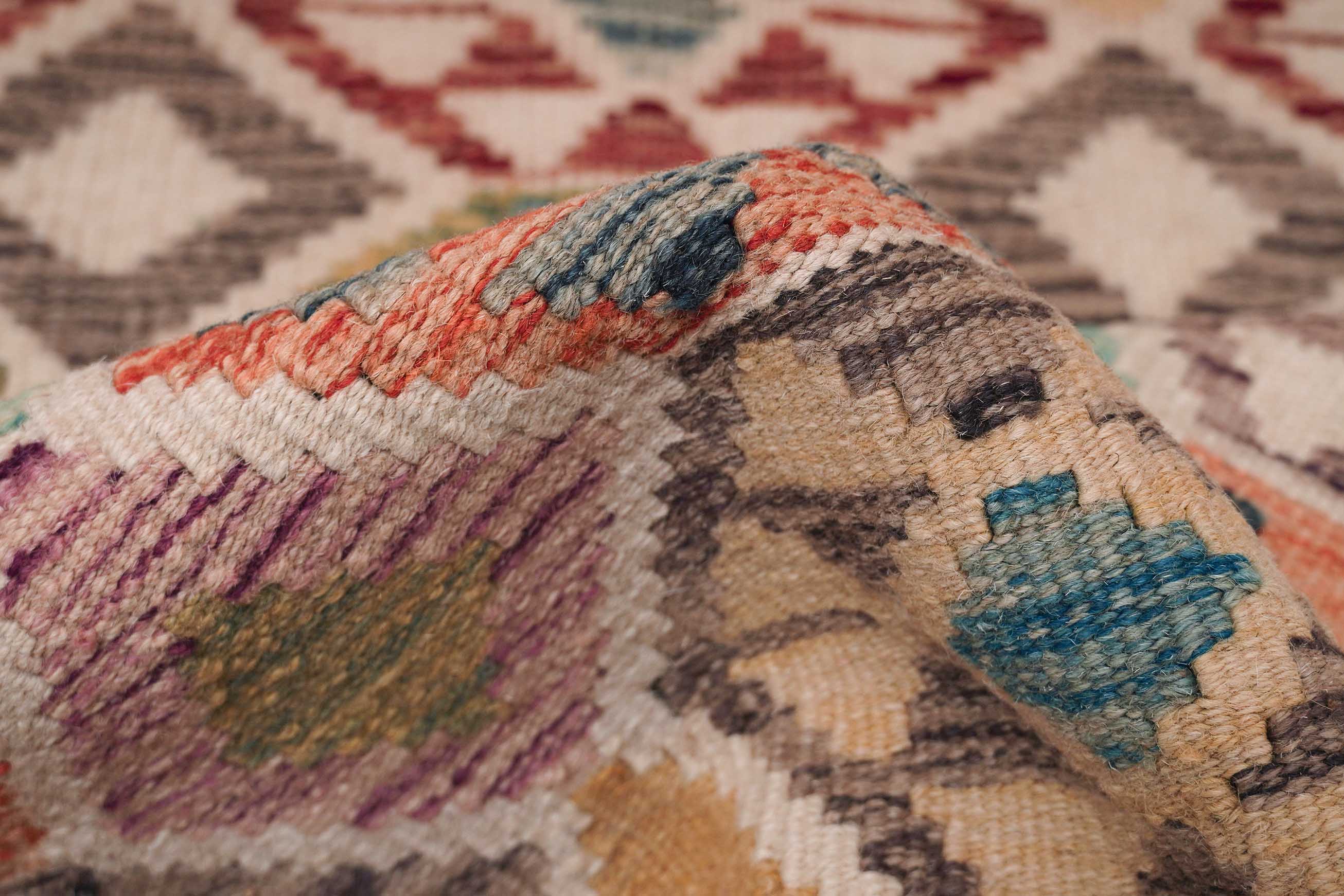 Die Schuss-Fäden dieses Kelim Teppichs bestehen aus handgesponnener, mit Pflanzenfarben gefärbter Schafwolle. Vor dem Weben des Teppichs wurden dafür zunächst Schafe geschoren und die Wolle anschließend gereinigt, gekämmt und schließlich gesponnen. Nach dem Spinnen wird die Wolle der Kelim Teppiche in einem aufwendigen Prozess mit Naturfarben gefärbt. Der Flor der Kelim Teppiche wirkt wegen dieses traditionellen Verfahrens trocken und leicht pelzig. Die Kett-Fäden dieses Kelims bestehen aus Wolle.