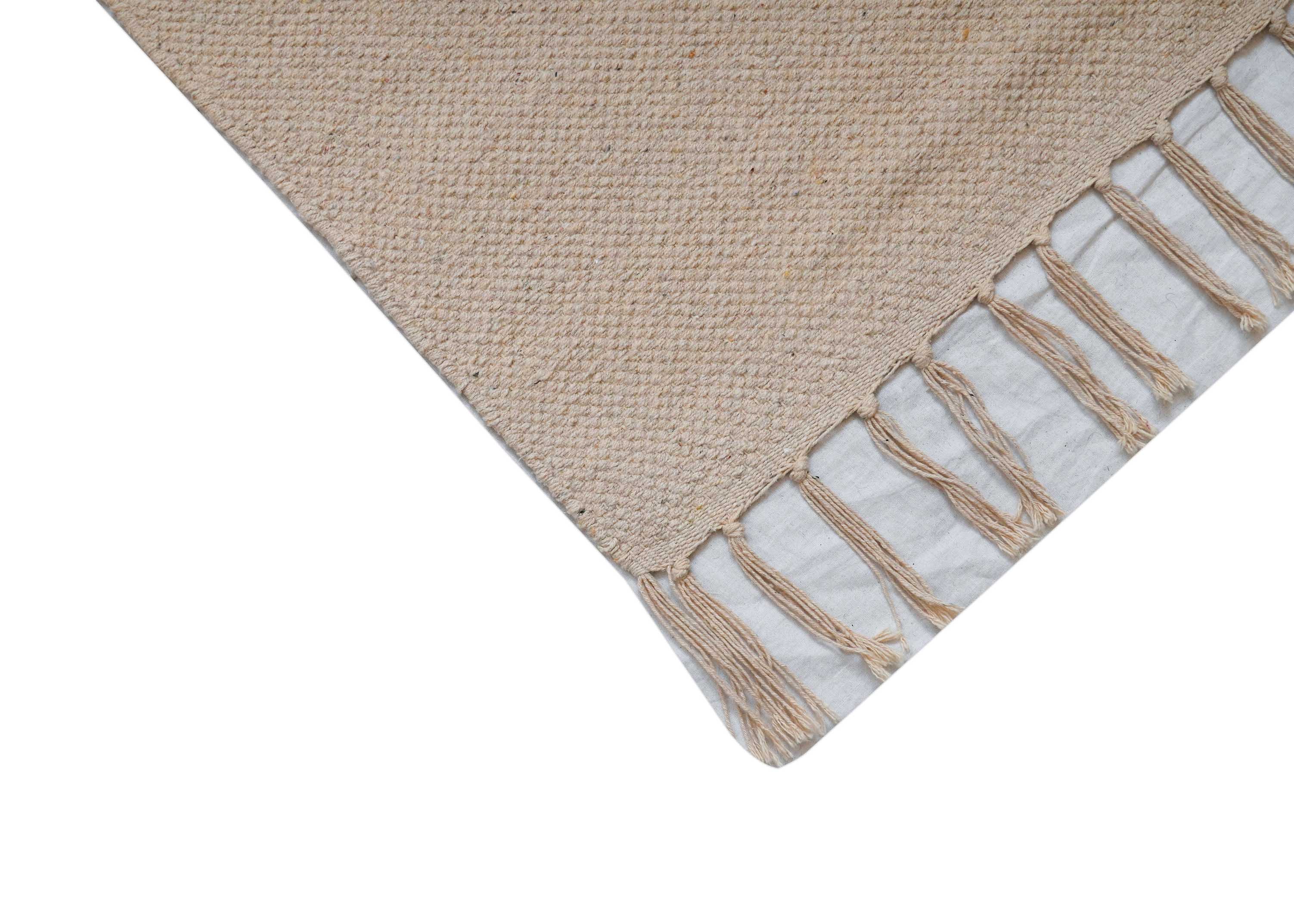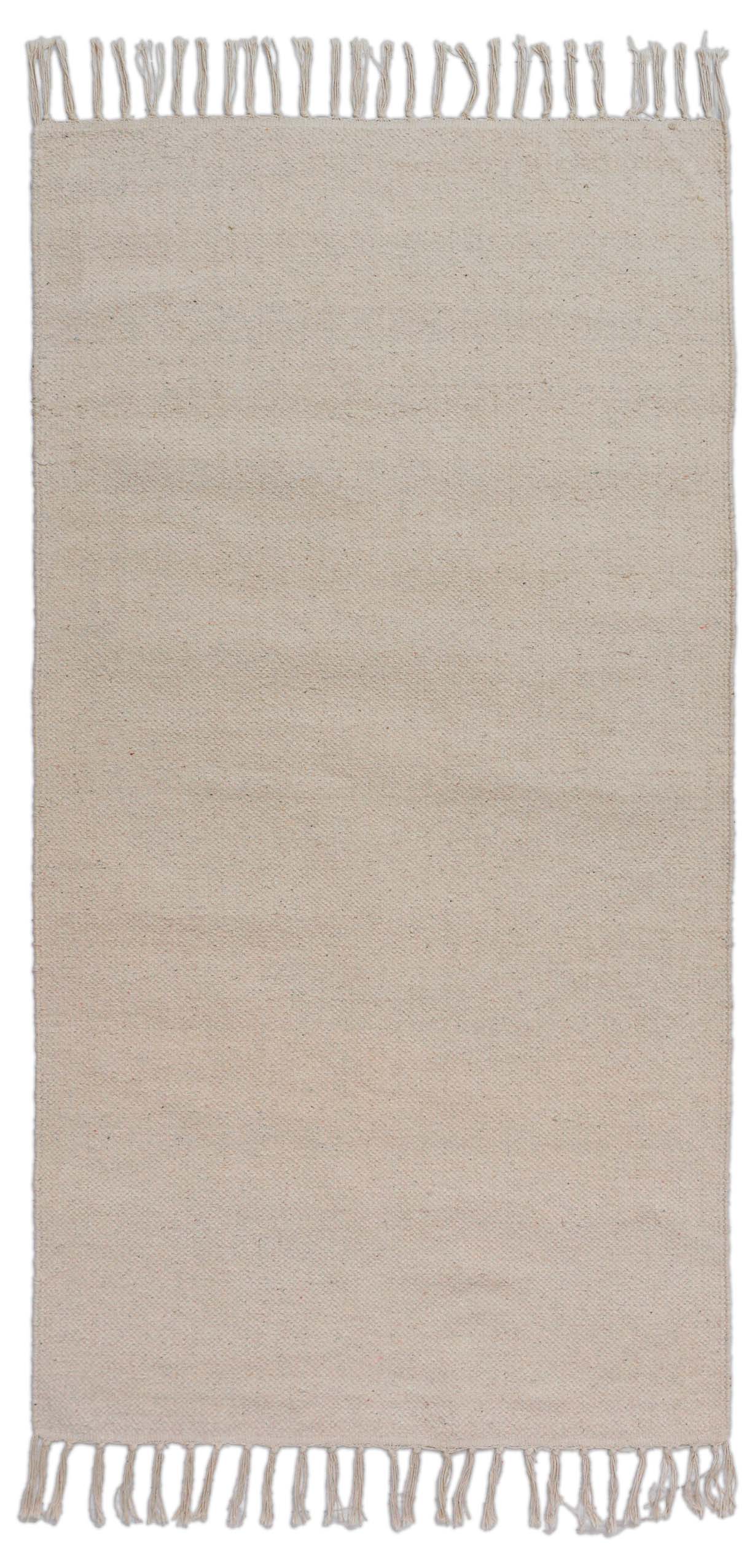 Die Schuss-Fäden dieses Kelim Teppichs bestehen aus handgesponnener, mit Pflanzenfarben gefärbter Schafwolle. Vor dem Weben des Teppichs wurden dafür zunächst Schafe geschoren und die Wolle anschließend gereinigt, gekämmt und schließlich gesponnen. Nach dem Spinnen wird die Wolle der Kelim Teppiche in einem aufwendigen Prozess mit Naturfarben gefärbt. Der Flor der Kelim Teppiche wirkt wegen dieses traditionellen Verfahrens trocken und leicht pelzig. Die Kett-Fäden dieses Kelims bestehen aus Baumwolle.