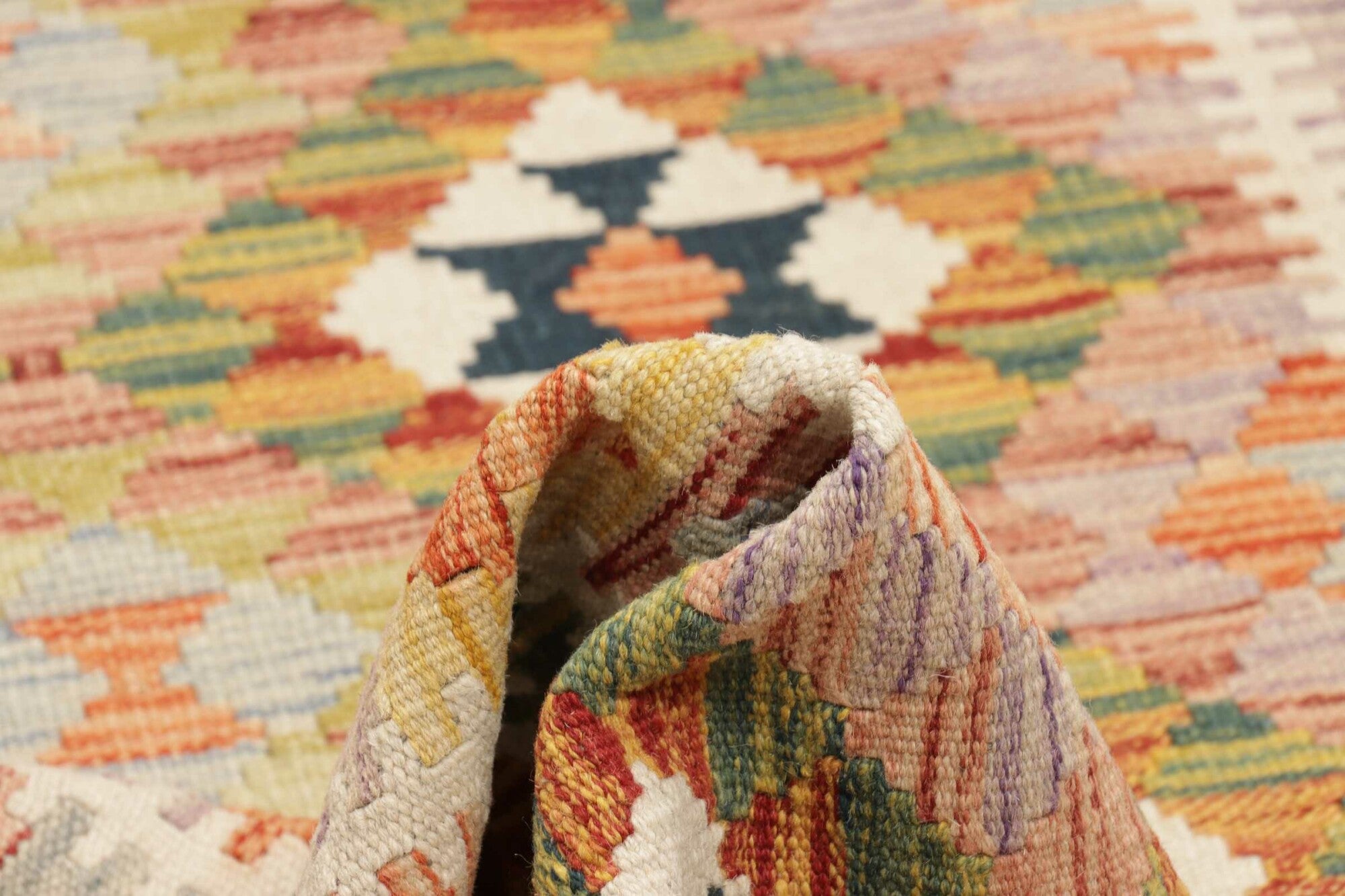 Die Schuss-Fäden dieses Kelim Teppichs bestehen aus handgesponnener, mit Pflanzenfarben gefärbter Schafwolle. Vor dem Weben des Teppichs wurden dafür zunächst Schafe geschoren und die Wolle anschließend gereinigt, gekämmt und schließlich gesponnen. Nach dem Spinnen wird die Wolle der Kelim Teppiche in einem aufwendigen Prozess mit Naturfarben gefärbt. Der Flor der Kelim Teppiche wirkt wegen dieses traditionellen Verfahrens trocken und leicht pelzig. Die Kett-Fäden dieses Kelims bestehen aus Wolle.