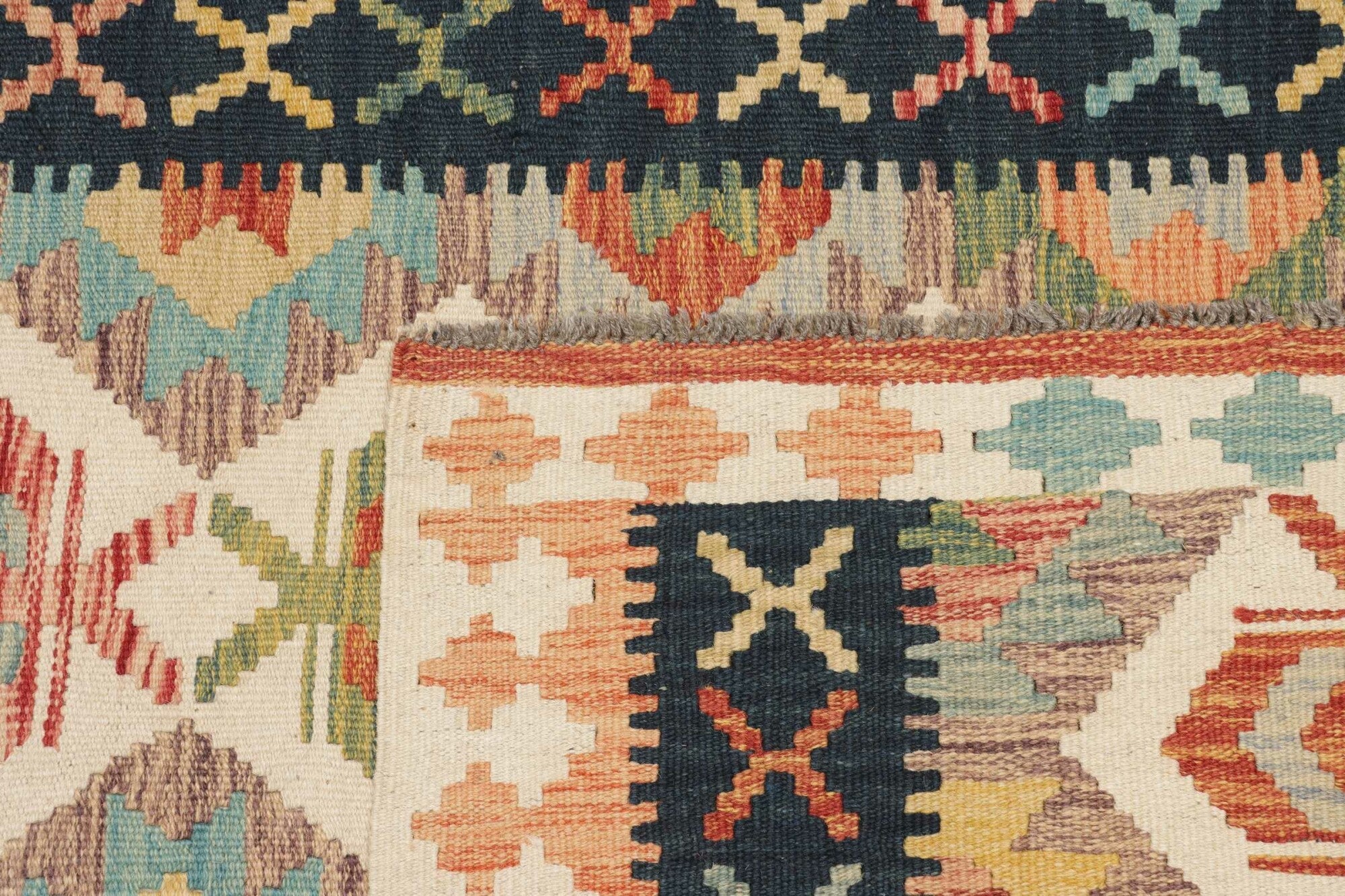 Die Farben dieses Kelims leuchten bunt.