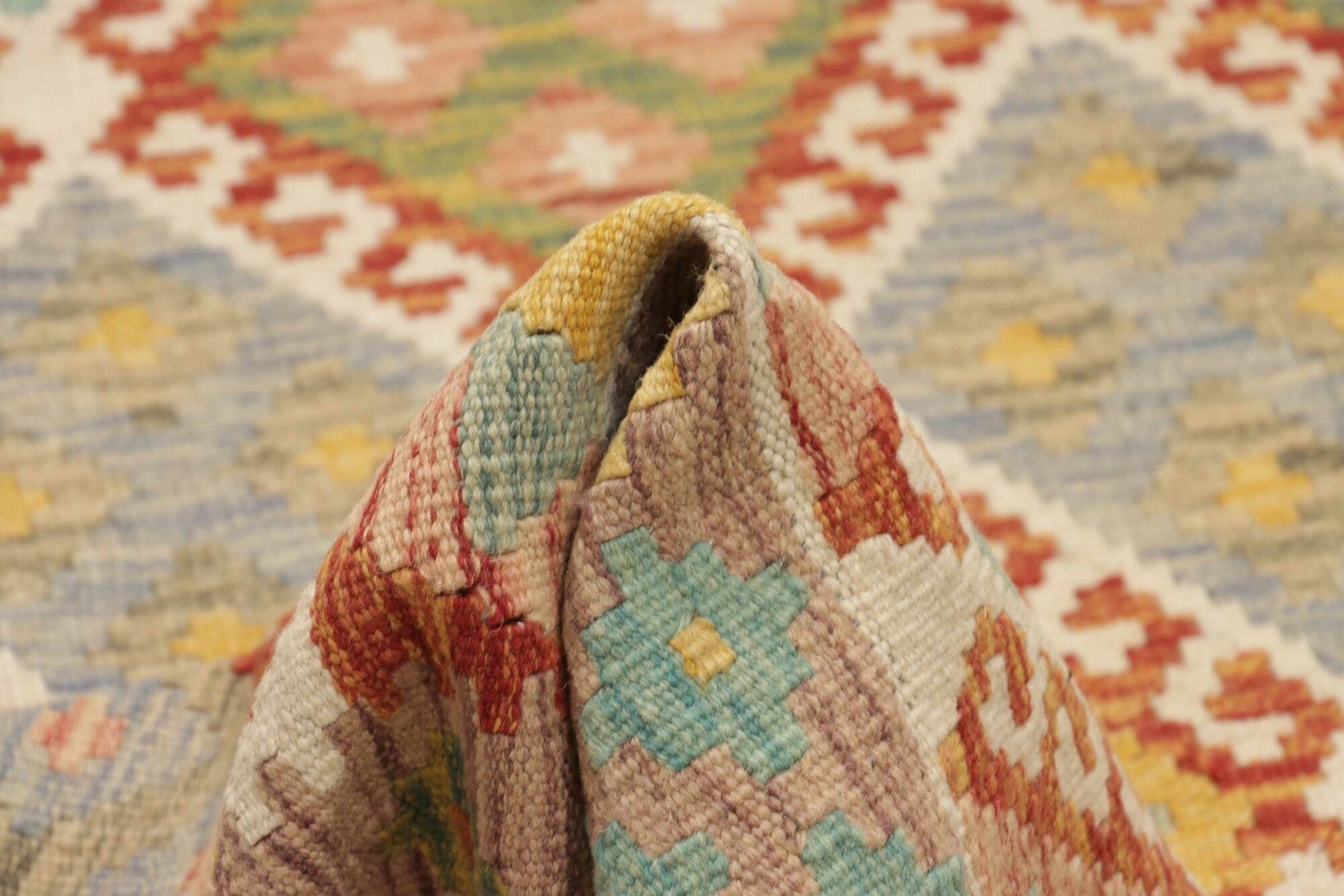 Die Schuss-Fäden dieses Kelim Teppichs bestehen aus handgesponnener, mit Pflanzenfarben gefärbter Schafwolle. Vor dem Weben des Teppichs wurden dafür zunächst Schafe geschoren und die Wolle anschließend gereinigt, gekämmt und schließlich gesponnen. Nach dem Spinnen wird die Wolle der Kelim Teppiche in einem aufwendigen Prozess mit Naturfarben gefärbt. Der Flor der Kelim Teppiche wirkt wegen dieses traditionellen Verfahrens trocken und leicht pelzig. Die Kett-Fäden dieses Kelims bestehen aus Wolle.