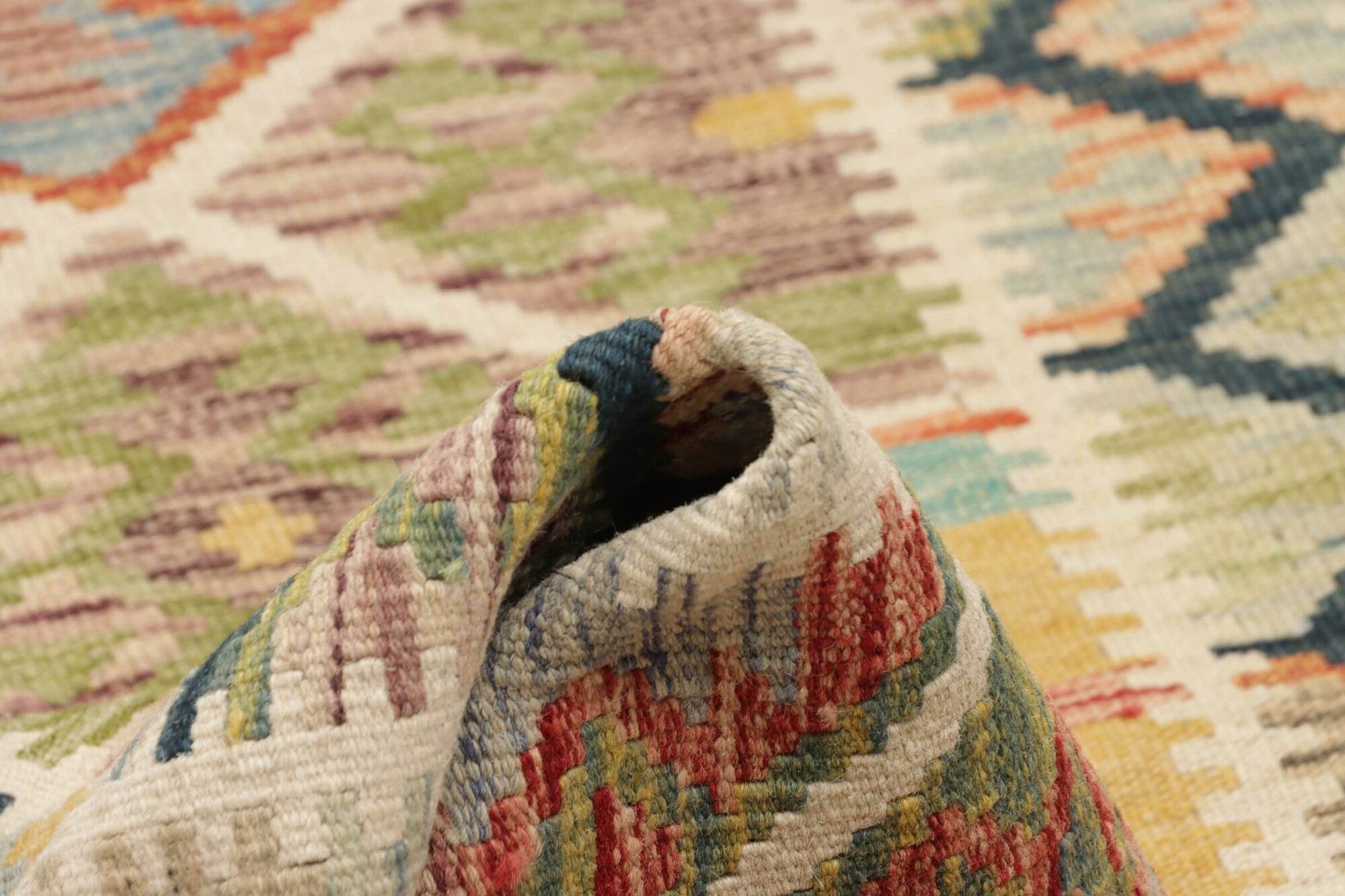 Die Schuss-Fäden dieses Kelim Teppichs bestehen aus handgesponnener, mit Pflanzenfarben gefärbter Schafwolle. Vor dem Weben des Teppichs wurden dafür zunächst Schafe geschoren und die Wolle anschließend gereinigt, gekämmt und schließlich gesponnen. Nach dem Spinnen wird die Wolle der Kelim Teppiche in einem aufwendigen Prozess mit Naturfarben gefärbt. Der Flor der Kelim Teppiche wirkt wegen dieses traditionellen Verfahrens trocken und leicht pelzig. Die Kett-Fäden dieses Kelims bestehen aus Wolle.