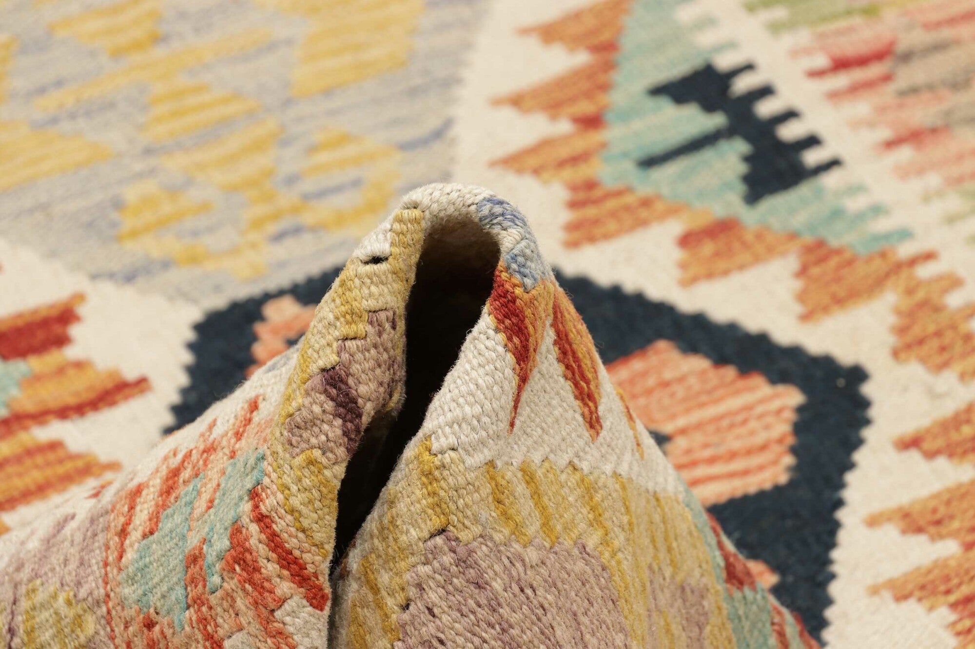 Die Schuss-Fäden dieses Kelim Teppichs bestehen aus handgesponnener, mit Pflanzenfarben gefärbter Schafwolle. Vor dem Weben des Teppichs wurden dafür zunächst Schafe geschoren und die Wolle anschließend gereinigt, gekämmt und schließlich gesponnen. Nach dem Spinnen wird die Wolle der Kelim Teppiche in einem aufwendigen Prozess mit Naturfarben gefärbt. Der Flor der Kelim Teppiche wirkt wegen dieses traditionellen Verfahrens trocken und leicht pelzig. Die Kett-Fäden dieses Kelims bestehen aus Wolle.