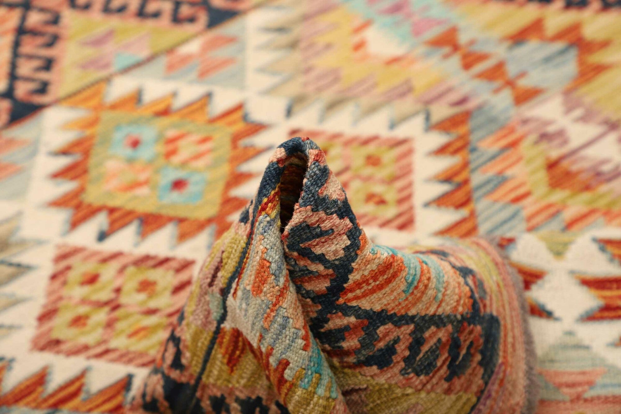 Die Schuss-Fäden dieses Kelim Teppichs bestehen aus handgesponnener, mit Pflanzenfarben gefärbter Schafwolle. Vor dem Weben des Teppichs wurden dafür zunächst Schafe geschoren und die Wolle anschließend gereinigt, gekämmt und schließlich gesponnen. Nach dem Spinnen wird die Wolle der Kelim Teppiche in einem aufwendigen Prozess mit Naturfarben gefärbt. Der Flor der Kelim Teppiche wirkt wegen dieses traditionellen Verfahrens trocken und leicht pelzig. Die Kett-Fäden dieses Kelims bestehen aus Wolle.