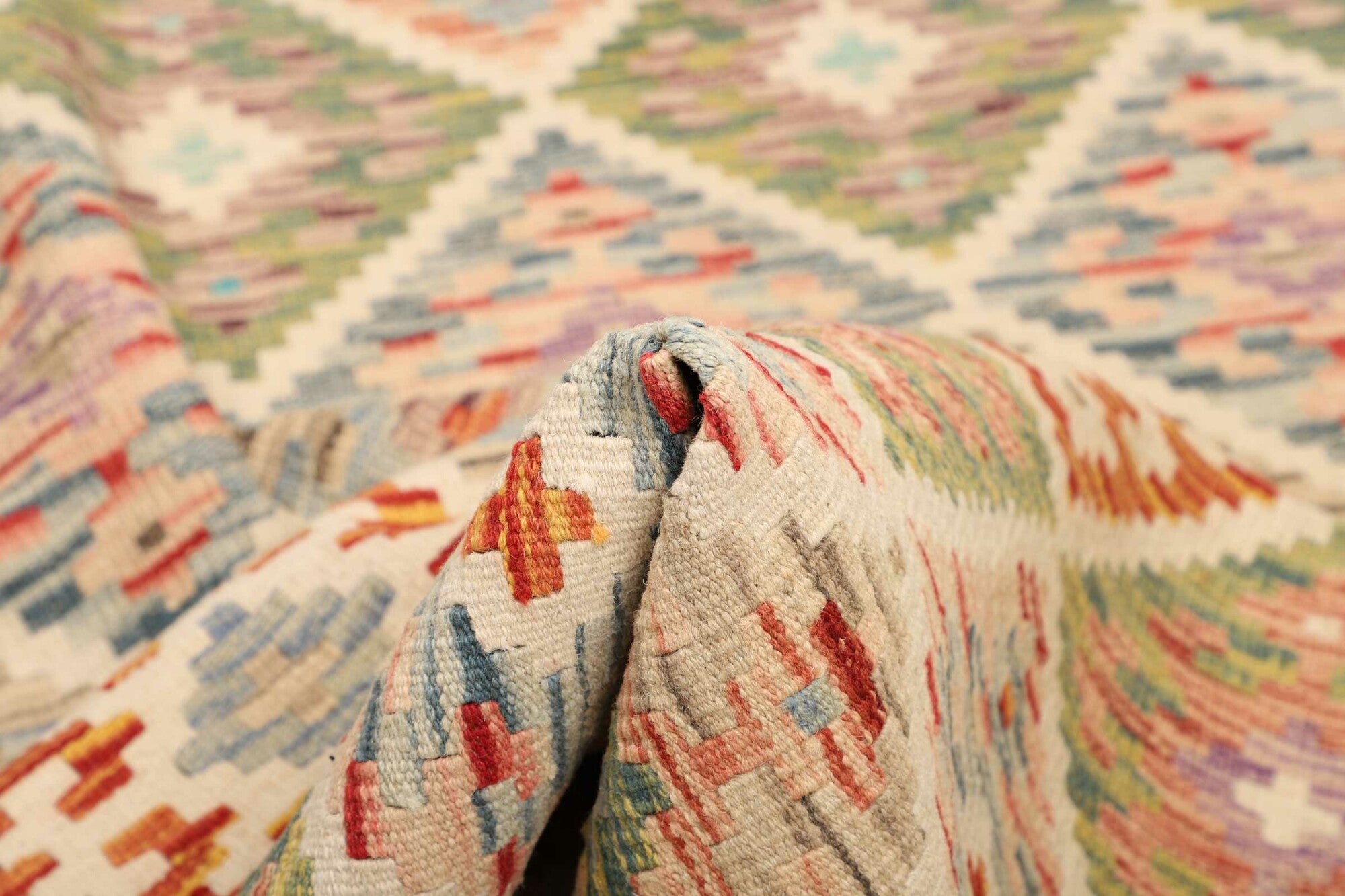Die Schuss-Fäden dieses Kelim Teppichs bestehen aus handgesponnener, mit Pflanzenfarben gefärbter Schafwolle. Vor dem Weben des Teppichs wurden dafür zunächst Schafe geschoren und die Wolle anschließend gereinigt, gekämmt und schließlich gesponnen. Nach dem Spinnen wird die Wolle der Kelim Teppiche in einem aufwendigen Prozess mit Naturfarben gefärbt. Der Flor der Kelim Teppiche wirkt wegen dieses traditionellen Verfahrens trocken und leicht pelzig. Die Kett-Fäden dieses Kelims bestehen aus Wolle.
