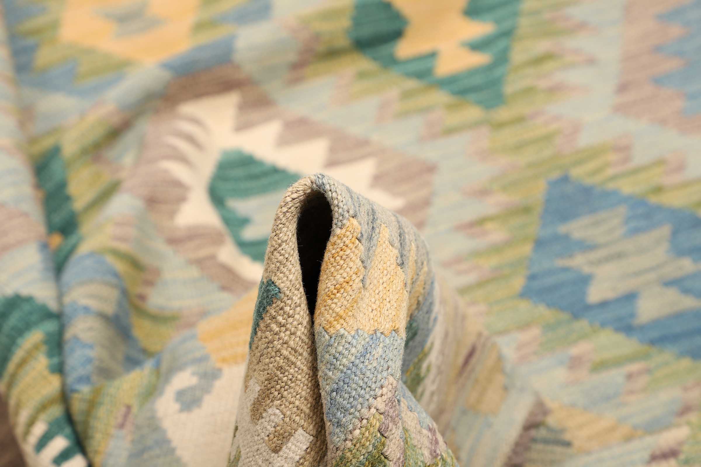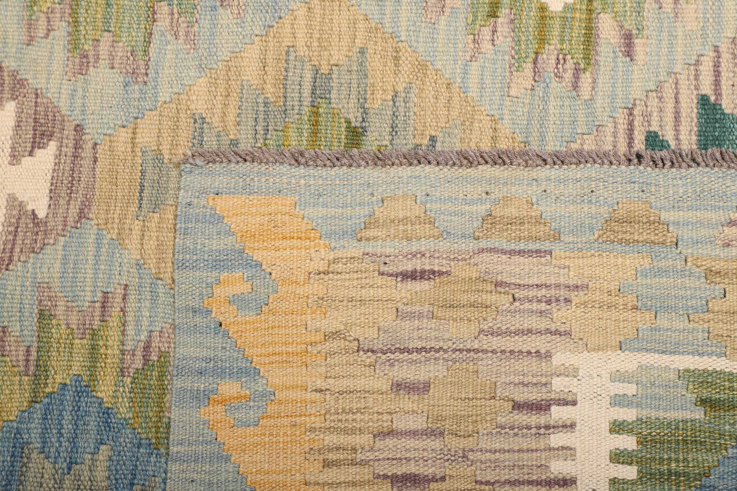 Die Schuss-Fäden dieses Kelim Teppichs bestehen aus handgesponnener, mit Pflanzenfarben gefärbter Schafwolle. Vor dem Weben des Teppichs wurden dafür zunächst Schafe geschoren und die Wolle anschließend gereinigt, gekämmt und schließlich gesponnen. Nach dem Spinnen wird die Wolle der Kelim Teppiche in einem aufwendigen Prozess mit Naturfarben gefärbt. Der Flor der Kelim Teppiche wirkt wegen dieses traditionellen Verfahrens trocken und leicht pelzig. Die Kett-Fäden dieses Kelims bestehen aus Wolle.