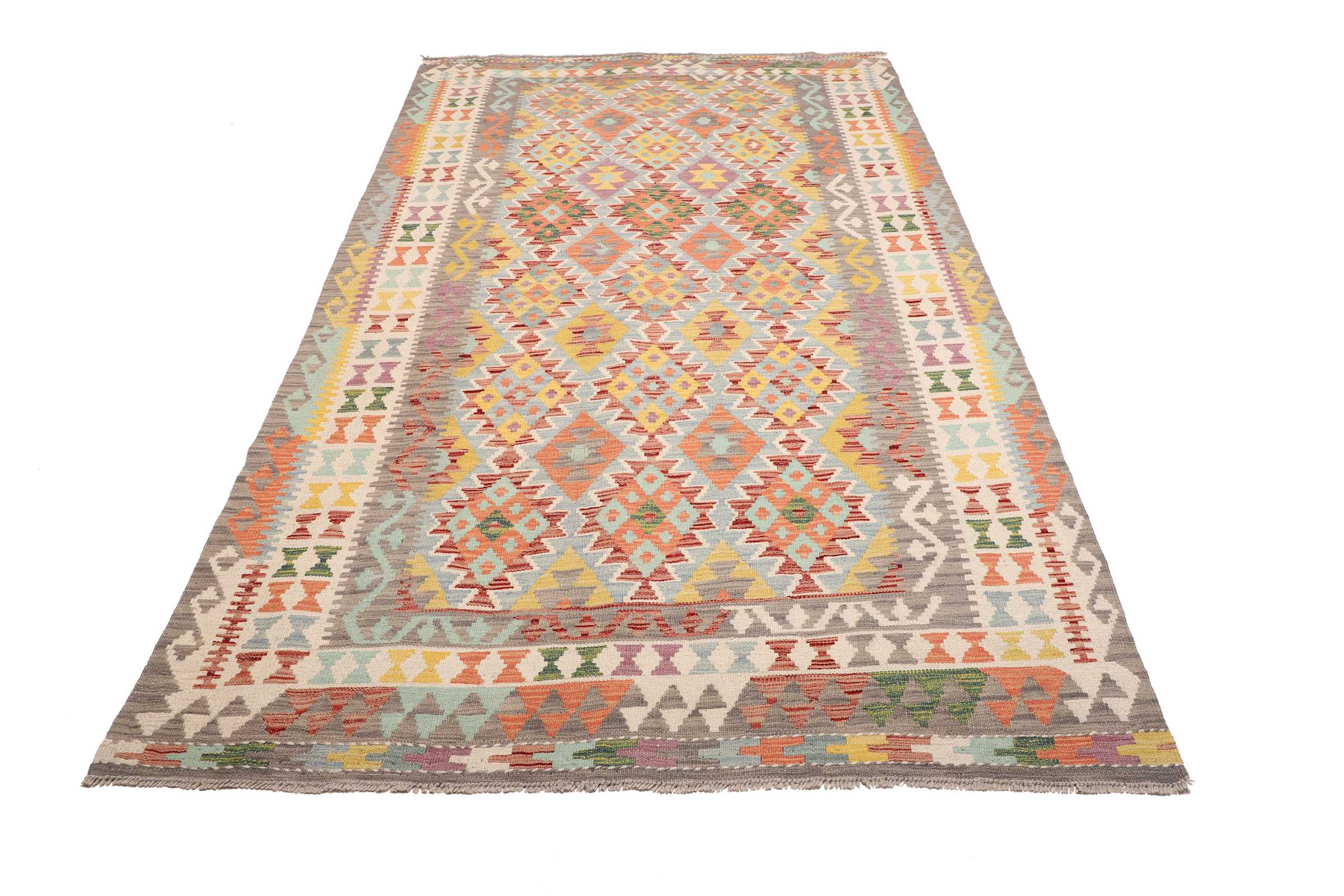 Der Hintergrund dieses Kelims ist Blaugrau. Im Gesamteindruck leuchtet der Teppich in bunten Farben.