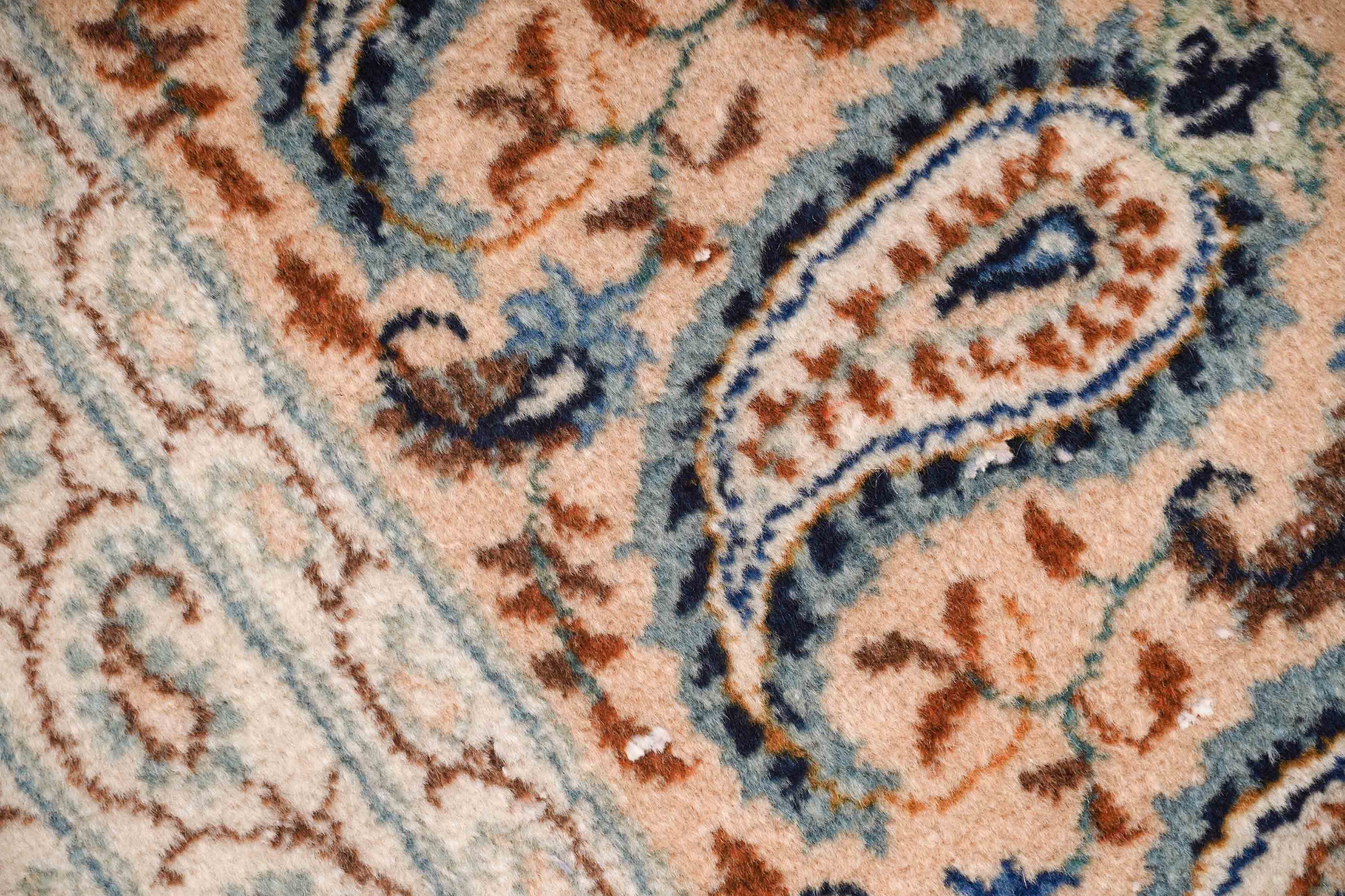 Der Flor dieses Keshans wurde aus hochwertiger Schurwolle handgeknüpft. Schurwolle wird durch das schonende Scheren von Schafen gewonnen. Schurwolle ist ein nachwachsender, natürlicher Rohstoff mit einer Reihe beeindruckender Eigenschaften: Durch den natürlichen Fettgehalt der Wolle stößt die Oberfläche Wassertropfen ab und ist so auf natürliche Weise gegen Schmutz imprägniert. Wolle bietet außerdem eine hervorragende Wärmeisolation, wirkt regulierend auf das Wohnklima und dämpft den Schall. Die Schuss- und Kettfäden dieses Keshans bestehen aus Baumwolle. Das vielseitige Material ist reißfest und dehnbar und daher besonders geeignet für ein strapazierfähiges Untergewebe.
