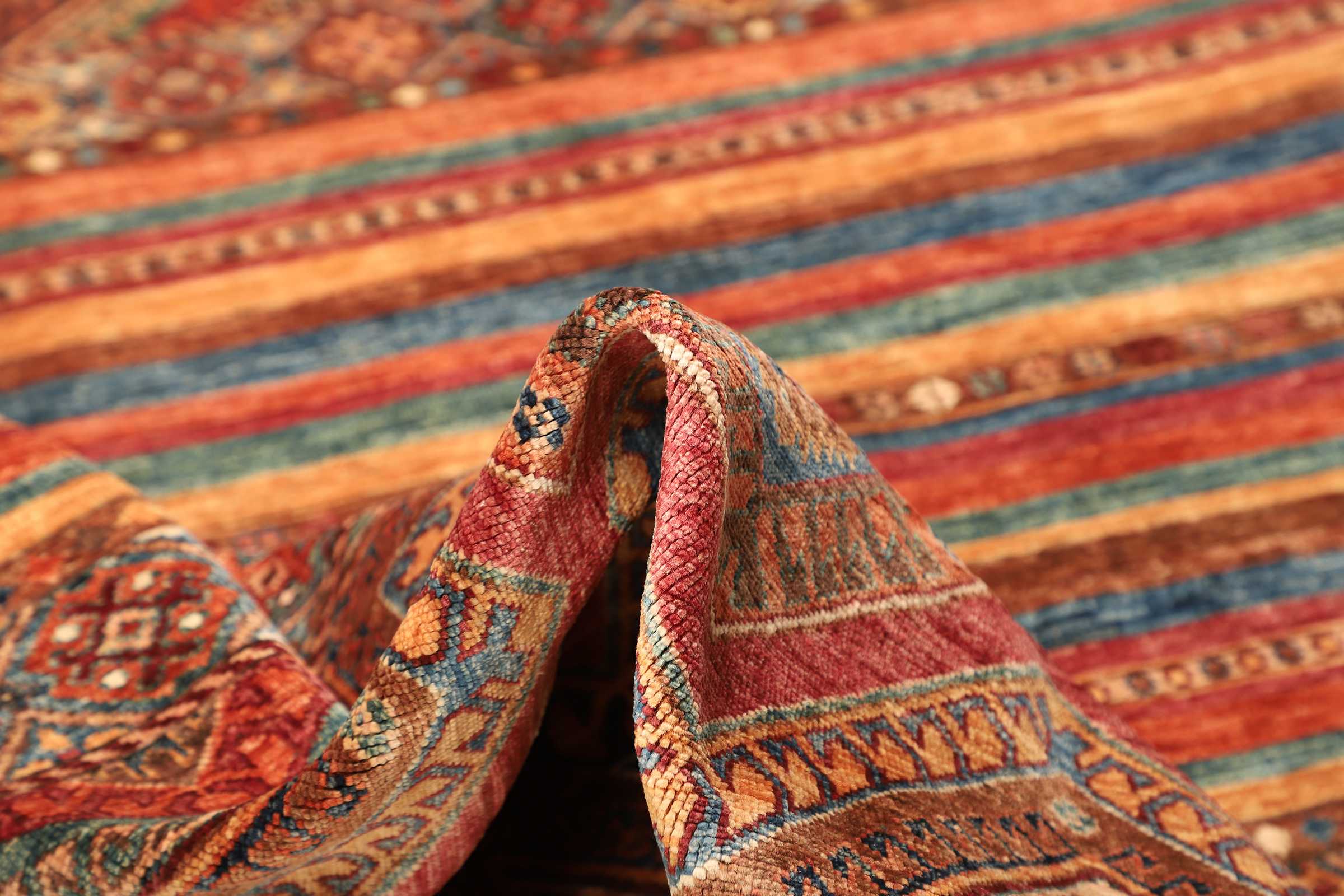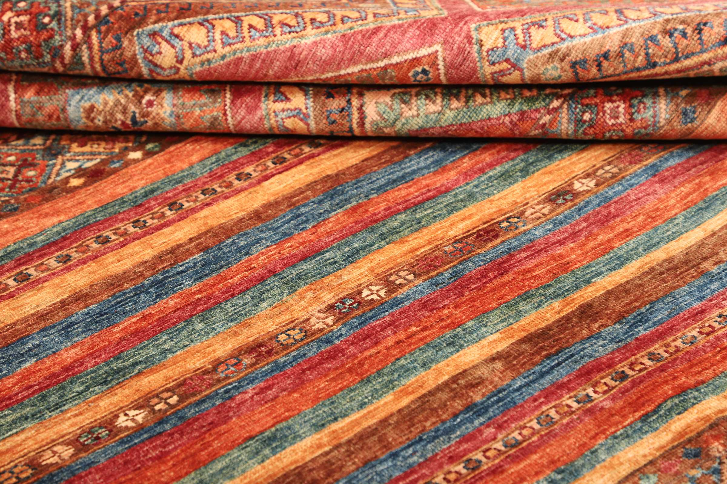 Das Muster dieses handgeknüpften Oxiana Teppichs ist angelehnt an die traditionellen, usbekischen Muster. Ursprünglich wurde vor allem in der Region um Samarkand und Oxiana Teppiche mit einem ähnlichen Muster geknüpft. Unsere Oxiana Teppiche sind auf den zeitgenössischen Geschmack abgestimmt: Harmonische Farbkompositionen aus Naturfarben schmeicheln dem traditionellen Muster. Die Oxiana Teppiche zieren farbenfrohe Querstreifen, die sich mit phantasievoll gemusterten Bereichen abwechseln. Die gemusterten Teile zeigen geometrische Kompositionen, die an ein Kazak Muster erinnern. Charakteristisch ist außerdem, dass die Fransen in kleinen Bündeln zusammengefasst und mit verschiedenfarbigen Fäden umwickelt wurden.