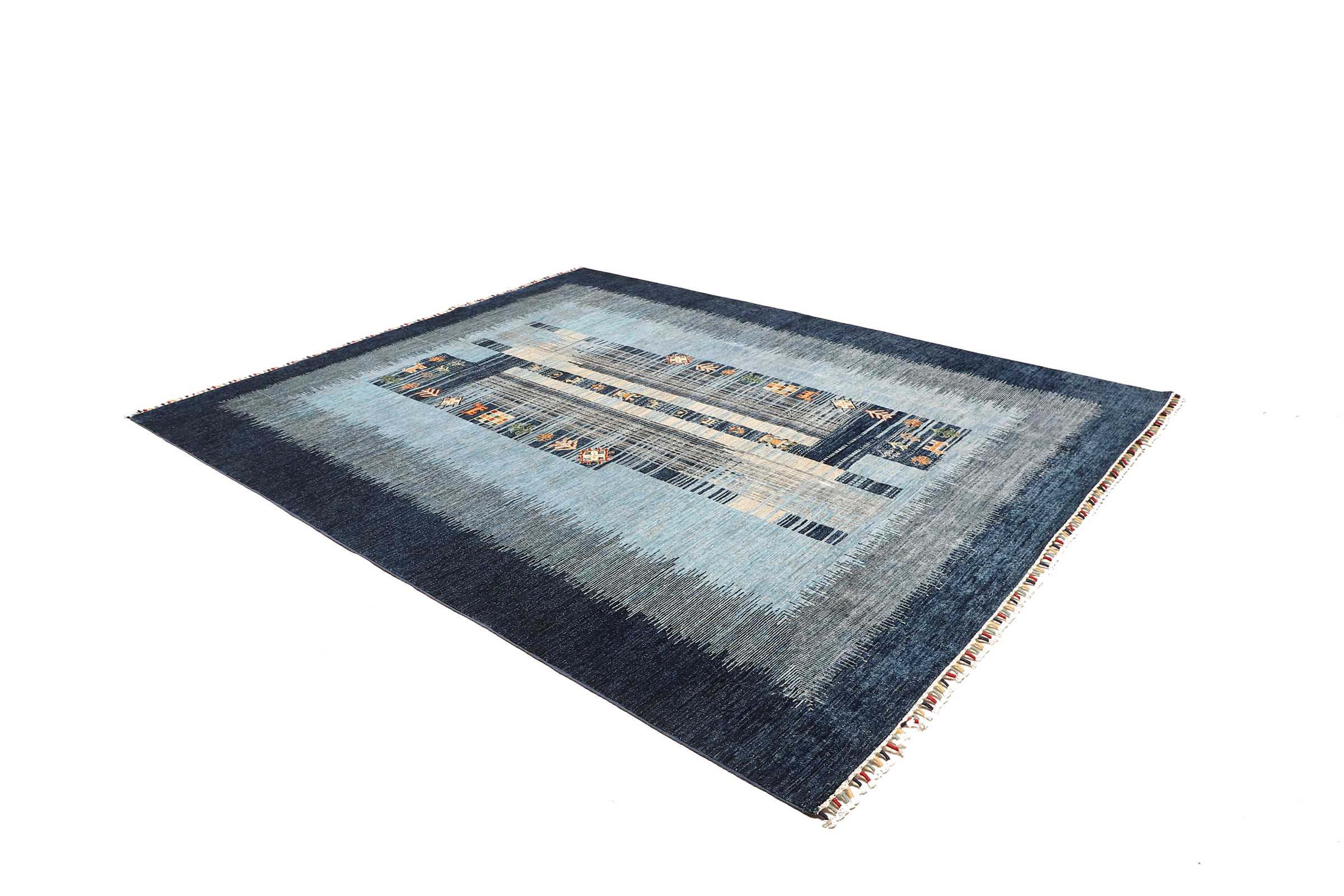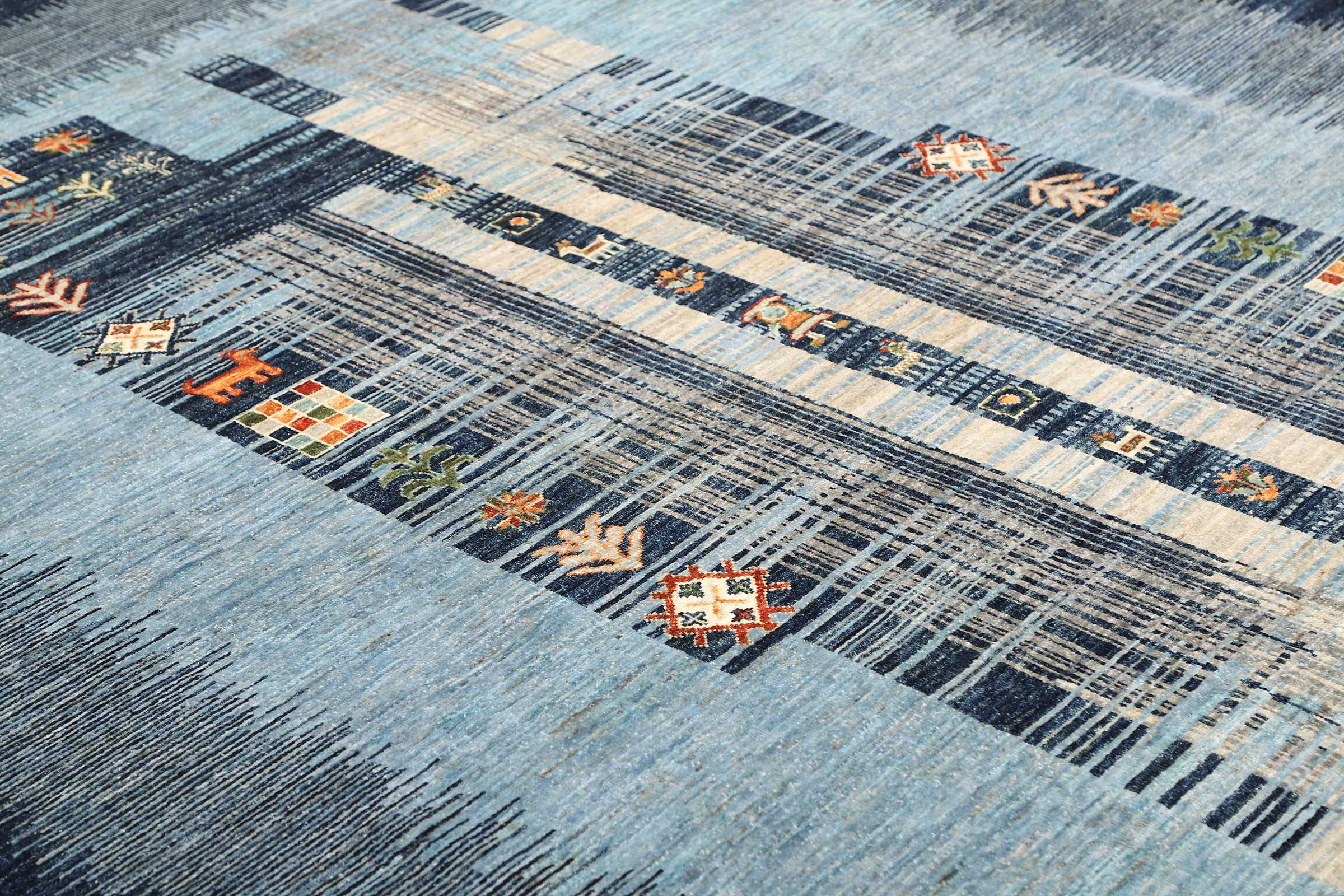 Das Muster dieses handgeknüpften Oxiana Teppichs ist angelehnt an die traditionellen, usbekischen Muster. Ursprünglich wurde vor allem in der Region um Samarkand und Oxiana Teppiche mit einem ähnlichen Muster geknüpft. Unsere Oxiana Teppiche sind auf den zeitgenössischen Geschmack abgestimmt: Harmonische Farbkompositionen aus Naturfarben schmeicheln dem traditionellen Muster. Die Oxiana Teppiche zieren farbenfrohe Querstreifen, die sich mit phantasievoll gemusterten Bereichen abwechseln. Die gemusterten Teile zeigen geometrische Kompositionen, die an ein Kazak Muster erinnern. Charakteristisch ist außerdem, dass die Fransen in kleinen Bündeln zusammengefasst und mit verschiedenfarbigen Fäden umwickelt wurden.