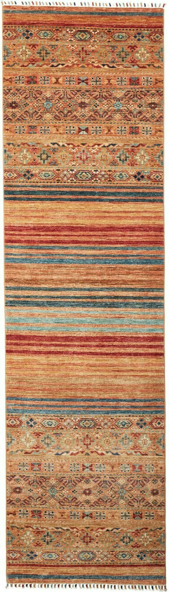 Das Muster dieses handgeknüpften Oxiana Teppichs ist angelehnt an die traditionellen, usbekischen Muster. Ursprünglich wurde vor allem in der Region um Samarkand und Oxiana Teppiche mit einem ähnlichen Muster geknüpft. Unsere Oxiana Teppiche sind auf den zeitgenössischen Geschmack abgestimmt: Harmonische Farbkompositionen aus Naturfarben schmeicheln dem traditionellen Muster. Die Oxiana Teppiche zieren farbenfrohe Querstreifen, die sich mit phantasievoll gemusterten Bereichen abwechseln. Die gemusterten Teile zeigen geometrische Kompositionen, die an ein Kazak Muster erinnern. Charakteristisch ist außerdem, dass die Fransen in kleinen Bündeln zusammengefasst und mit verschiedenfarbigen Fäden umwickelt wurden.