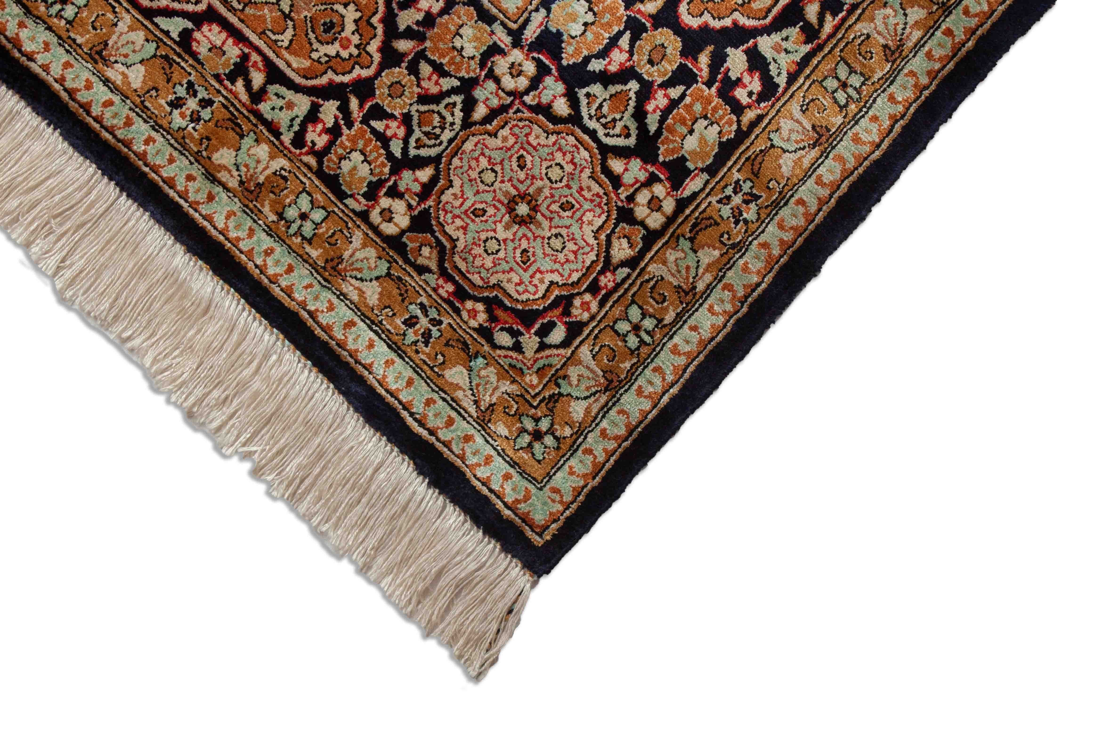 The Silk de ce ghom fait briller les couleurs du motif dans différentes facettes, selon l'incidence de la lumière. Il fait de ce ghom un véritable point fort et crée une atmosphère confortable et en même temps très élégante et de haute qualité dans la pièce. La soie est obtenue à la main des cocons de l'araignée de soie. Comme les fils de soie individuels sont extrêmement longs, des fils très fins peuvent être produits qui sont néanmoins résistants à la déchirure avec un faible poids. Des nœuds de tapis plus petits peuvent être fabriqués avec le fil mince et ainsi des motifs plus fin peuvent être produits. Par conséquent, les plus beaux tapis du monde sont faits à la main de la pure soie. Dans ce fossé, même le métro était pure soie fait. En raison du matériau mince mais durable des fils de trame et de chaîne, un bouton particulièrement fin et donc un motif particulièrement fin est possible.