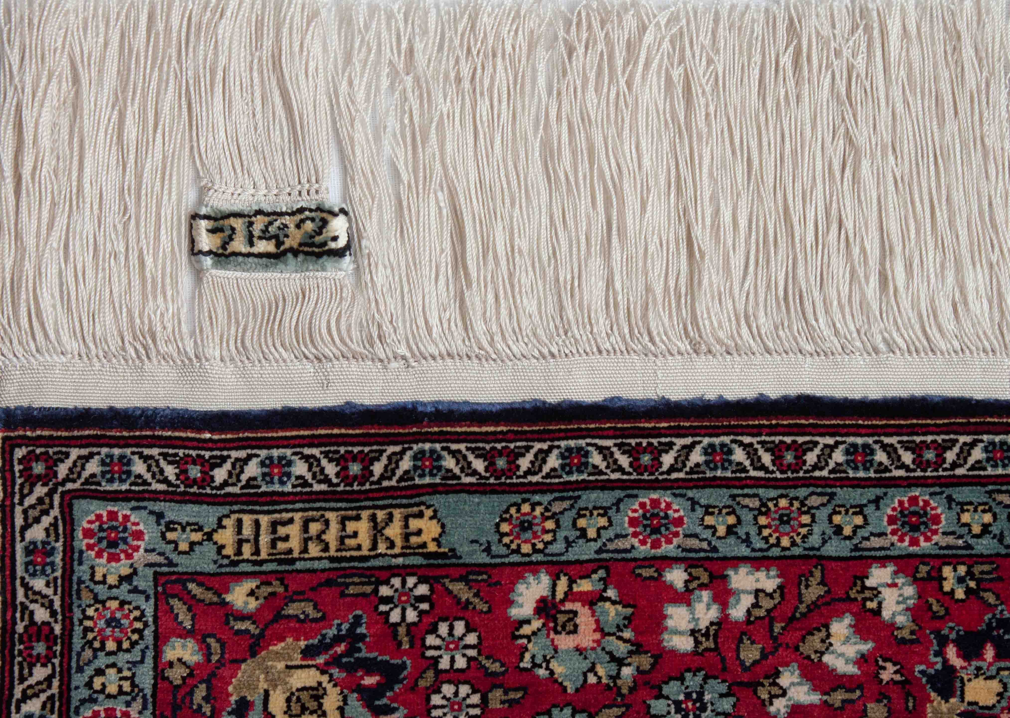 Motifs typiques Hereke Carpets sont des fleurs, des branches et des feuilles ainsi que des oiseaux, l'arbre de vie et soi-disant Mehrab or Mihrab patterns, une niche de prière montrée avec des lampes à huile. En plus des motifs traditionnels et des motifs typiques ottomans ou turcs, les tapis de soie Hereke avec des motifs plus modernes adaptés au goût du temps sont également aujourd'hui. Couleurs typiques pour Tapis de soie Hereke sont un bleu foncé profond, un rouge radieux, un vert vif, un jaune vif et des tons naturels différents dans toutes les nuances. Ce vieux Hereke environ 50 ans et un vrai amoureux. La signature "HEREKE" et un nombre sont incorporés dans le tissu de ce tapis de soie.