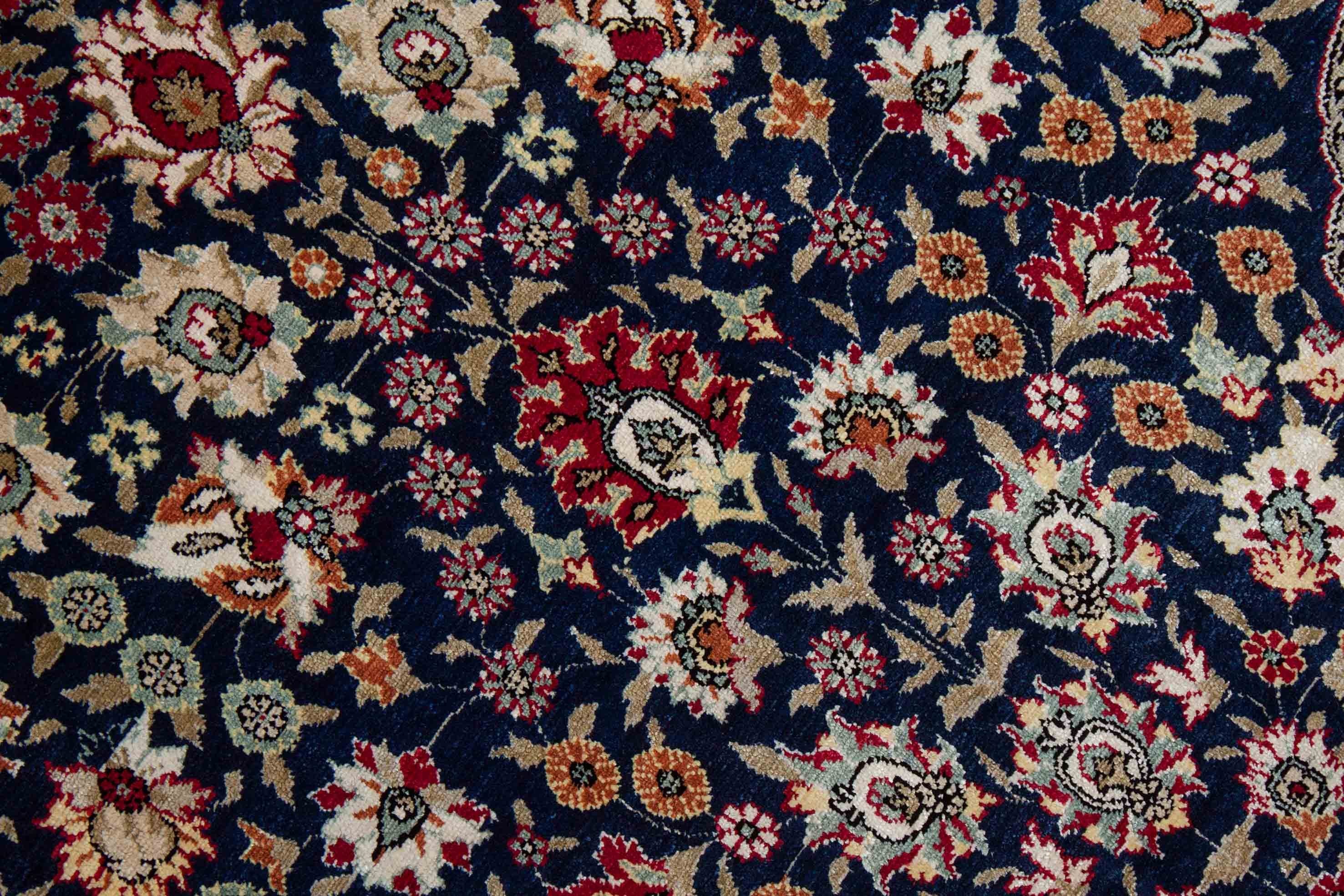 Floraler old Hereke en soie pure, bleu foncé dessiné avec médaillon central et bordure