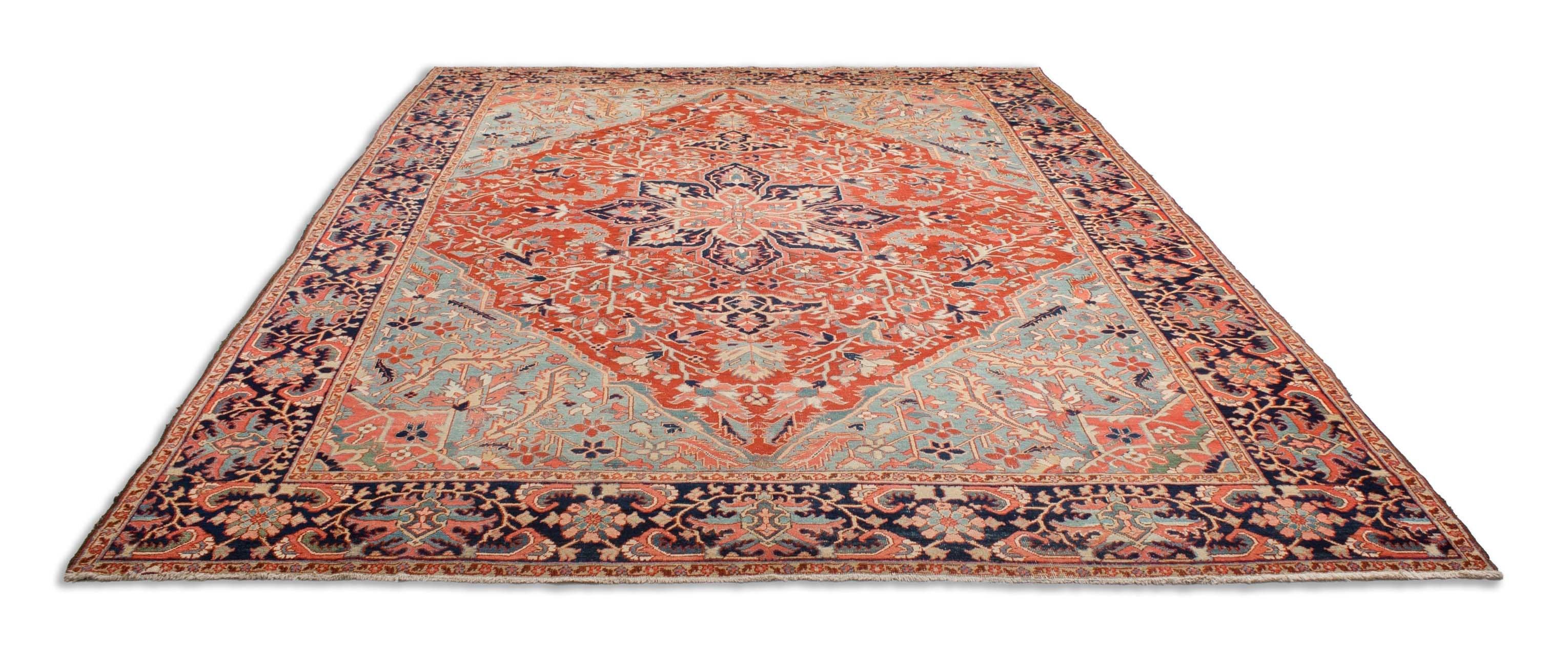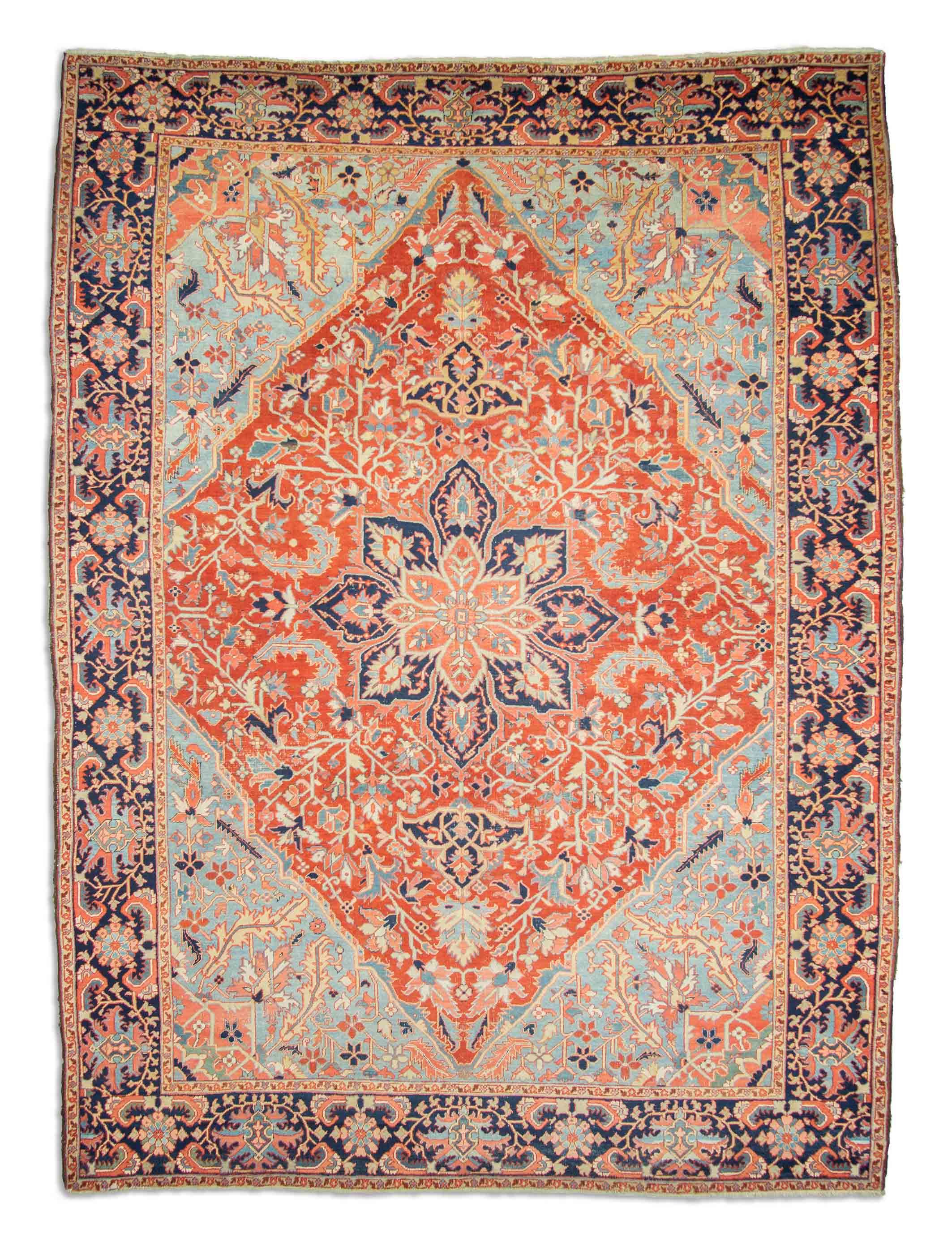 L'arrière-plan de cet heriz est rouillé. Le bord est maintenu en bleu foncé. Dans le centre bleu foncé les couleurs sont rouge clair et beige combiné.