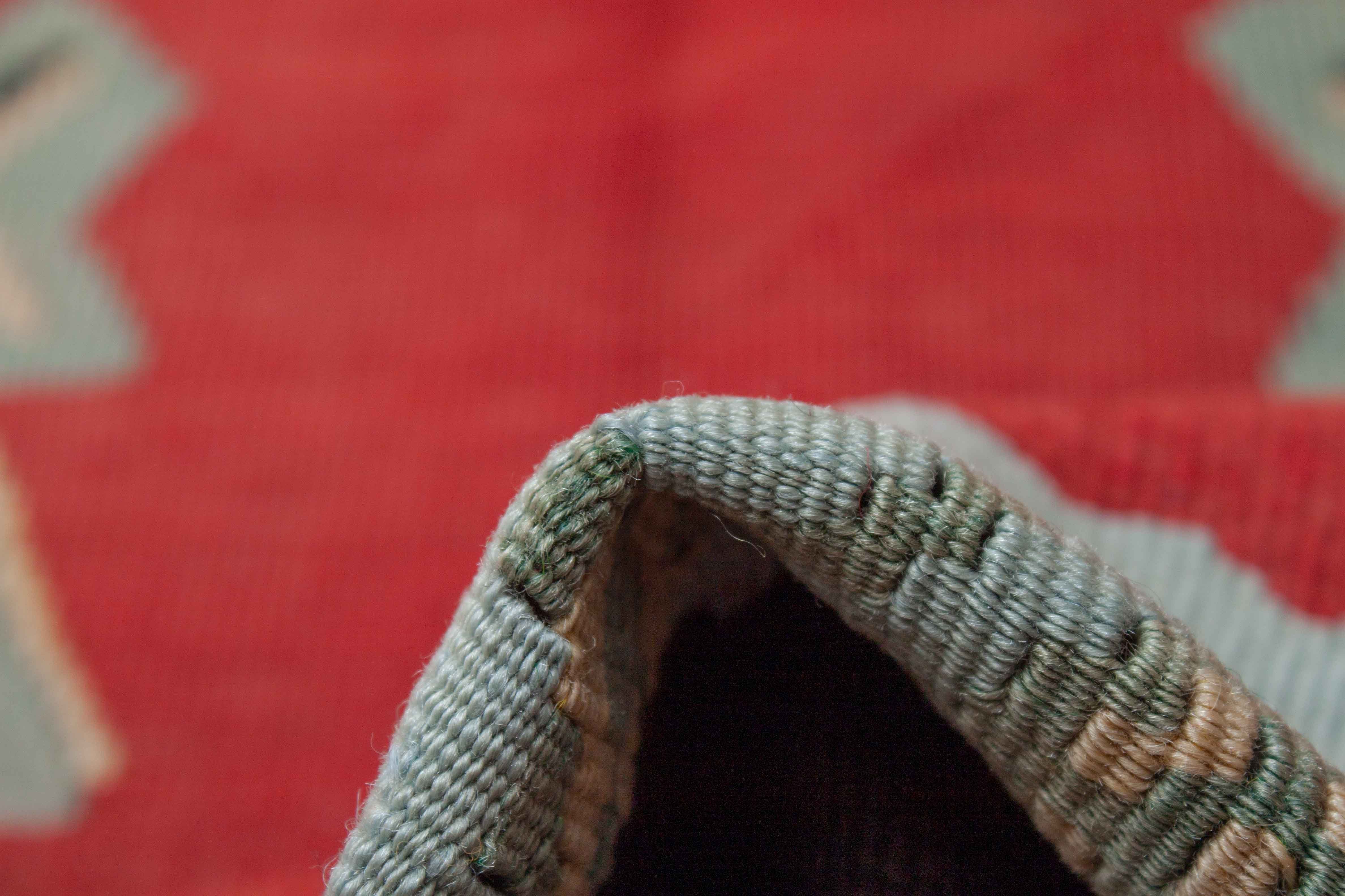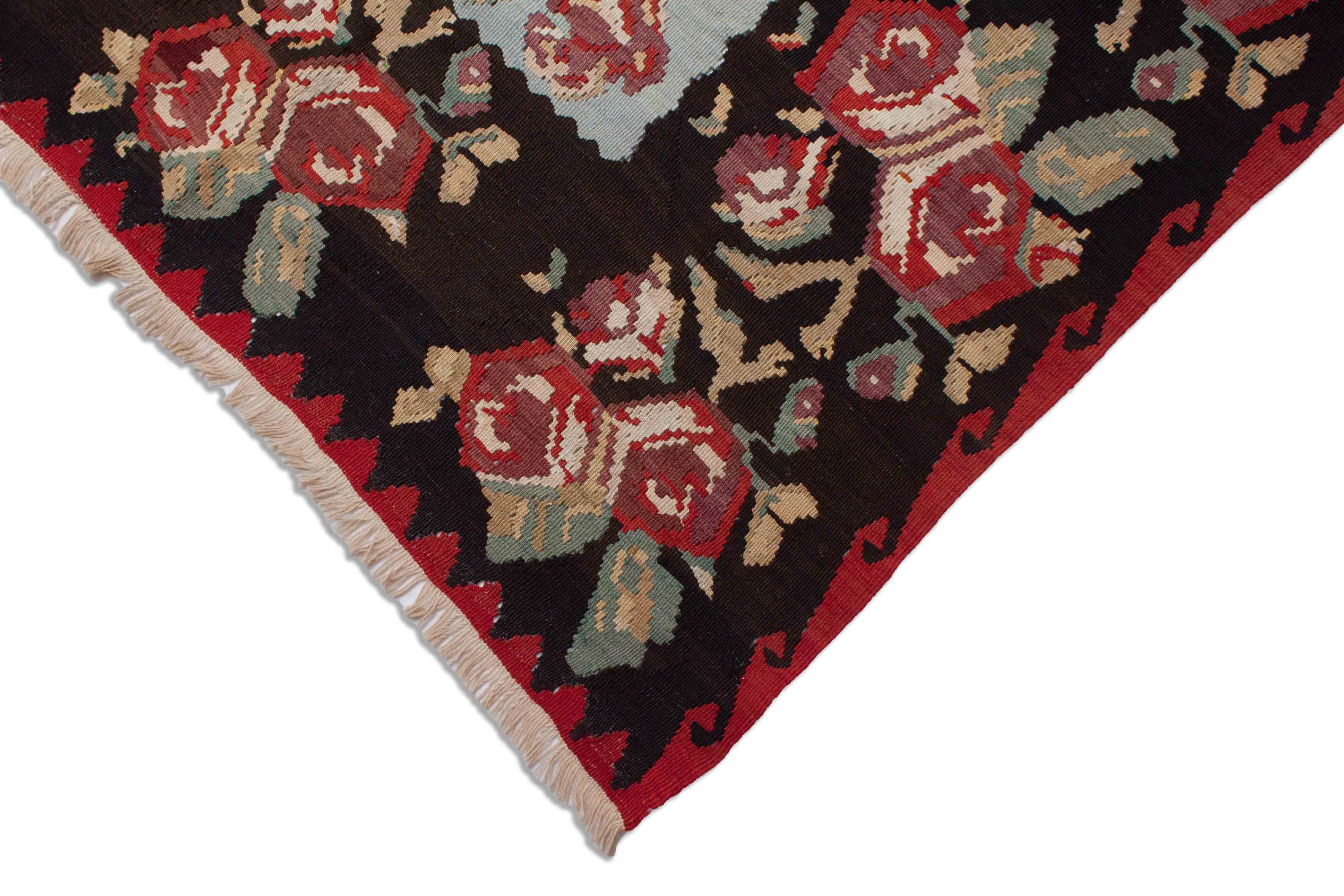 Le fond de ce Kelim est rouge rouillé. Le bord est conçu dans les couleurs noir, rouge foncé et gris bleu. Dans le centre noir les couleurs gris bleu et lilas sont combinés.