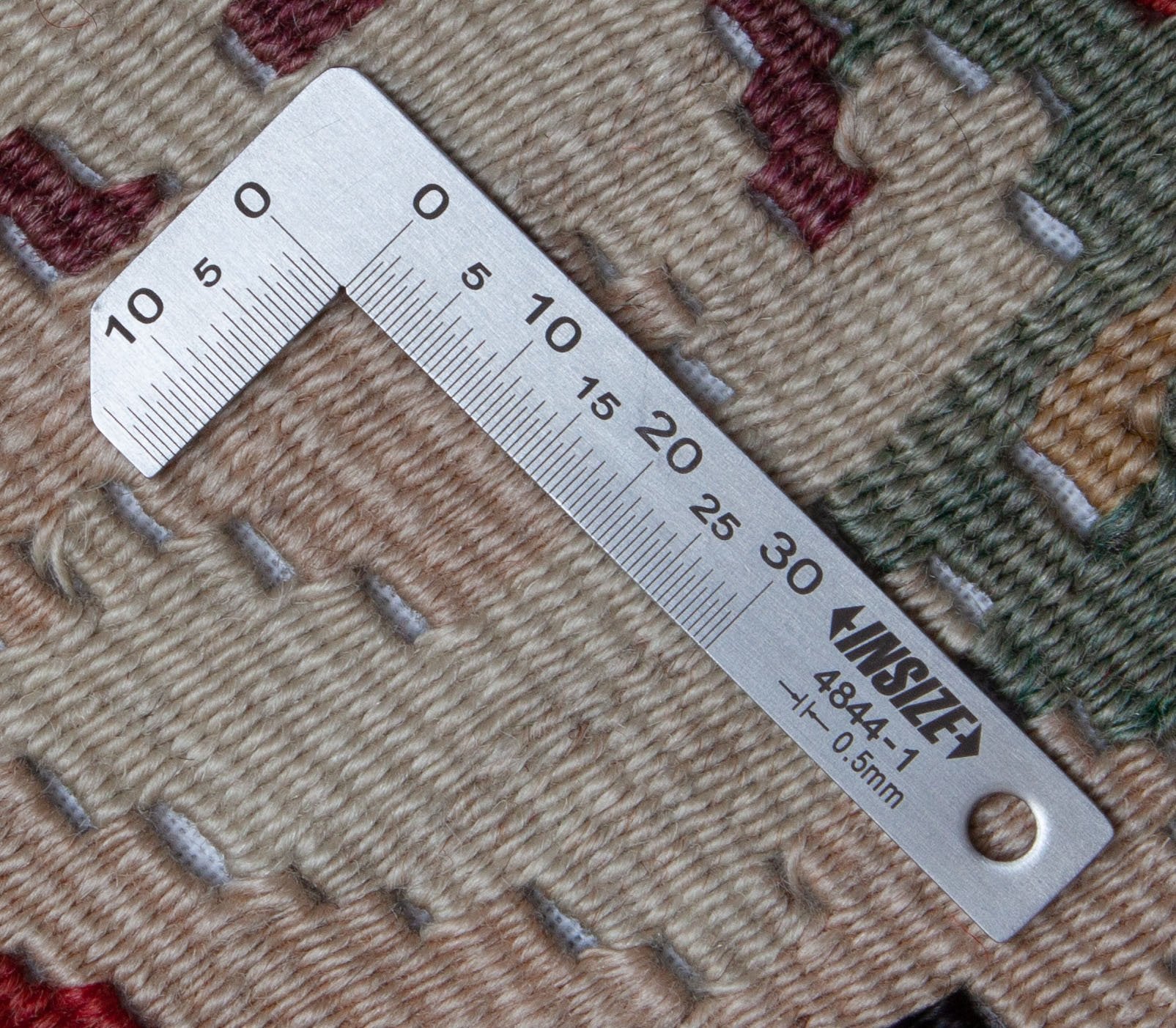 Devenez Kelim tissé à la main et ne comprennent que des fils de distorsion et de tir, donc n'ont pas de pile épaisse, orientée vers le haut. Les Kelim ont le même motif des deux côtés et sont donc des deux côtés. Le motif est créé par les fils de trame colorés qui sont tissés dans les fils de distorsion. Pour chaque nouvelle couleur, un nouveau fil doit être utilisé dans chaque rangée. Les extrémités du fil sont incorporées.