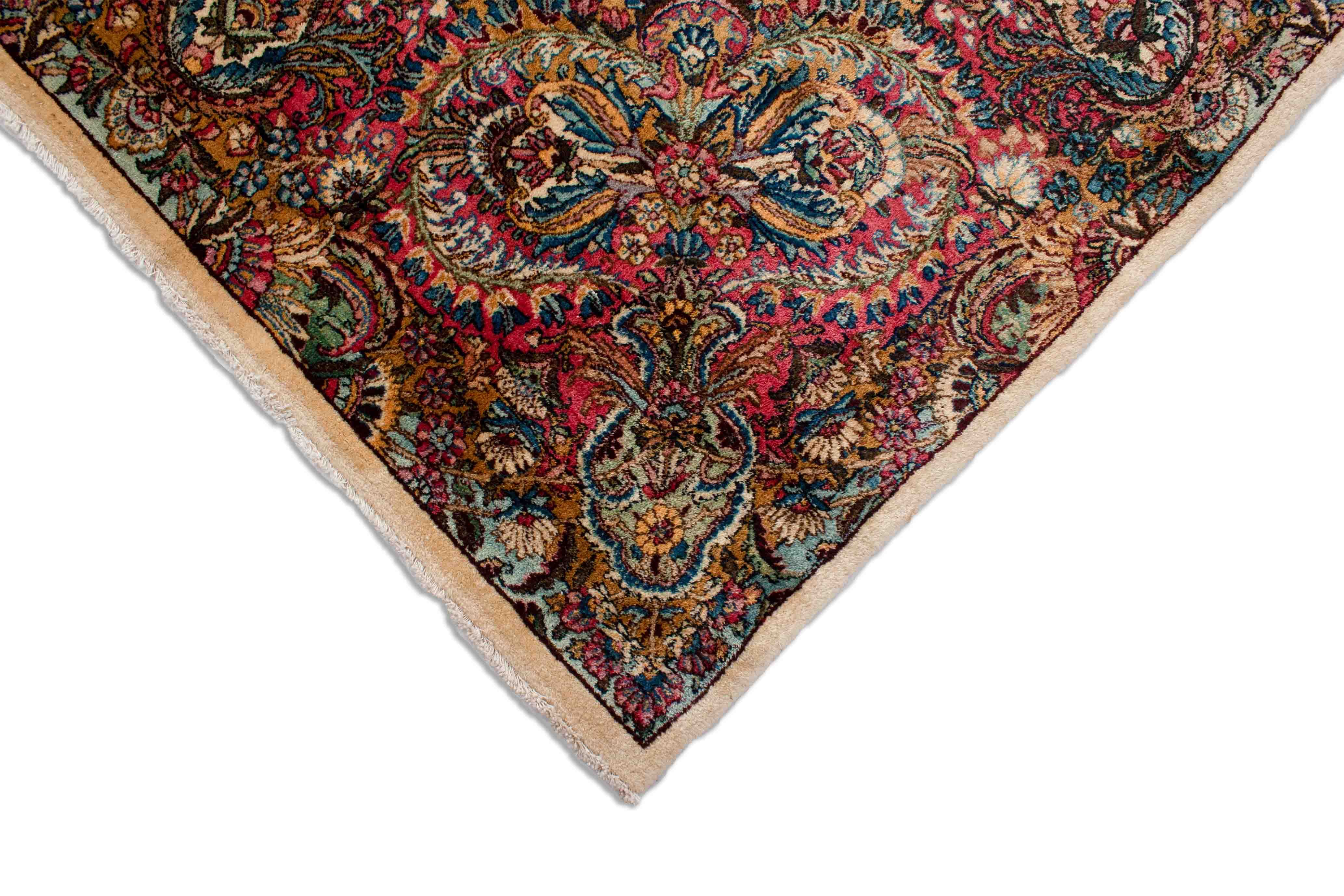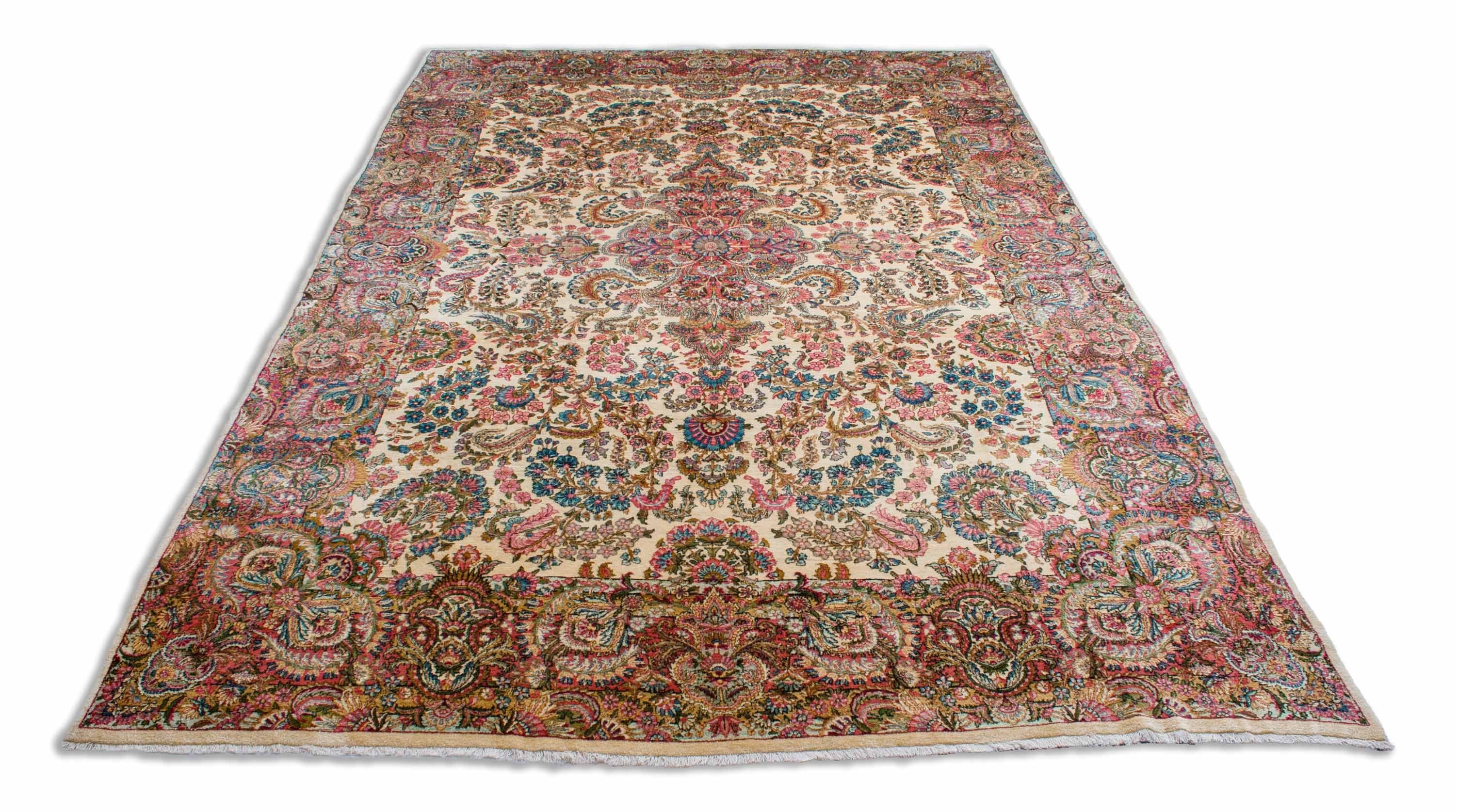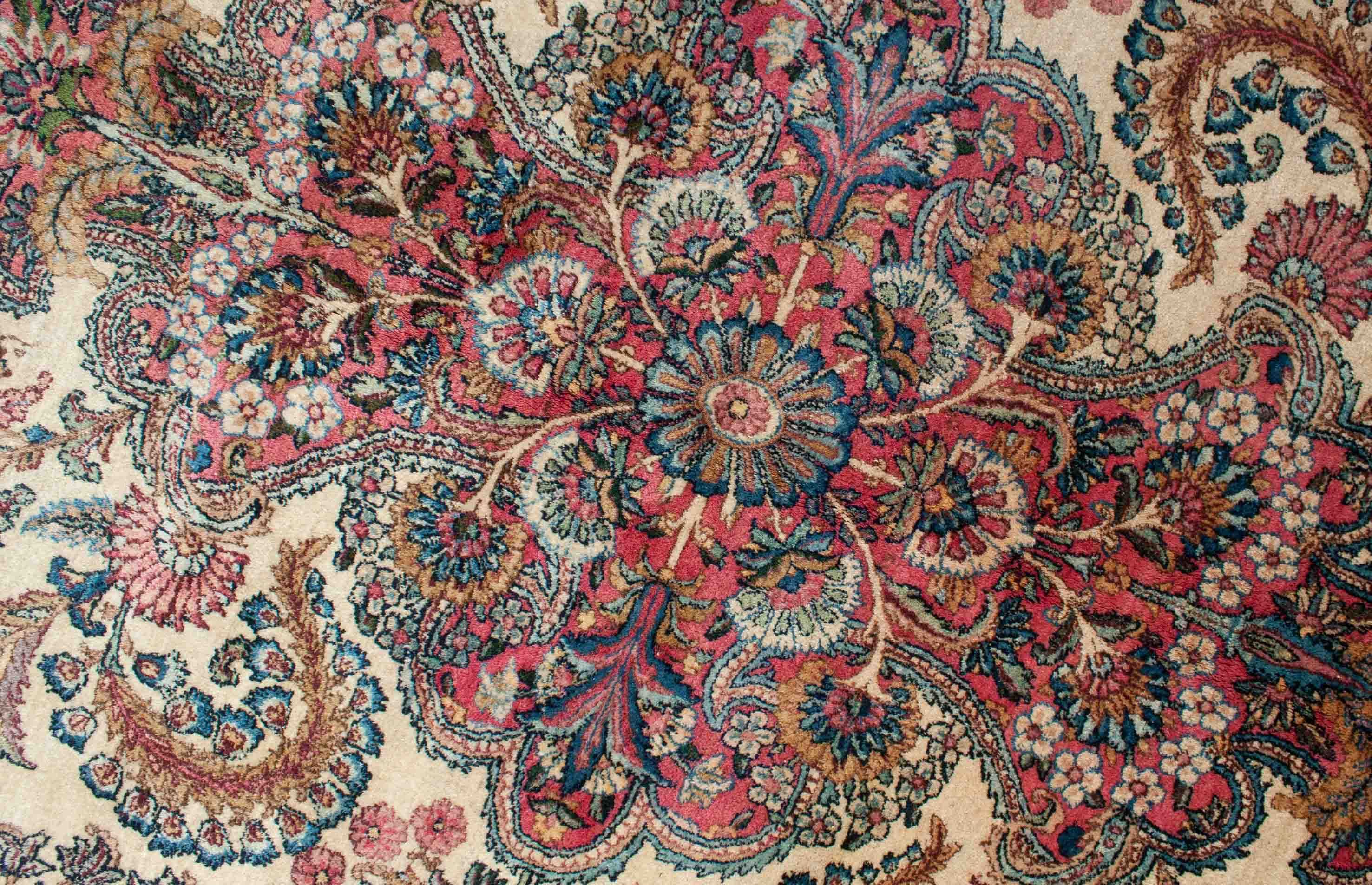 La ville Kerman (également Kirman) est situé dans le sud-est de la Perse à environ 2000 mètres de haut. Kerman est situé sur les anciennes routes caravanes et a une tradition séculaire dans l'art et le commerce. Kerman est mentionné dans le rapport de voyage Il Milione de Marco Polo. Les tapis de Kerman sont caractérisés par des motifs fins, des lignes de vent et des gradations de couleur douce. Les centuries classiques du 19e modèle sont souvent figuratifs. Des scènes de chasse et des animaux ont été présentés ainsi que des figures mythologiques ou des personnes historiques. La large palette de couleurs des tapis Kerman est enrichie en particulier par une variété de teintes rouges qui ont traditionnellement été obtenues de la tortue.