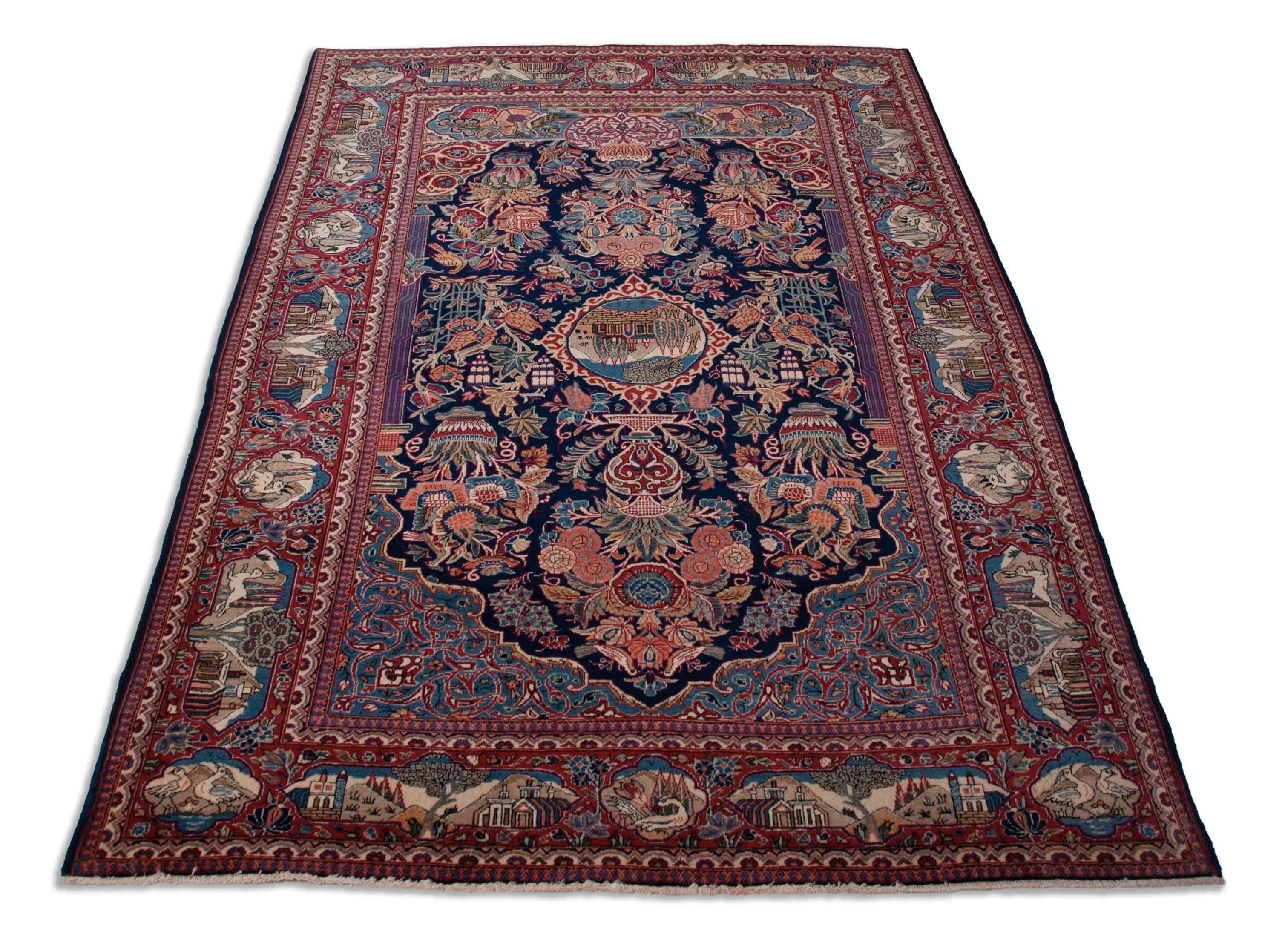 Floraler vieux Keshan, bleu foncé avec motif et médaillon