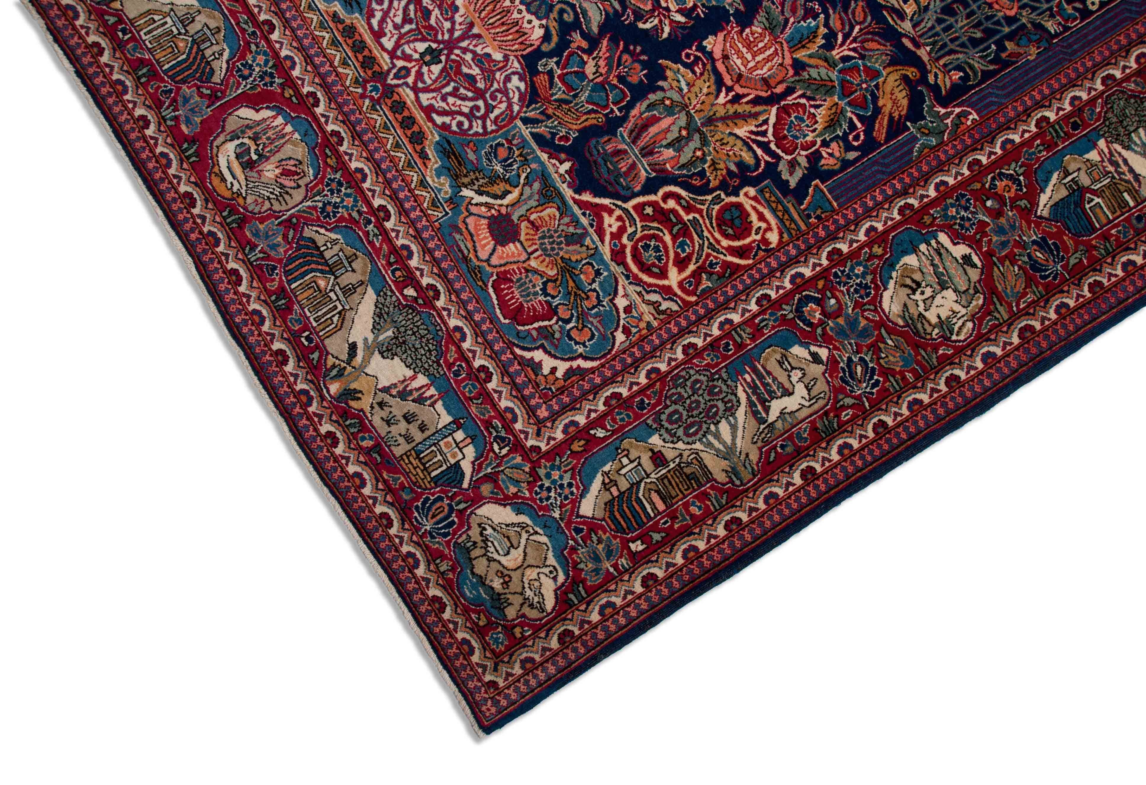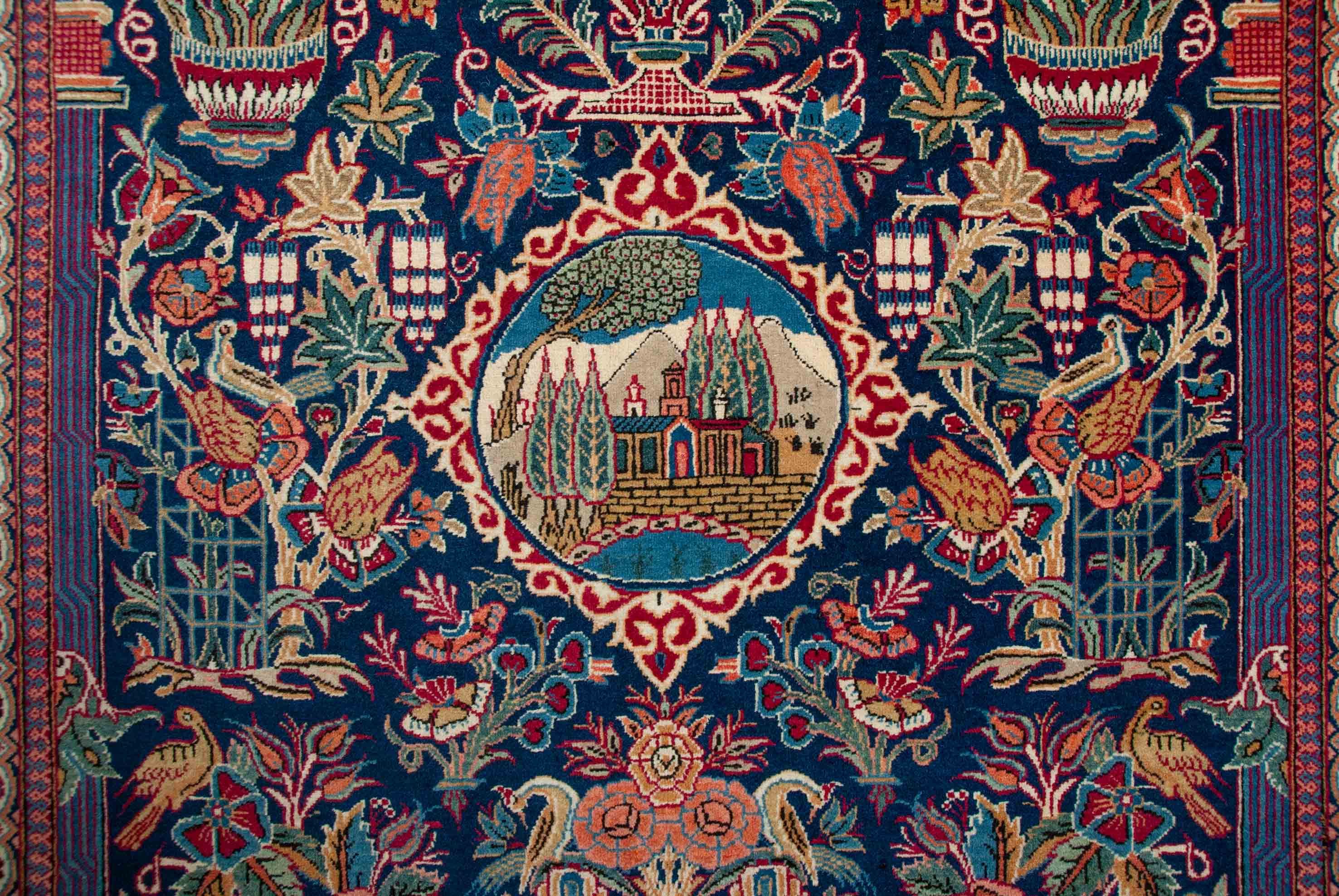Le fond de ce keshan est bleu foncé. Le bord est conçu dans les couleurs rouge foncé, beige et bleu foncé. Dans le centre vert clair les couleurs beige et bleu clair sont combinés.