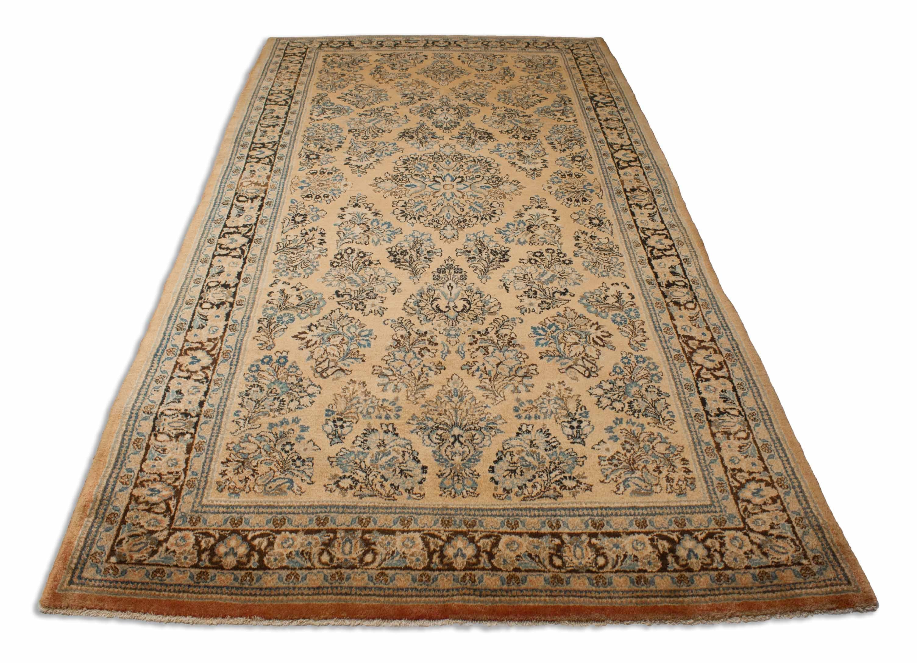 Ce tapis vient de Sarough (également Sarouk, Saruk ou Sarogh). Sarough est l'un des plus célèbres tapis iraniens. Situé dans la province ouest de Perse d'Aarak, il comprend les provinces Arak, Djozan, Ghiasabad, Mahal, Malayer, Mohajeran, Sultanabad et Wiss. Les échantillons de perser de tous les genres sont classés dans Sarough, en partie selon les instructions du client. Le Farahan voisin ainsi que ses propres dessins Sultanabad et le soi-disant Mir-i-Boteh-muster composé de motifs Paisley sont également réalisés avec préférence. La très bonne qualité de laine de la pile est typique pour ce genre de tapis; parce que la laine vierge vient des hautes terres persiennes. La chaîne de sous-vêtements et la trame se compose généralement de coton. Dans les tapis anciens et antiques, vous trouverez souvent une trame bleue. Les crêtes sont très fines et la pile est relativement élevée.