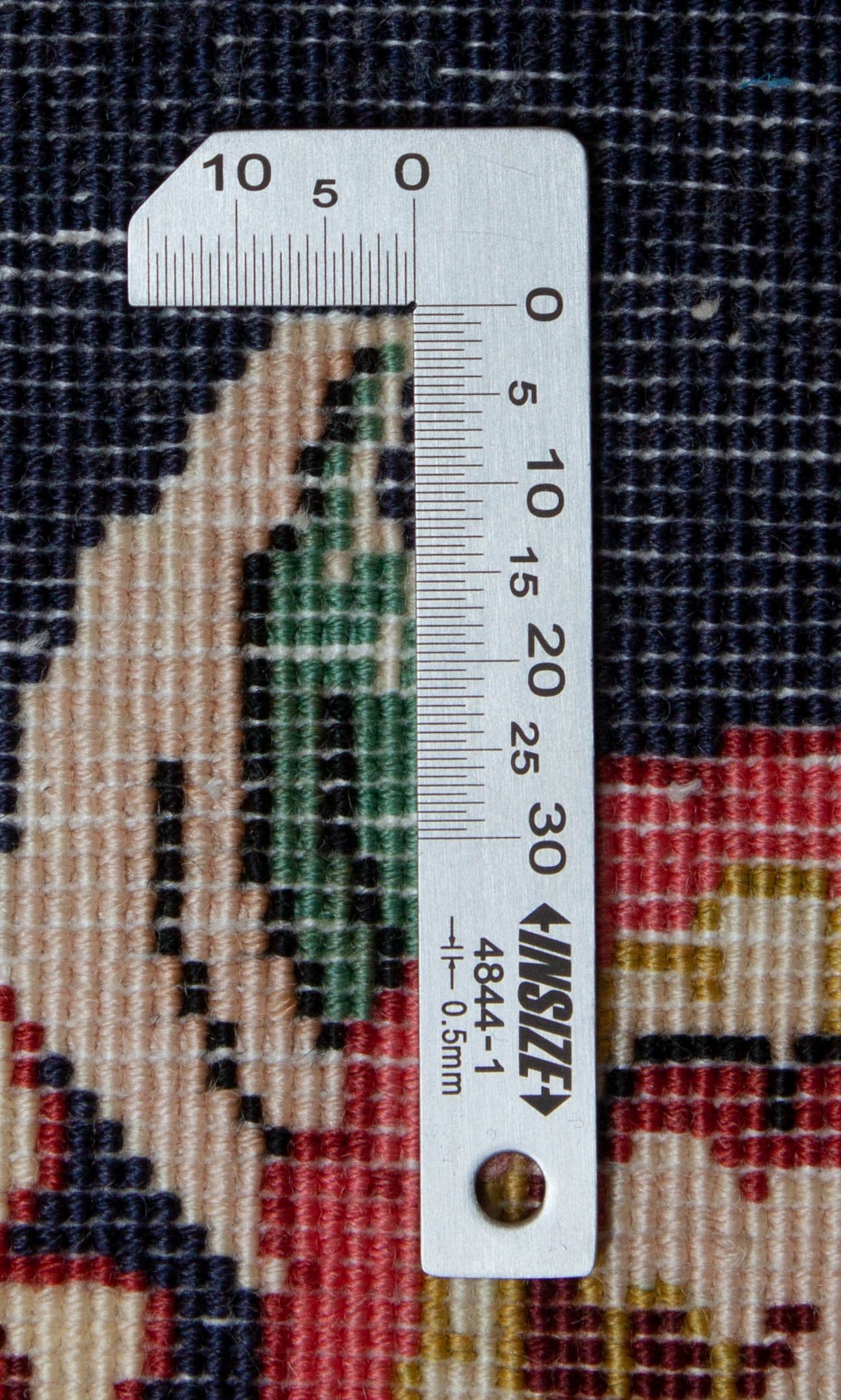 Le fond de cette Sarough est bleu foncé. Le bord est fait dans les couleurs vert clair et beige. Dans le centre rose les couleurs vert clair et beige sont combinés.