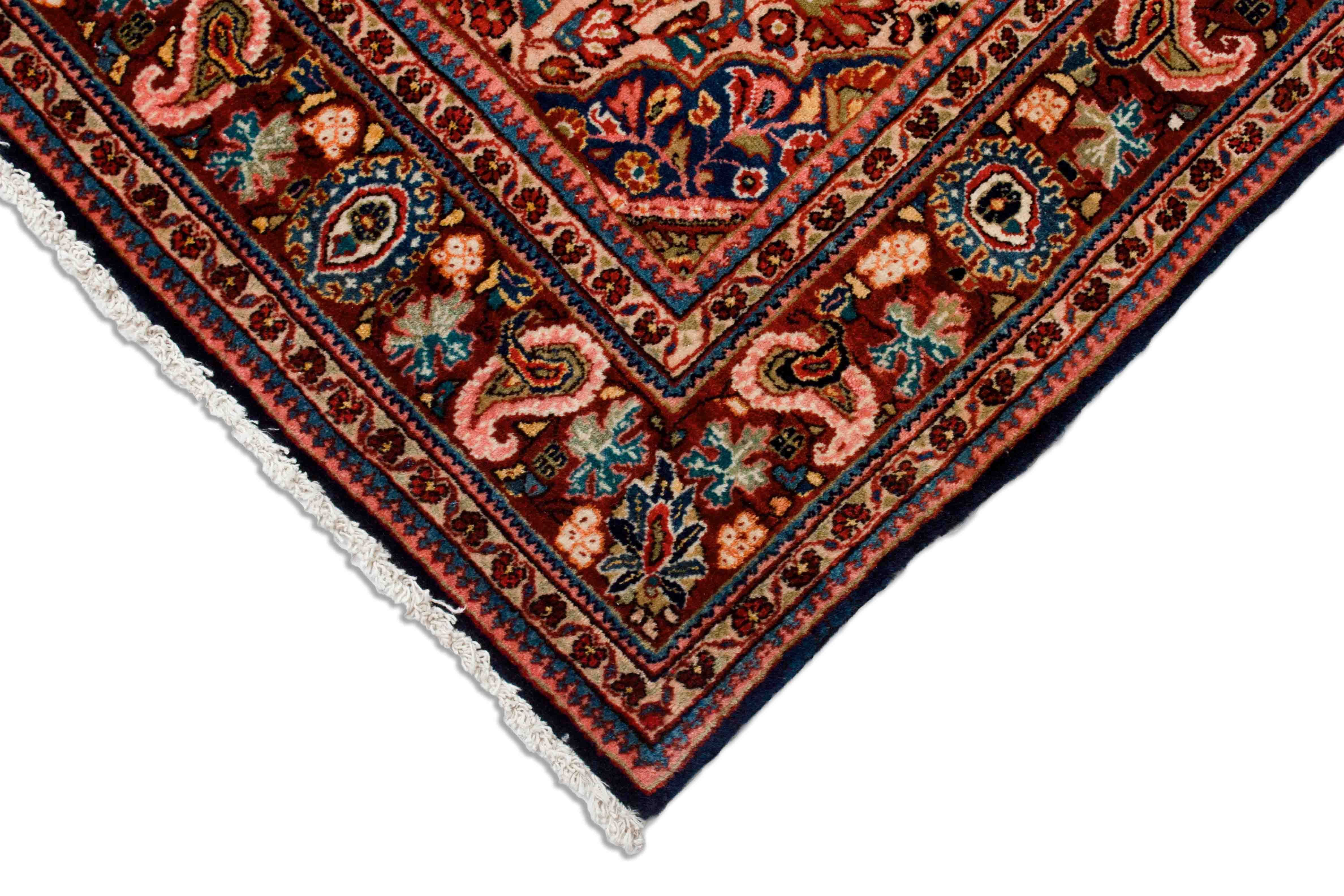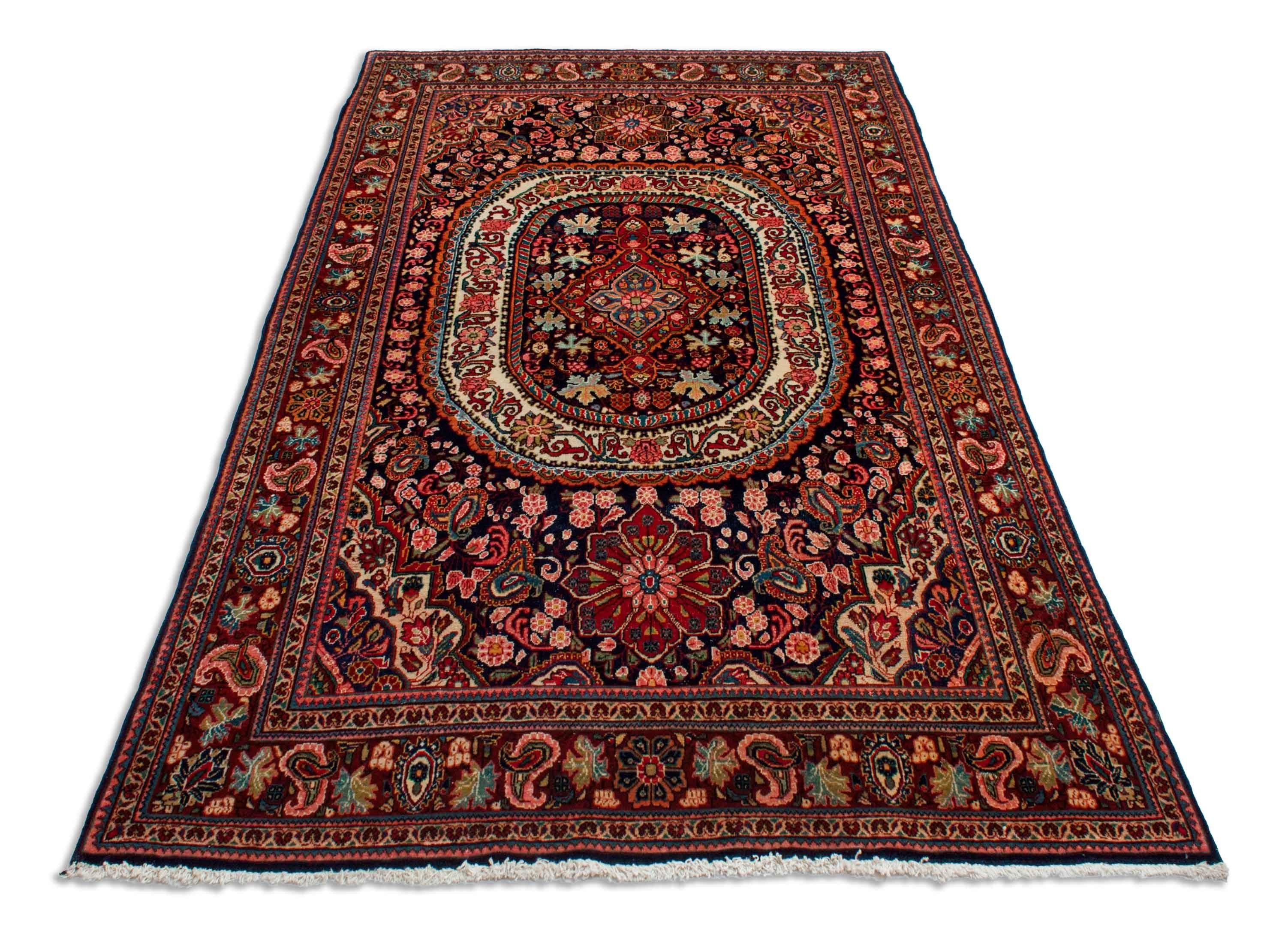 Le fond de cette Sarough est bleu foncé. Le bord est conçu dans les couleurs rouge foncé, bleu foncé et rose ancien. Dans le centre beige les couleurs bleu foncé et rouge clair sont combinés.