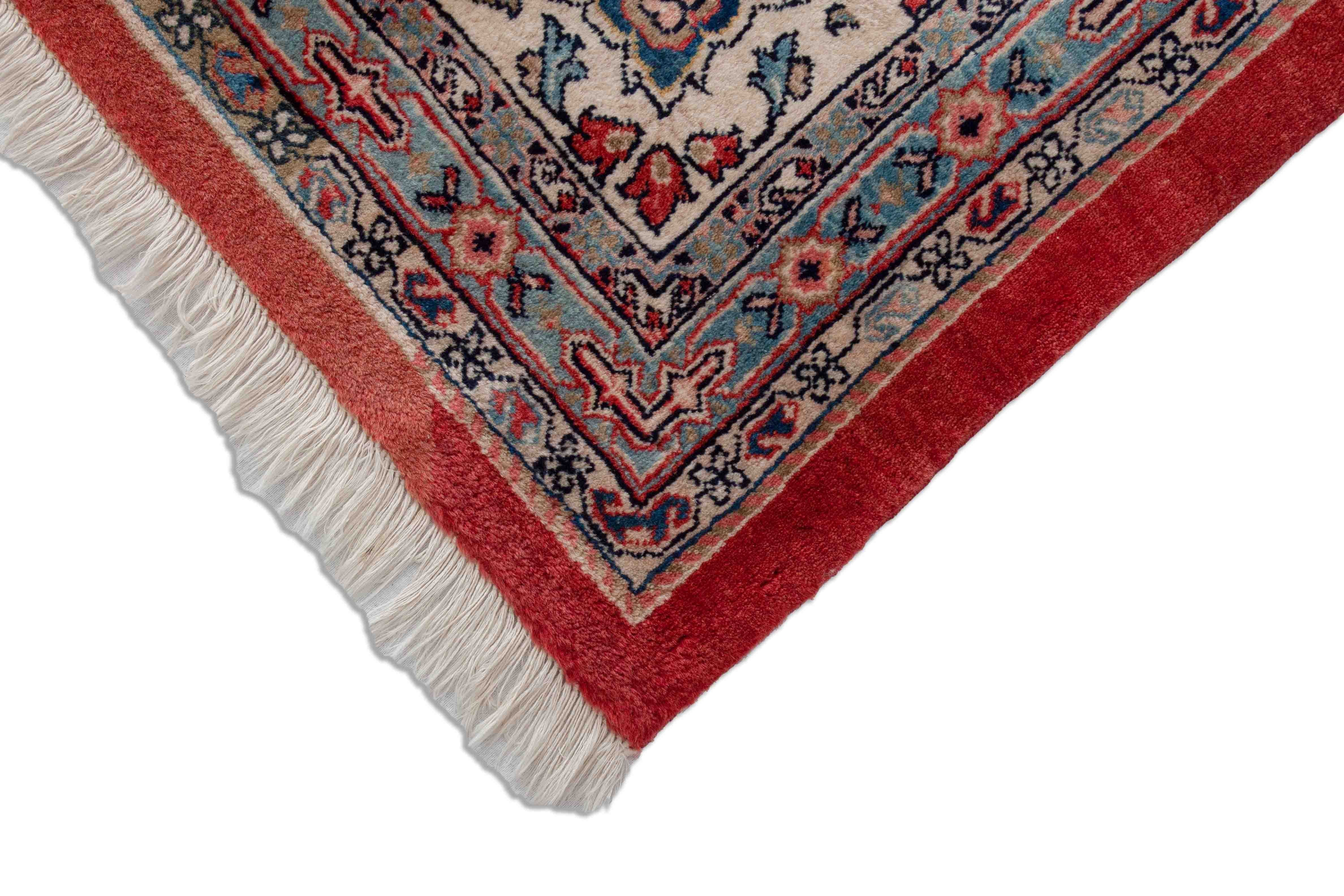 Ce tapis vient de Sarough (également Sarouk, Saruk ou Sarogh). Sarough est l'un des plus célèbres tapis iraniens. Situé dans la province ouest de Perse d'Aarak, il comprend les provinces Arak, Djozan, Ghiasabad, Mahal, Malayer, Mohajeran, Sultanabad et Wiss. Les échantillons de perser de tous les genres sont classés dans Sarough, en partie selon les instructions du client. Le Farahan voisin ainsi que ses propres dessins Sultanabad et le soi-disant Mir-i-Boteh-muster composé de motifs Paisley sont également réalisés avec préférence. La très bonne qualité de laine de la pile est typique pour ce genre de tapis; parce que la laine vierge vient des hautes terres persiennes. La chaîne de sous-vêtements et la trame se compose généralement de coton. Dans les tapis anciens et antiques, vous trouverez souvent une trame bleue. Les crêtes sont très fines et la pile est relativement élevée. Ce vieux Sarough. environ 60 ans et un vrai amoureux.