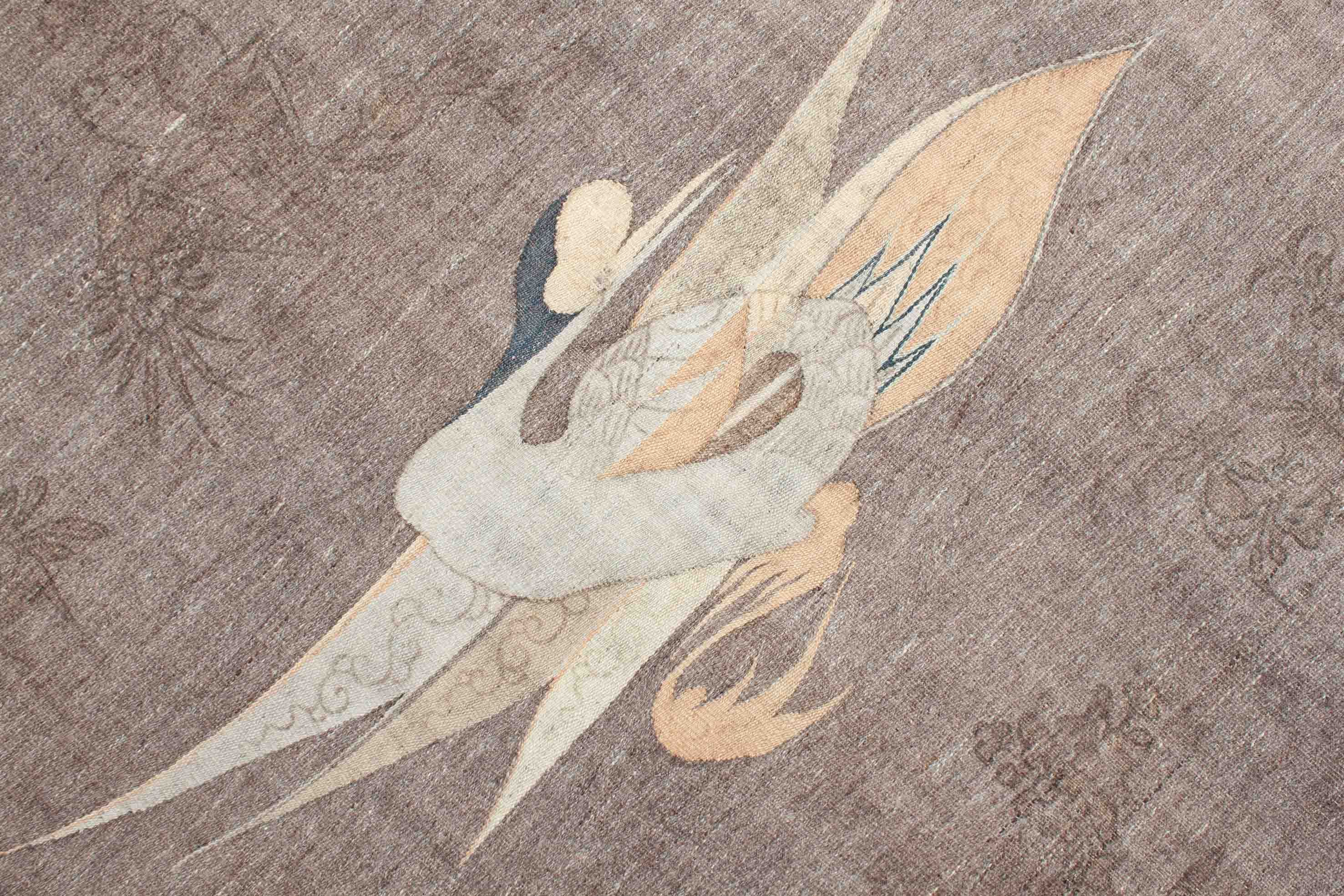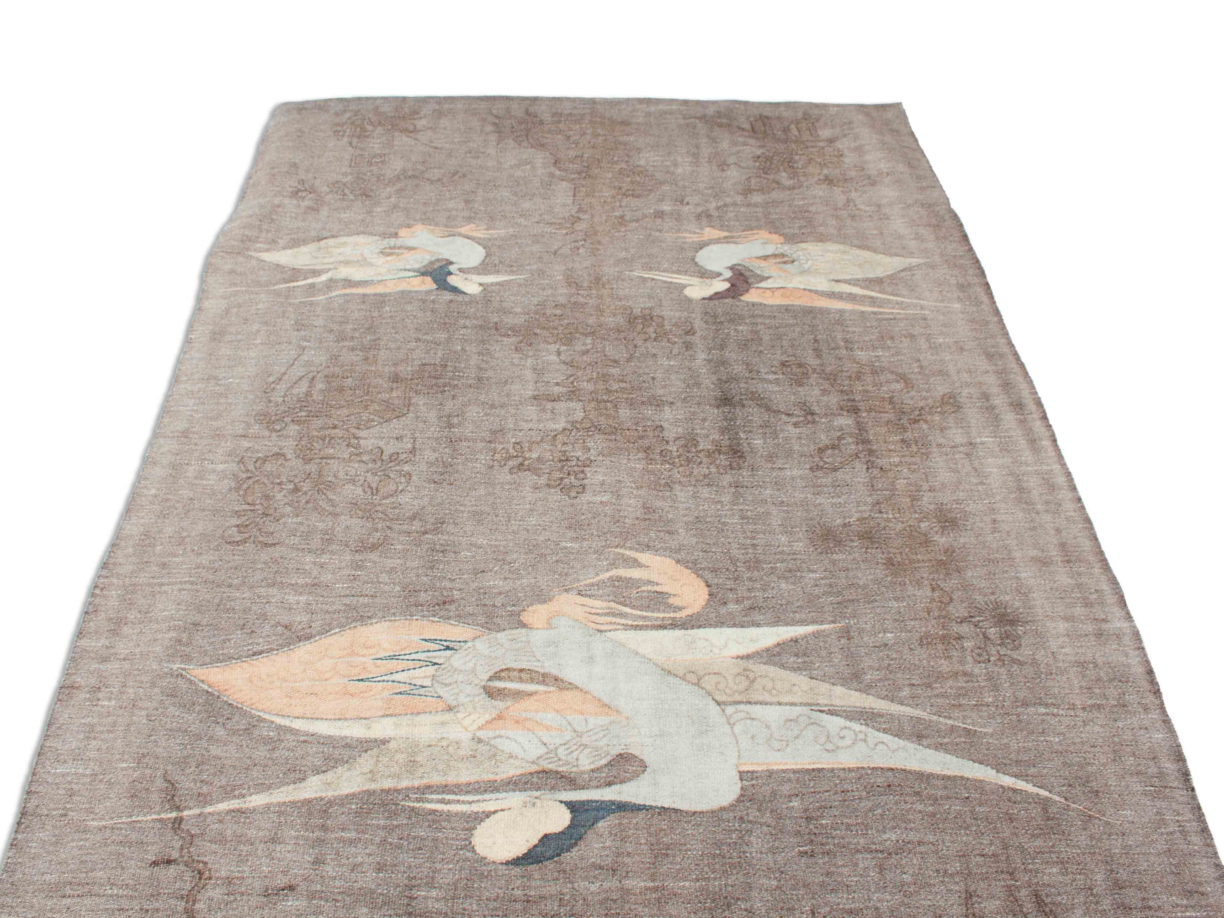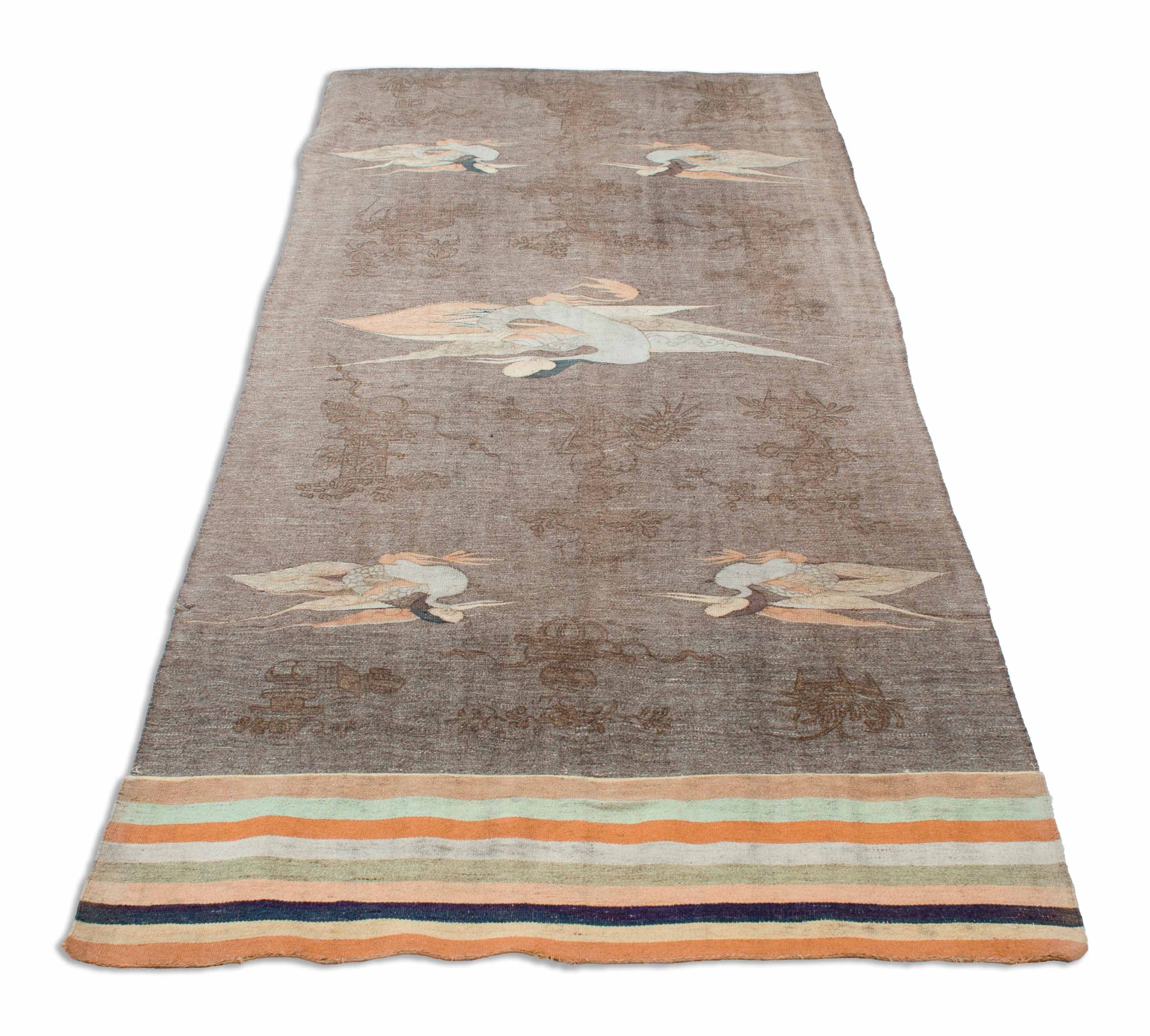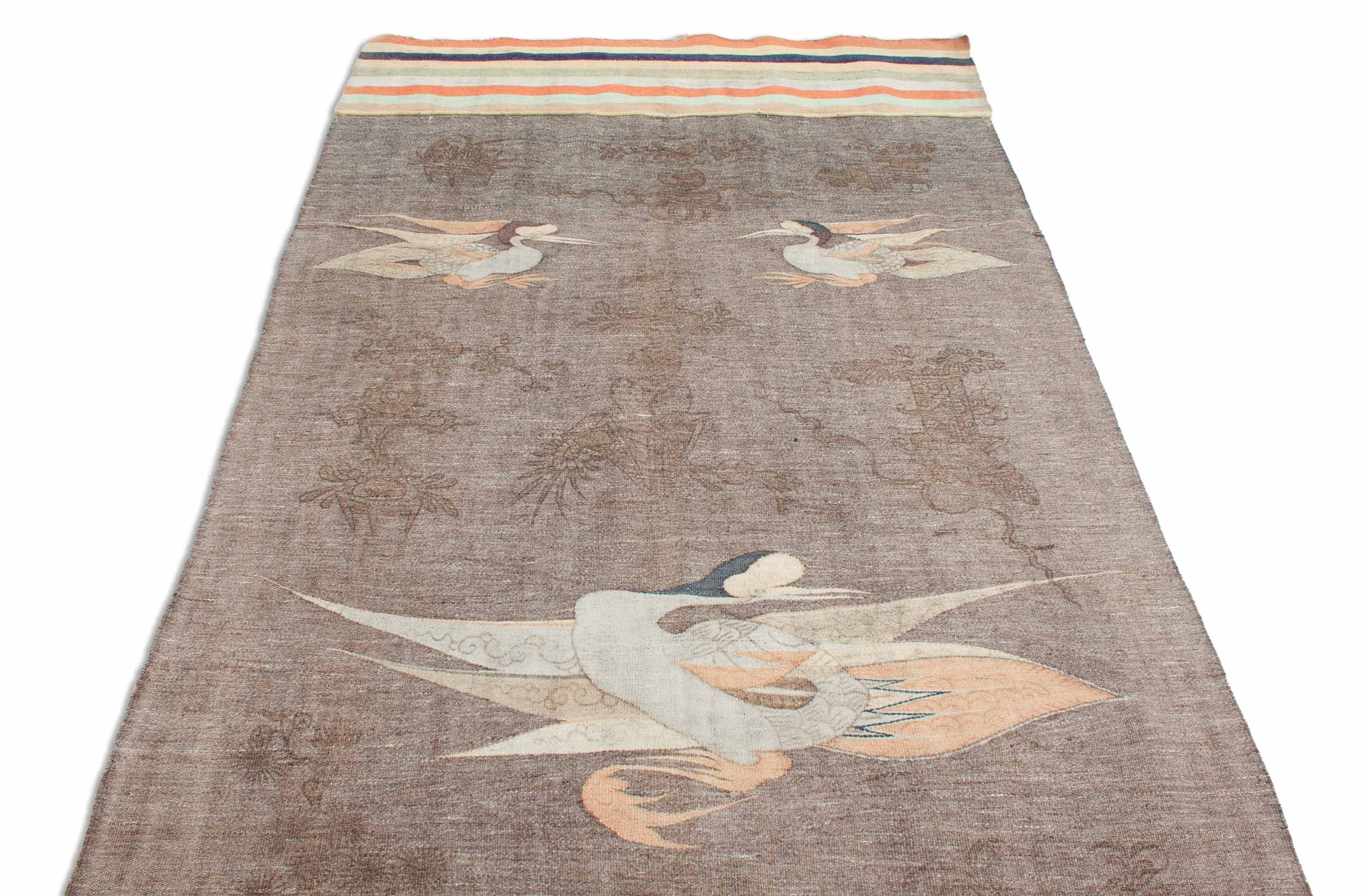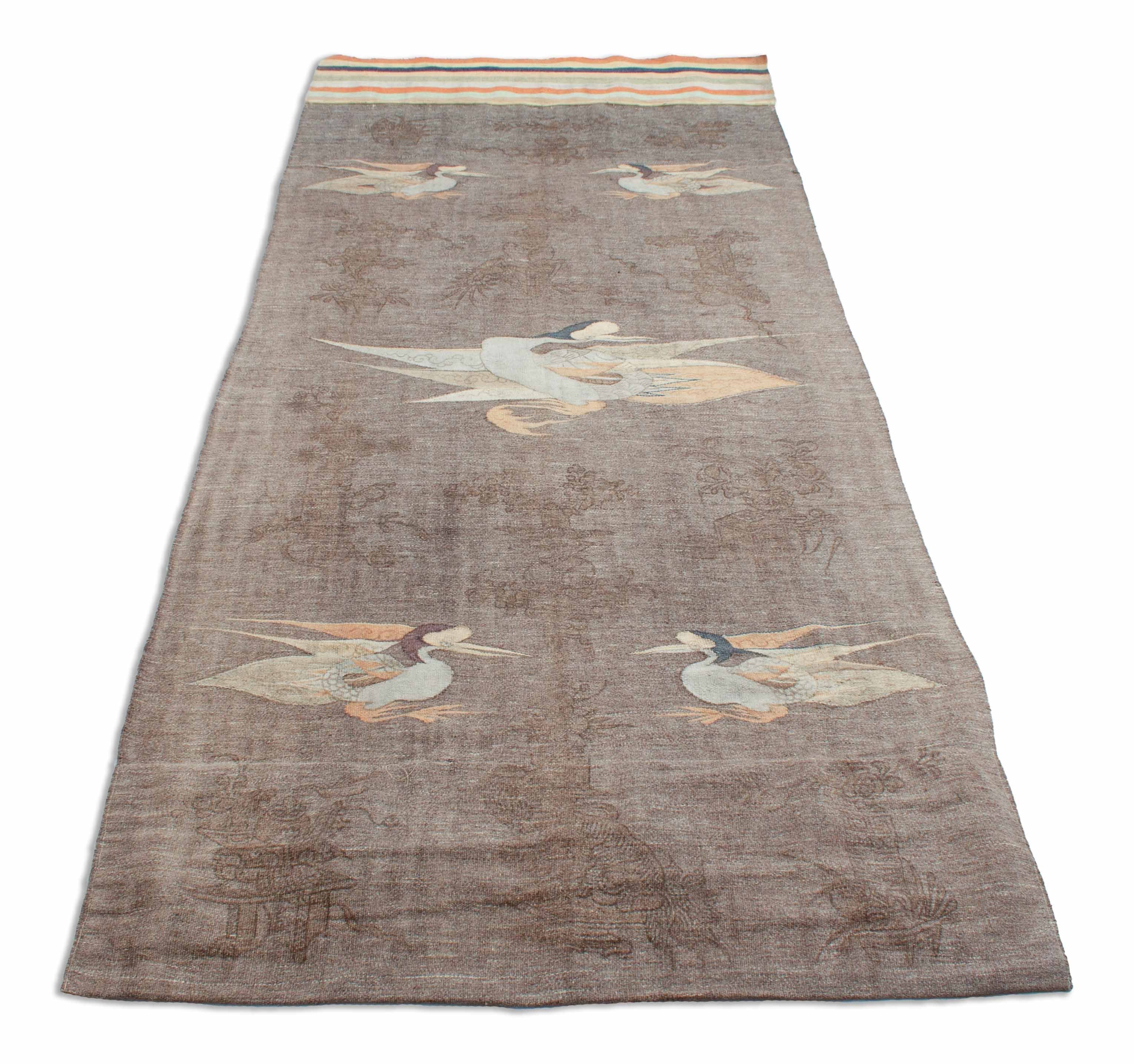 Les Kelims sont toujours tissés à la main et ne sont constitués que de fils de distorsion et de tir, donc n'ont pas une pile épaisse, orientée vers le haut. Les Kelims ont le même motif des deux côtés et sont donc utilisables des deux côtés. Le motif est créé par les fils de trame colorés qui sont tissés dans les fils de distorsion. Ce Kelim japonais antique est un objet de collection. Il est environ 110 ans et donc une pièce vraiment spéciale. Les tapis antiques, tels que ce Kelim japonais, jouissent toujours d'une grande popularité et sont vendus aux meilleurs prix par des maisons d'enchères de renom. Ces anciens Kelim japonais décorent un total de 4 petits canards dans les coins et un plus grand au milieu. À l'extrémité supérieure, la pièce est sertie de bandes colorées. Très discret ce Kelim est dessiné en brun foncé sur le fond gris, avec des motifs asiatiques typiques.