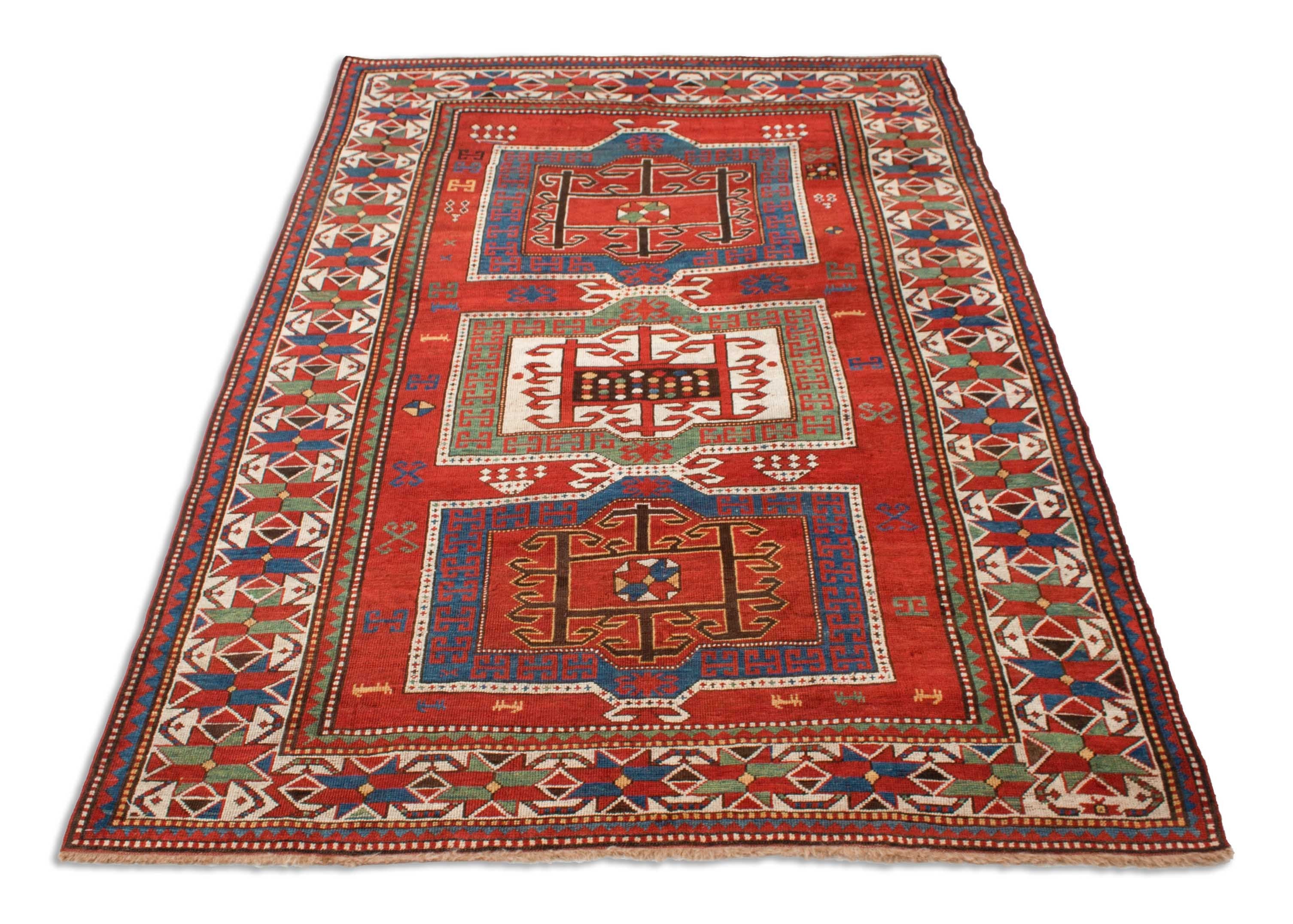 The Kazak Les tapis appartiennent au groupe de tapis caucasiens. Dans le Caucase depuis la fin du XVIIIe siècle, des tapis ont été fabriqués. Les motifs géométriques abstraits sont caractéristiques dans les couleurs primaires. Typiquement, les motifs géométriques et rares aussi floraux sont présentés en couleurs contrastées et intenses. Au 19e siècle, une proportion considérable des tapis produits principalement dans les villages ont été exportés vers l'Occident sous contrôle russe. Ce Kazak antique est un objet de collection. Il est environ 125 ans et donc une pièce vraiment spéciale. Les tapis antiques, comme ce Kazak, continuent à profiter d'une grande popularité et sont vendus aux meilleurs prix par des maisons d'enchères de renom.
