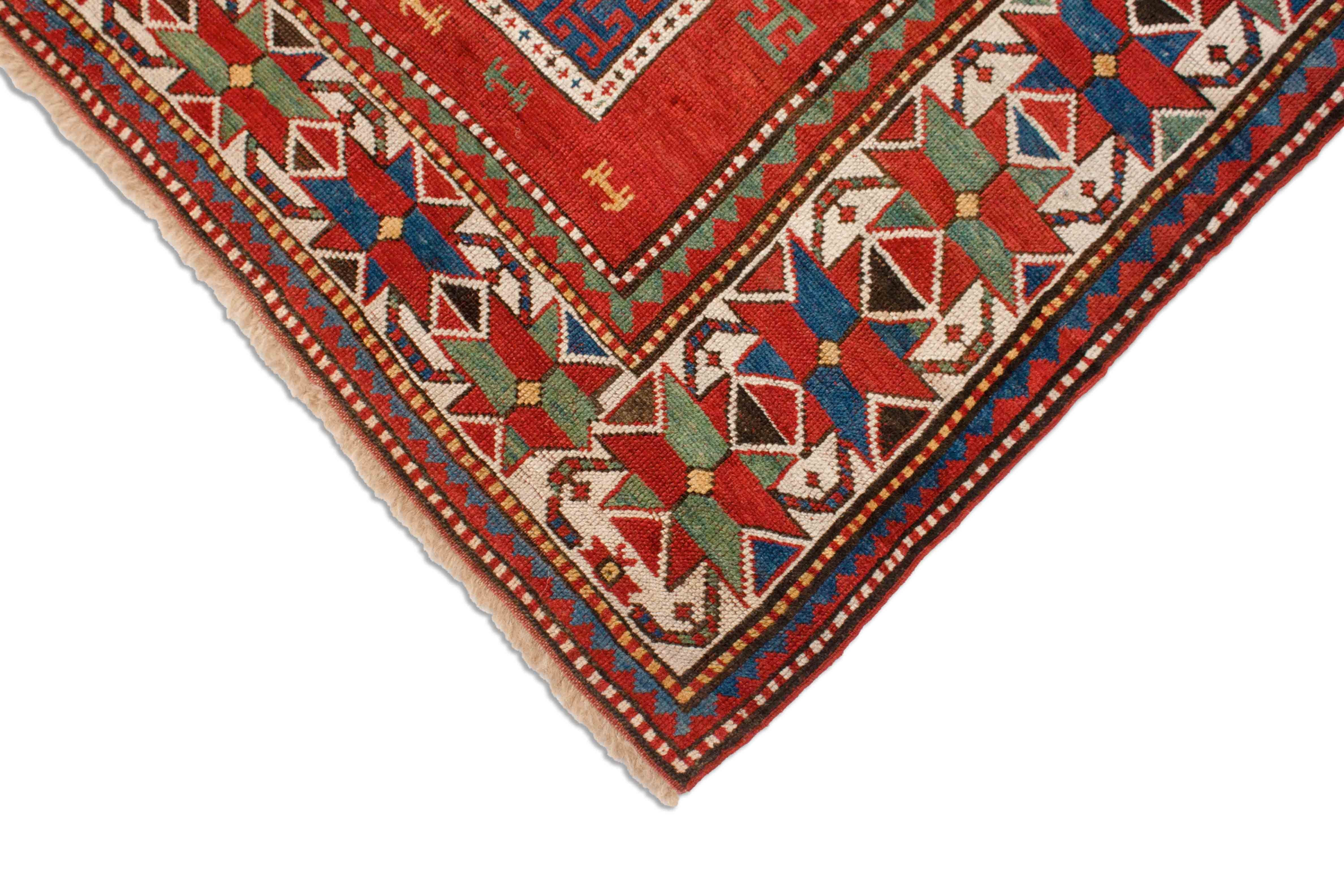 Dans le motif de ce cazak, le Outer : Les roughts sont un rhombus debout sur une pointe, dont les quatre côtés identiques peuvent être serrés, matelassés ou accrochés. Le prédateur est l'une des formes de base les plus anciennes dans le tapis oriental. Il a un sens symbolique dans le monde islamique : il reflète symboliquement l'immortalité de l'âme. Il est donc très courant d'être trouvé comme un motif de remplissage.