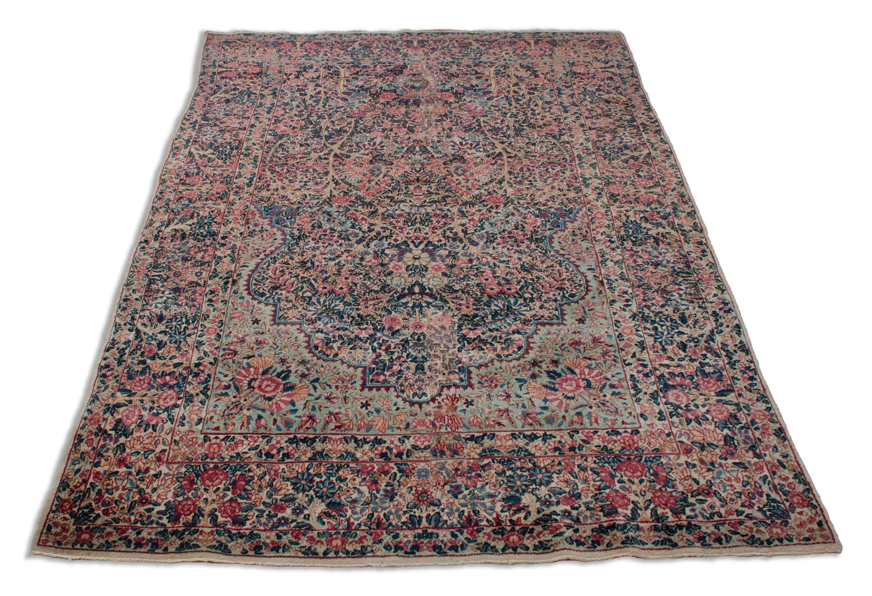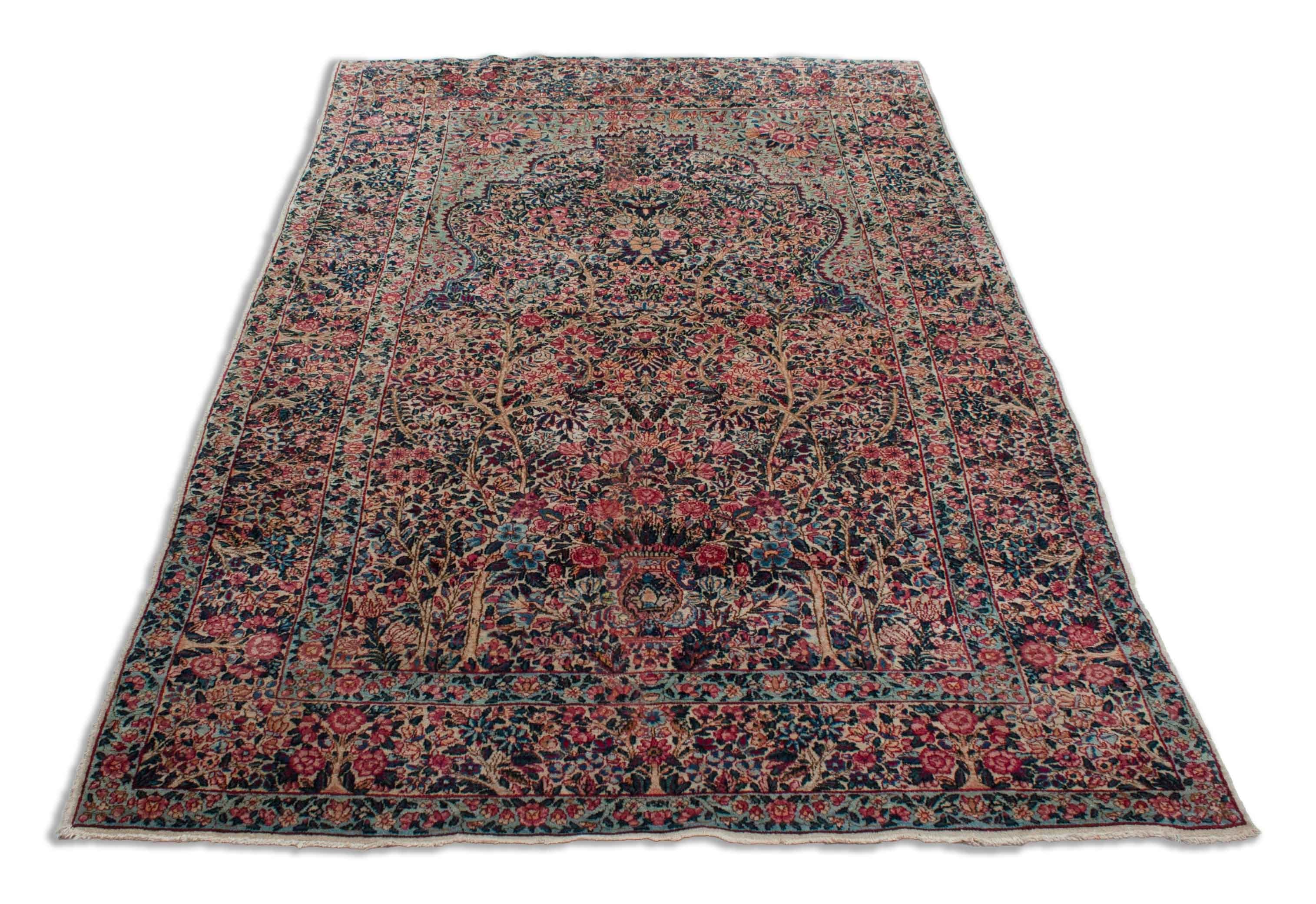 La ville Kerman (également Kirman) est situé dans le sud-est de la Perse à environ 2000 mètres de haut. Kerman est situé sur les anciennes routes caravanes et a une tradition séculaire dans l'art et le commerce. Kerman est mentionné dans le rapport de voyage Il Milione de Marco Polo. Les tapis de Kerman sont caractérisés par des motifs fins, des lignes de vent et des gradations de couleur douce. Les centuries classiques du 19e modèle sont souvent figuratifs. Des scènes de chasse et des animaux ont été présentés ainsi que des figures mythologiques ou des personnes historiques. La large palette de couleurs des tapis Kerman est enrichie en particulier par une variété de teintes rouges qui ont traditionnellement été obtenues de la tortue. Ce Kerman antique est un objet de collection. Il est environ 90 ans et donc une pièce vraiment spéciale. Les tapis antiques, comme ce Kerman, bénéficient toujours d'une grande popularité et sont vendus aux meilleurs prix par des maisons d'enchères de renom.