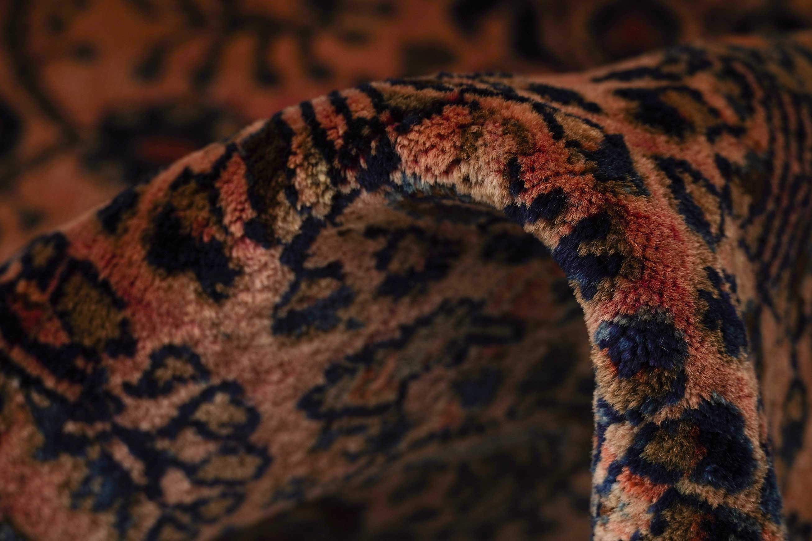 Dieser Teppich stammt aus Sarough (auch Sarouk, Saruk oder Sarogh). Sarough zählt zu den bekanntesten Teppich-Knüpfgebieten des Irans. Gelegen in der westpersischen Provinz Aarak umfasst es die Provinienzen Arak, Djozan, Ghiasabad, Mahal, Malayer, Mohajeran, Sultanabad und Wiss. In Sarough werden Persermuster aller Gattungen, zum Teil auch nach Angaben der Besteller geknüpft. Mit Vorliebe werden auch die benachbarten Farahan sowie die eigenen Sultanabad Designs und das aus Paisley Motiven bestehende, sogenannte Mir-i-Boteh-Muster realisiert. Typisch für diese Teppichgattung ist die sehr gute Wollqualität des Flors; denn die Schurwolle stammt aus dem persischen Hochland. Das Untergewebe – Kette und Schuss – besteht allerdings in der Regel aus Baumwolle. Bei alten und antiken Teppichen findet man häufig einen blauen Schussfaden. Die Knüpfungen sind sehr fein und der Flor relativ hoch. Dieser antike Sarough ist ein Sammlerstück. Er ist rund 100 Jahre alt und schon deswegen ein wirklich besonderes Stück. Antike Teppiche, wie dieser Sarough, erfreuen sich nach wie vor großer Beliebtheit und werden zu Höchstpreisen von renommierten Auktionshäusern versteigert.