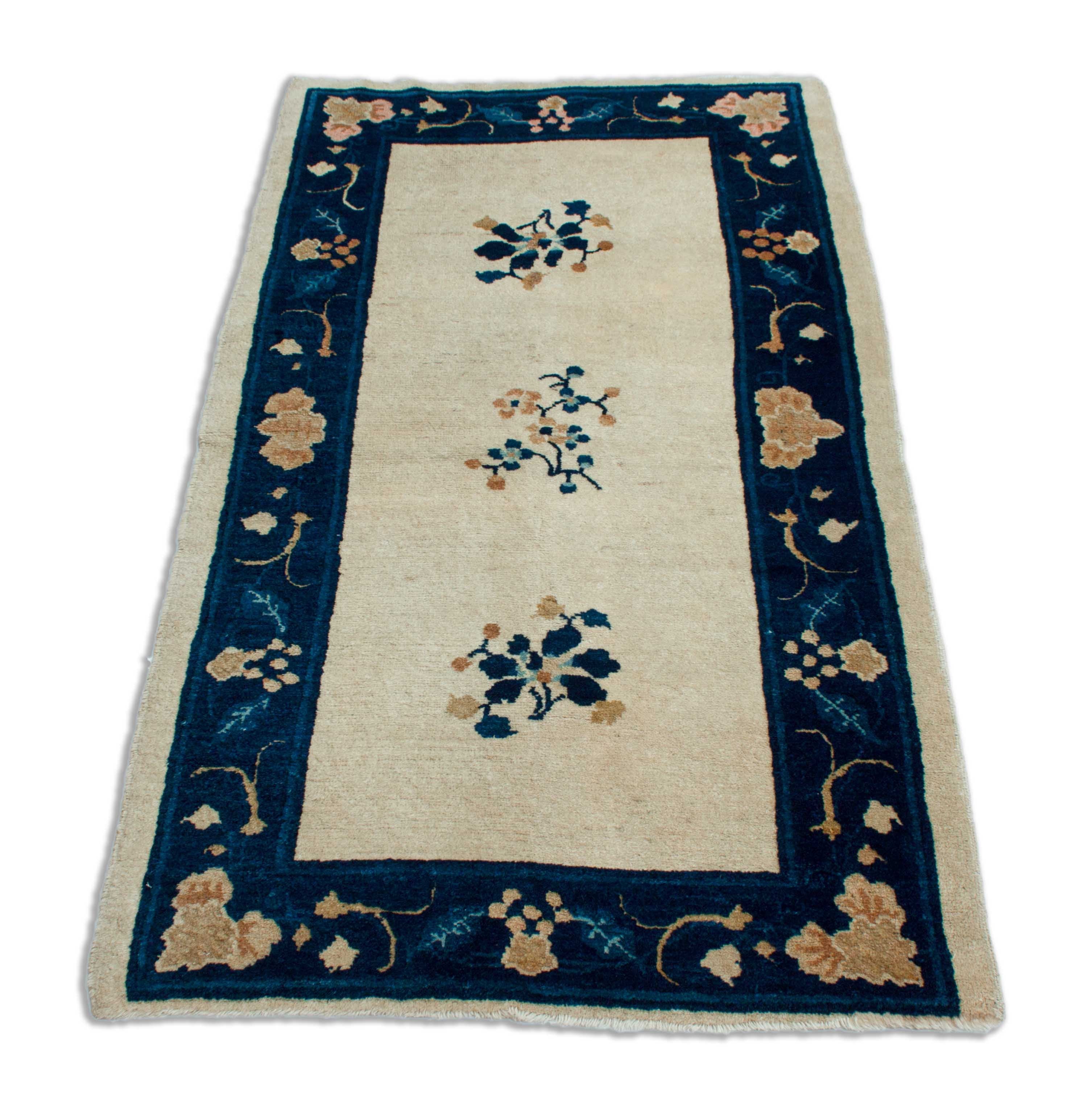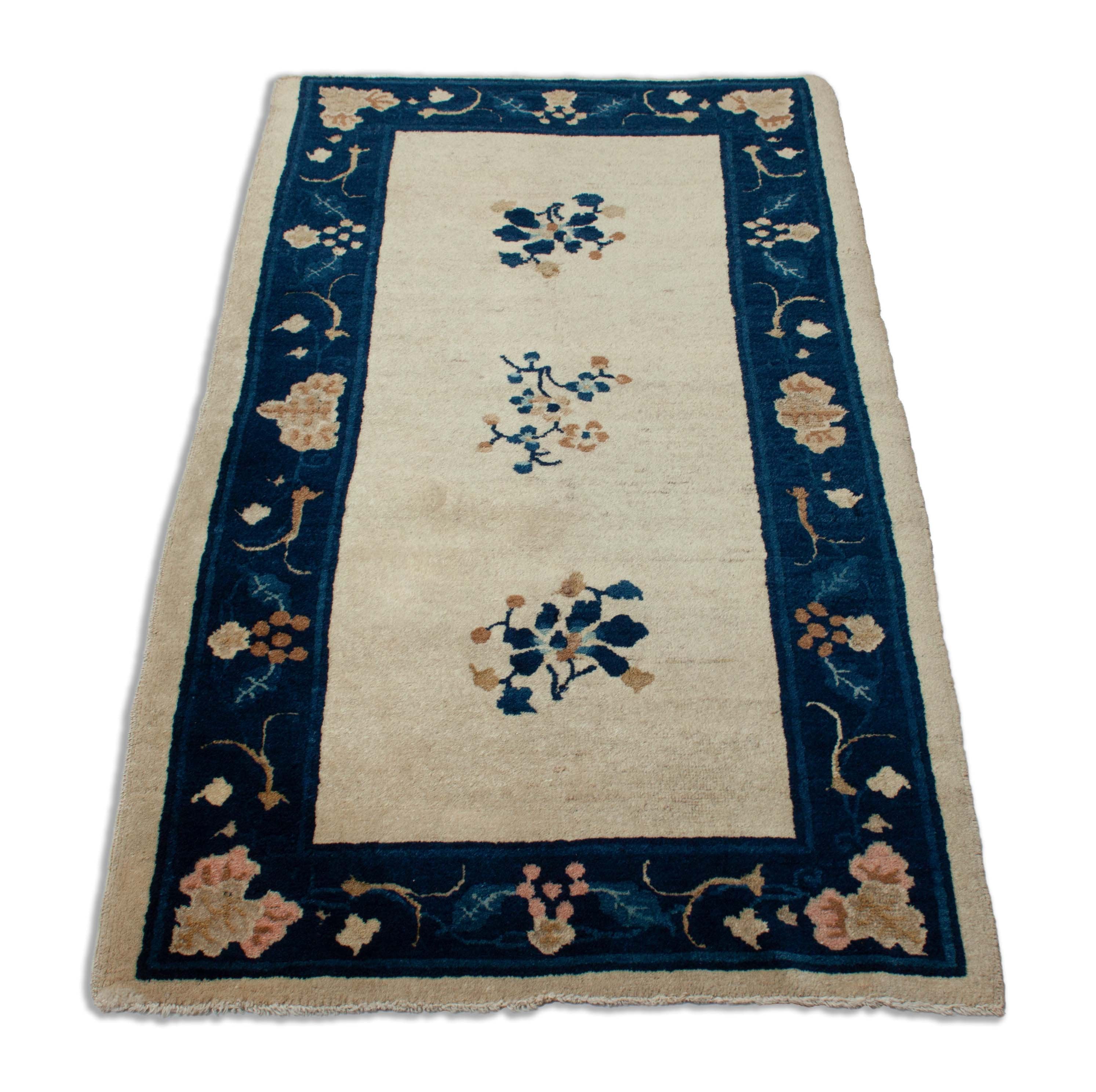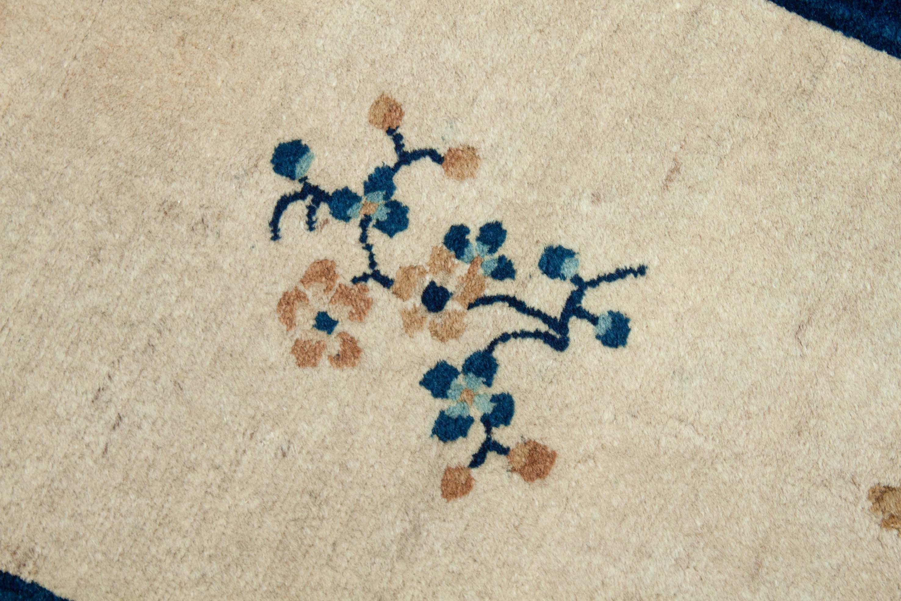 L'arrière-plan de ce tapis chinois d'importation américaine est beige. Le bord est conçu dans les couleurs beige et bleu foncé.