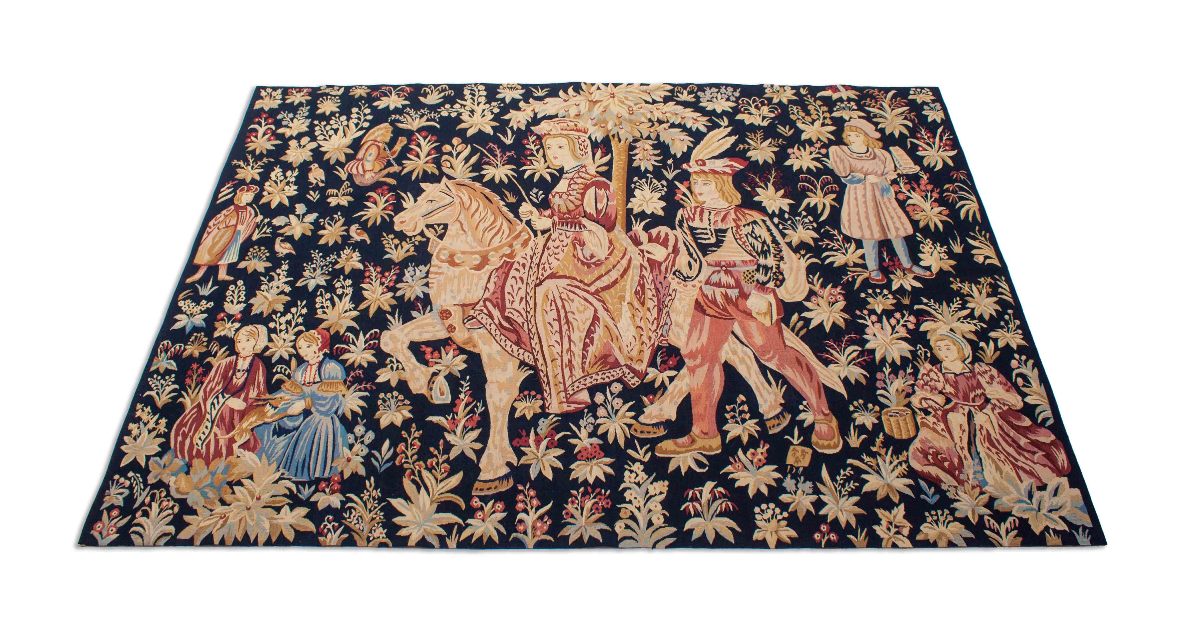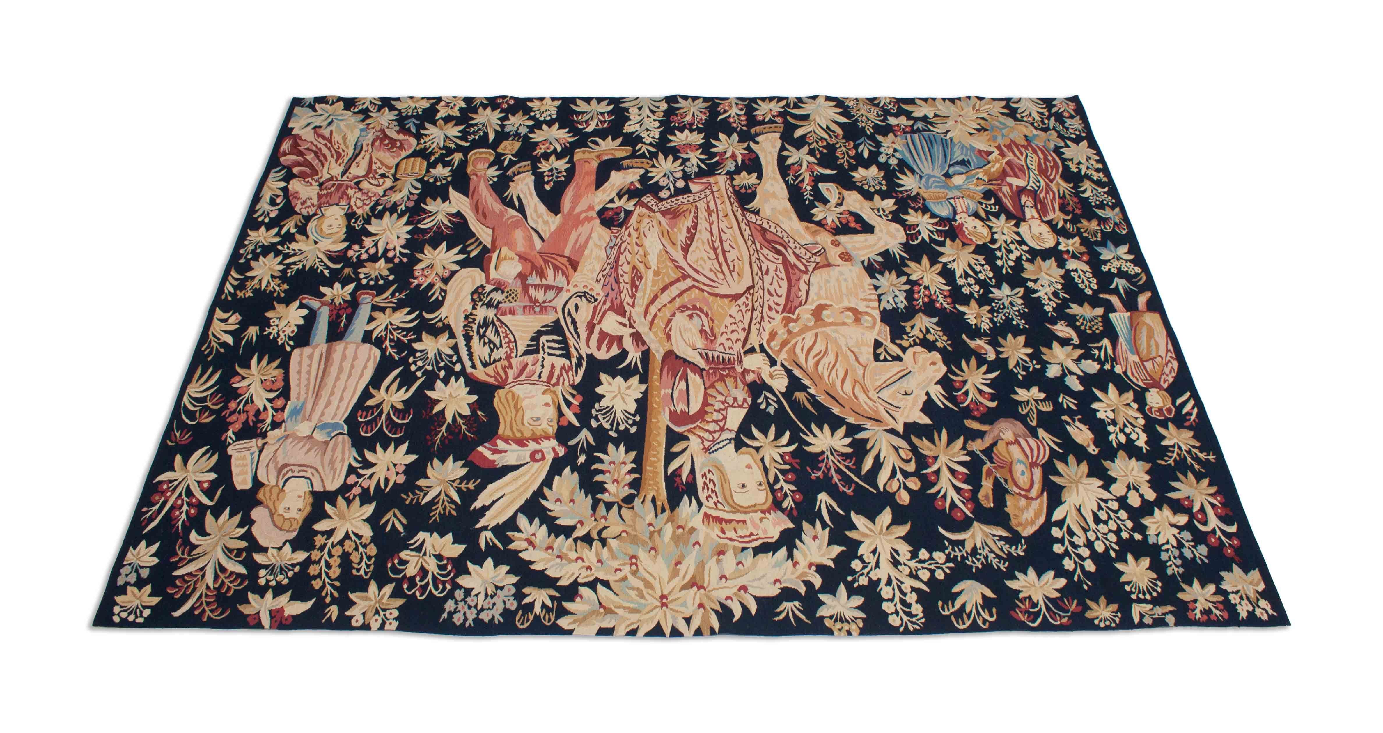 L'arrière-plan de cette Aubusson est bleu foncé.